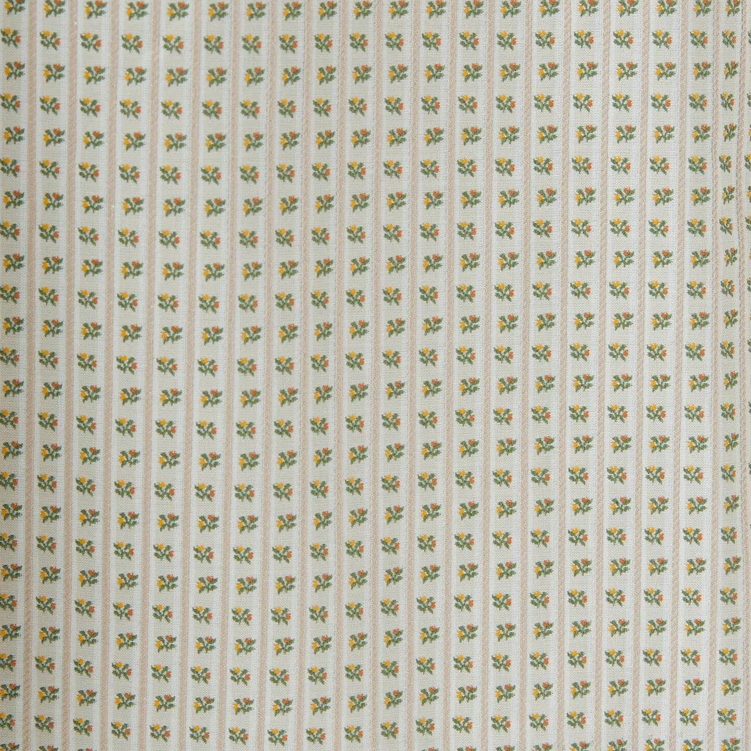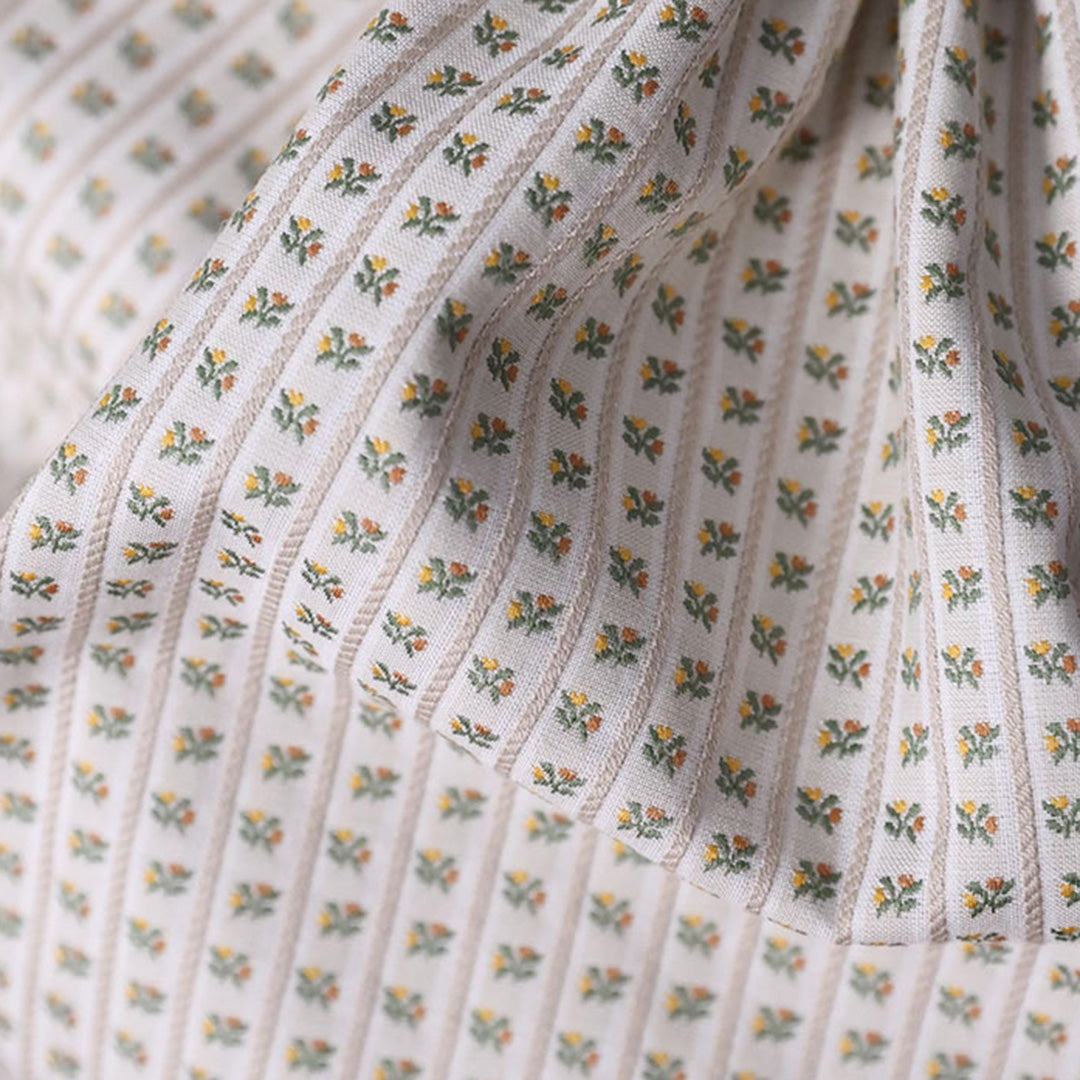 生地はイタリアの老舗メーカーvasino社製。子供部屋の壁紙やカーテンをイメージして選びました。小さな花が並んだストライプは立体感と高級感があるジャガード織。織糸の光沢感が華やかです。