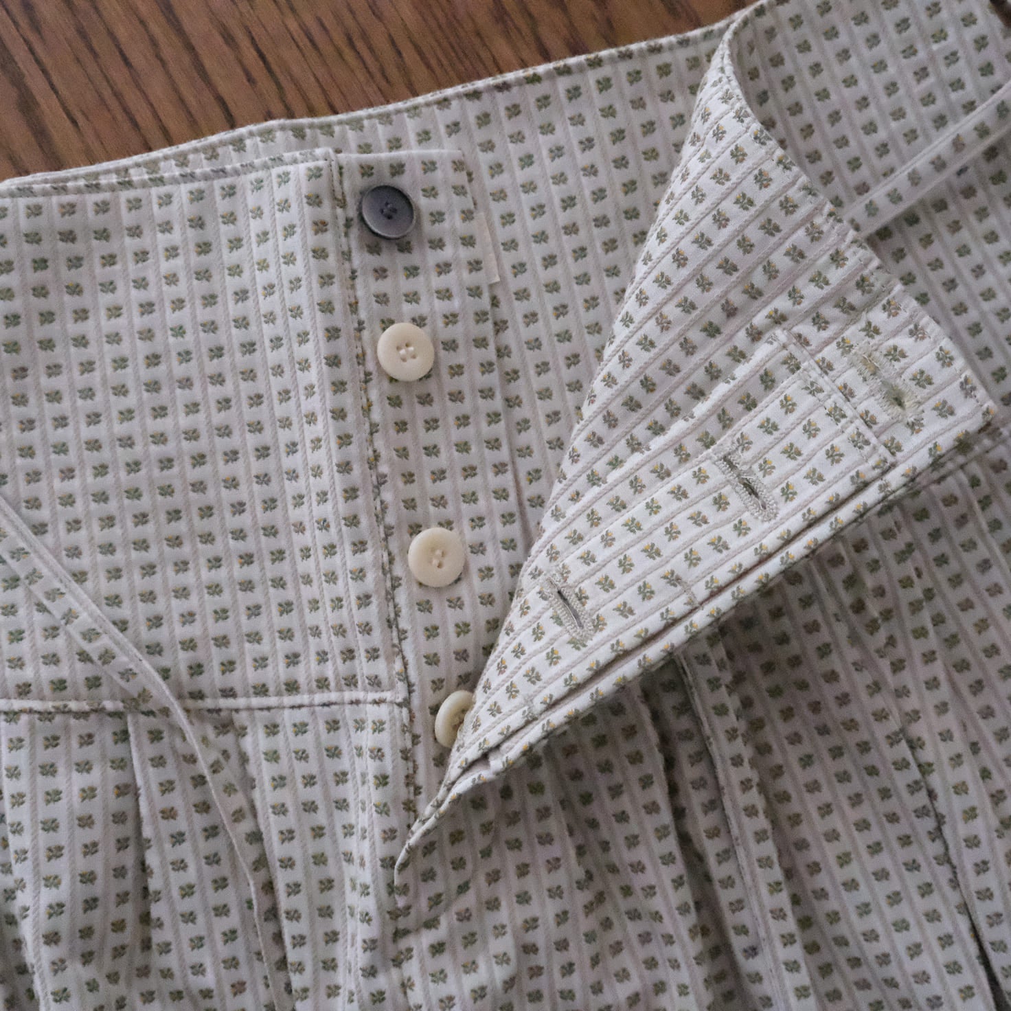 ウエストはボタン開閉式。ボタンが4つ並び、一番上のものだけ見えるデザインです。