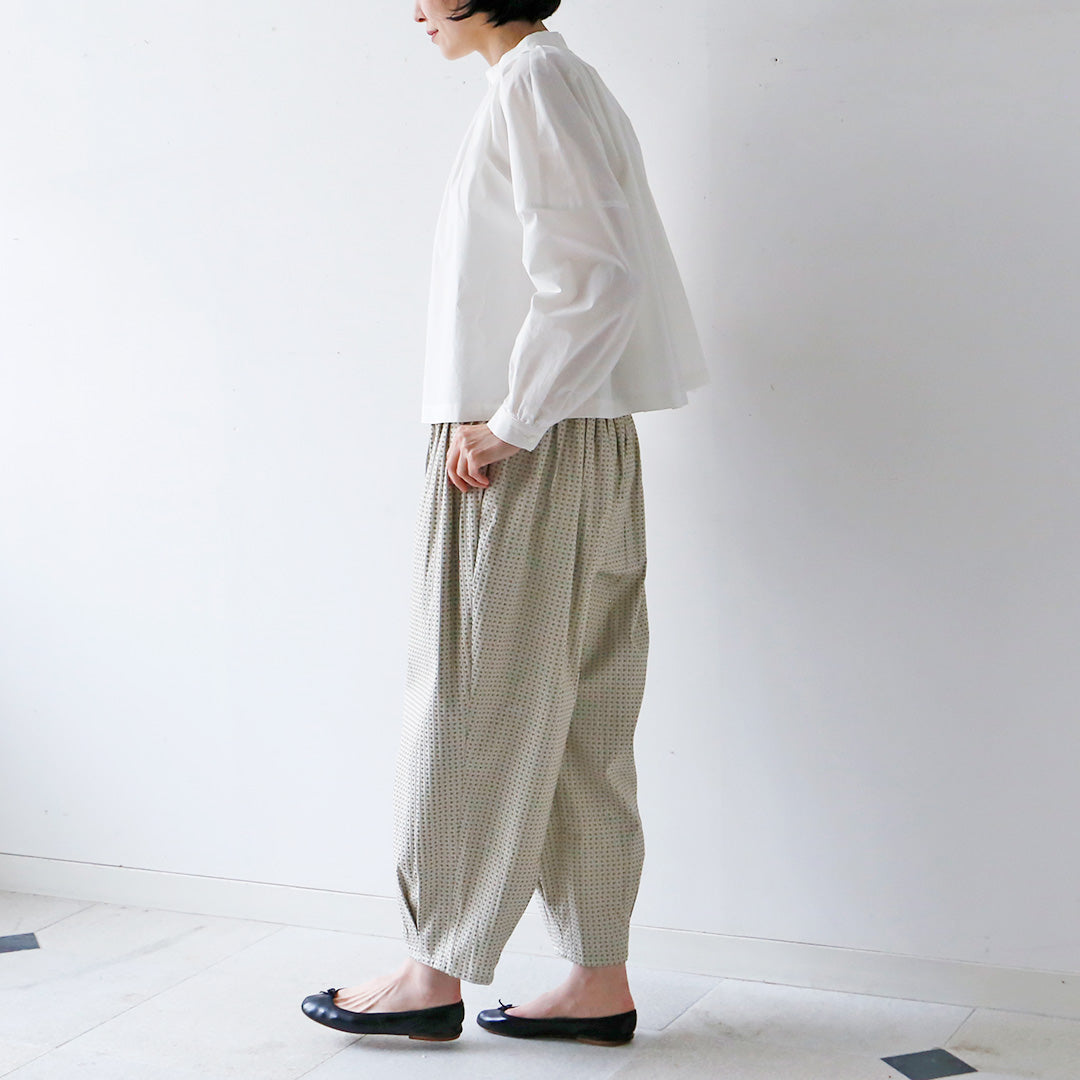 たっぷりと贅沢に生地を使った、丸みを帯びたシルエット。腰回りには程よいボリューム感、裾にはボックスタックをとって緩やかなラインを描きます。