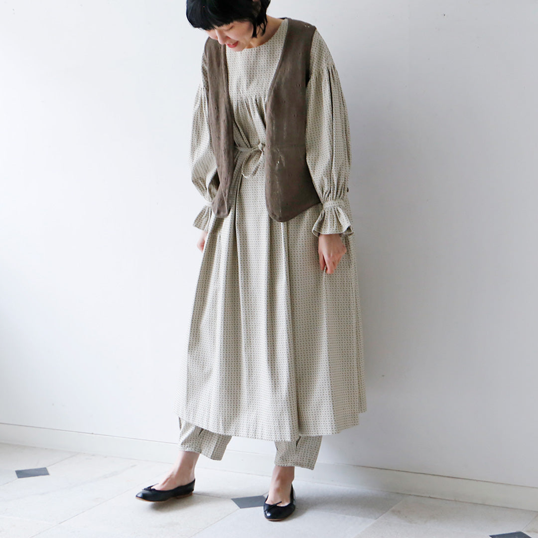 ウエストには共布の細いリボンベルト。キュッと結んでアクセントに。腰まわりには切り替えを入れ、柄ものでもすっきり見えるように工夫されています。