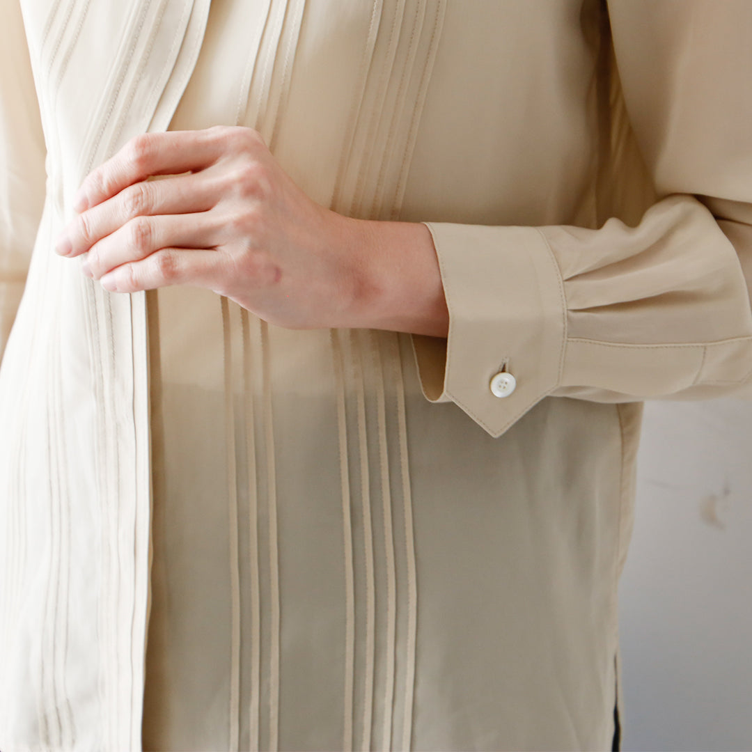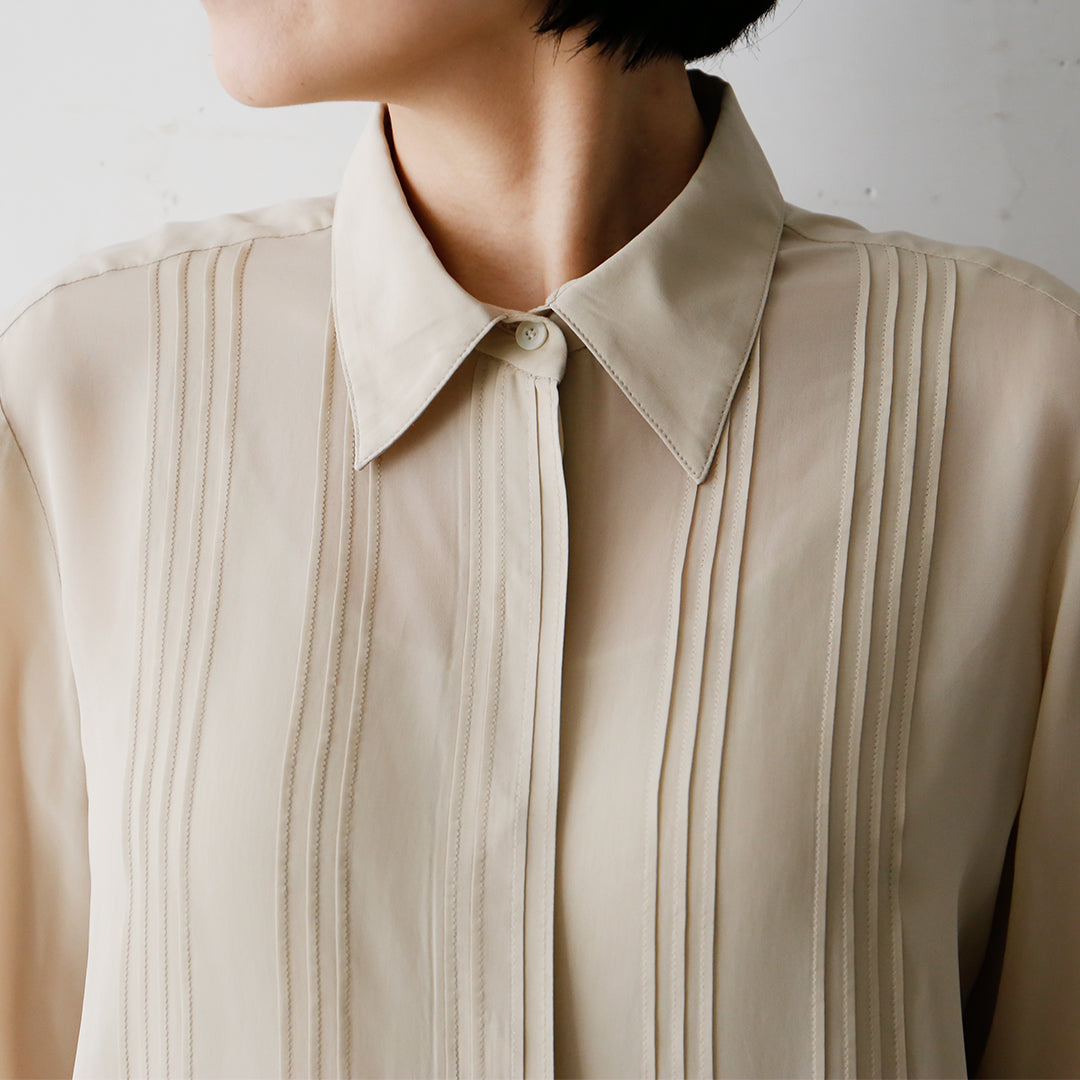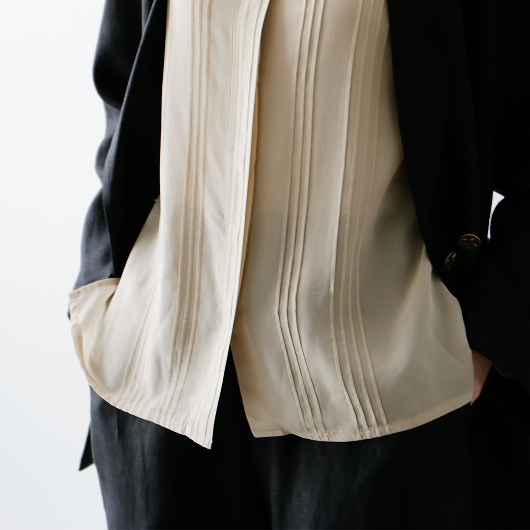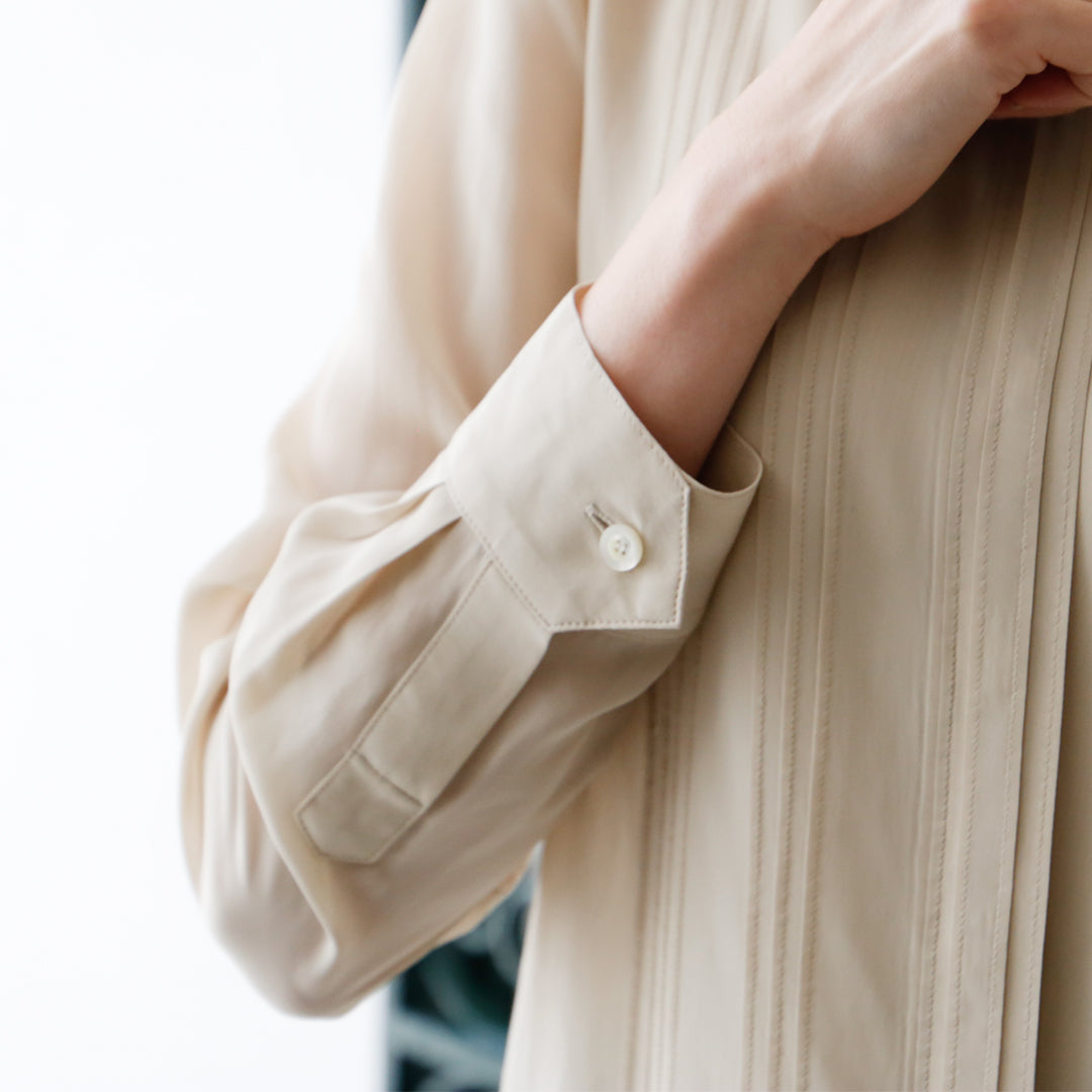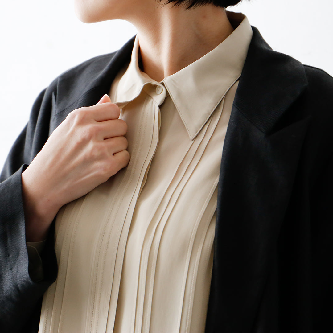 鋭角の襟と個性的な袖のカフスが、全体をきりりと引き締め端正な雰囲気に。比翼開きが、前身に施したピンタックをより印象的にしてくれます。