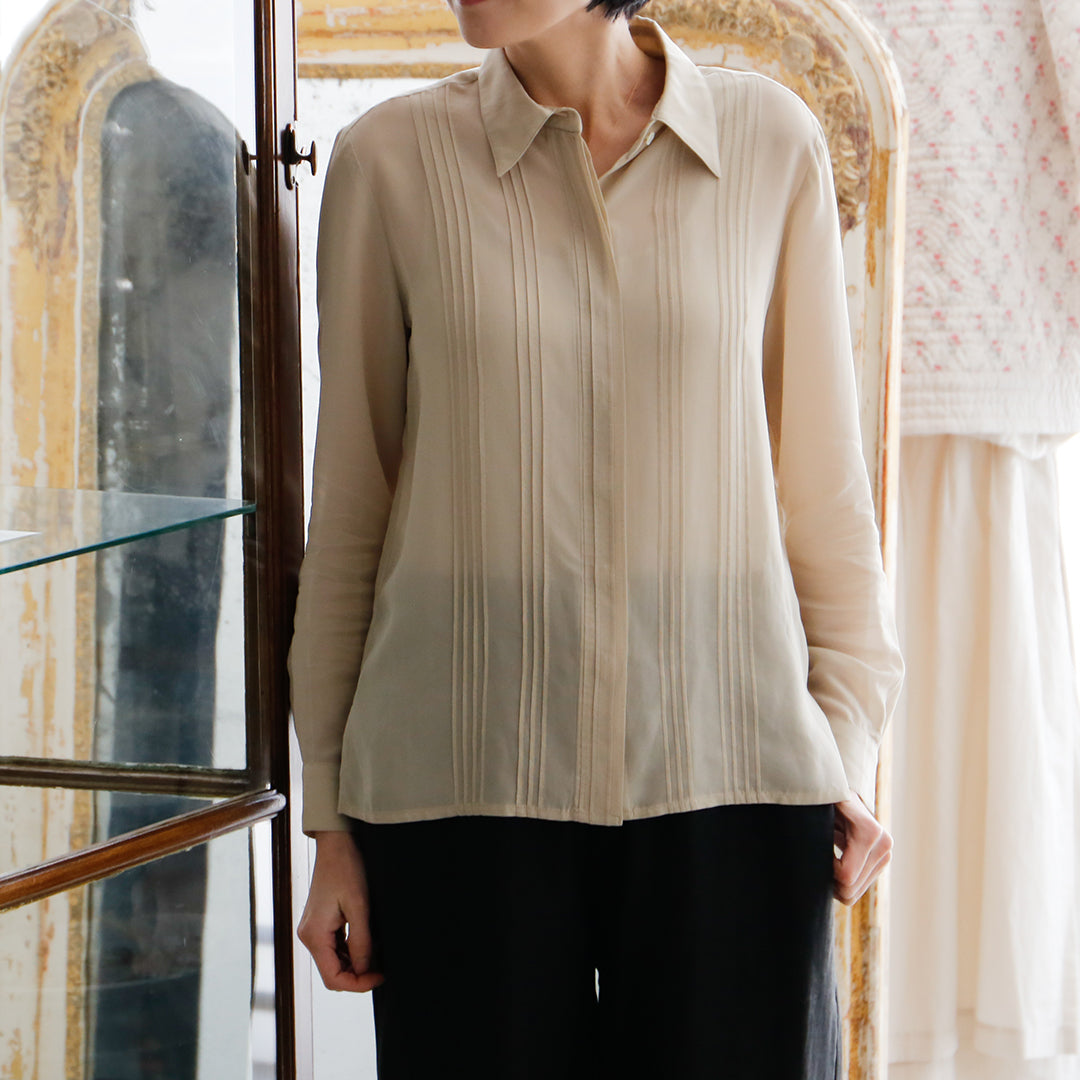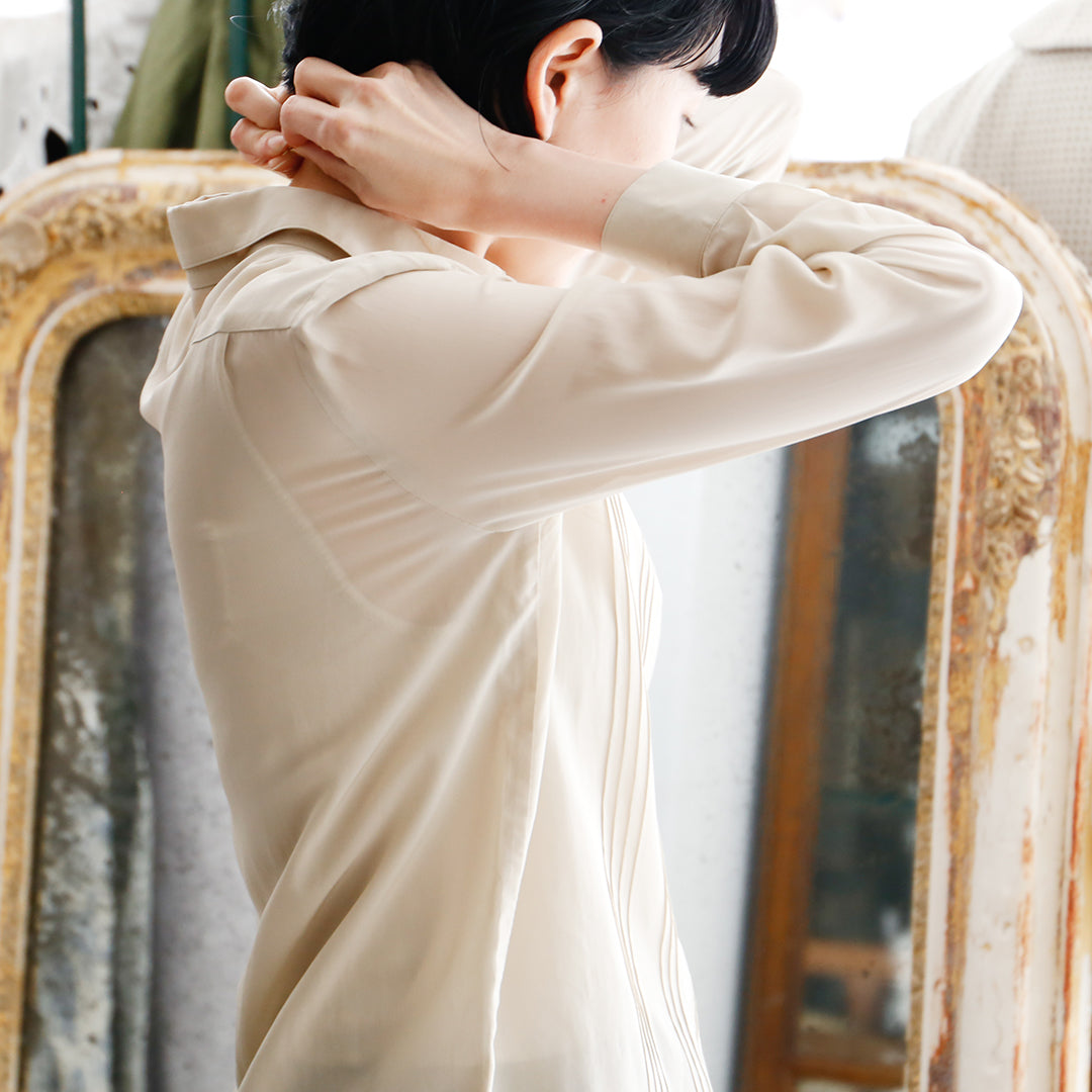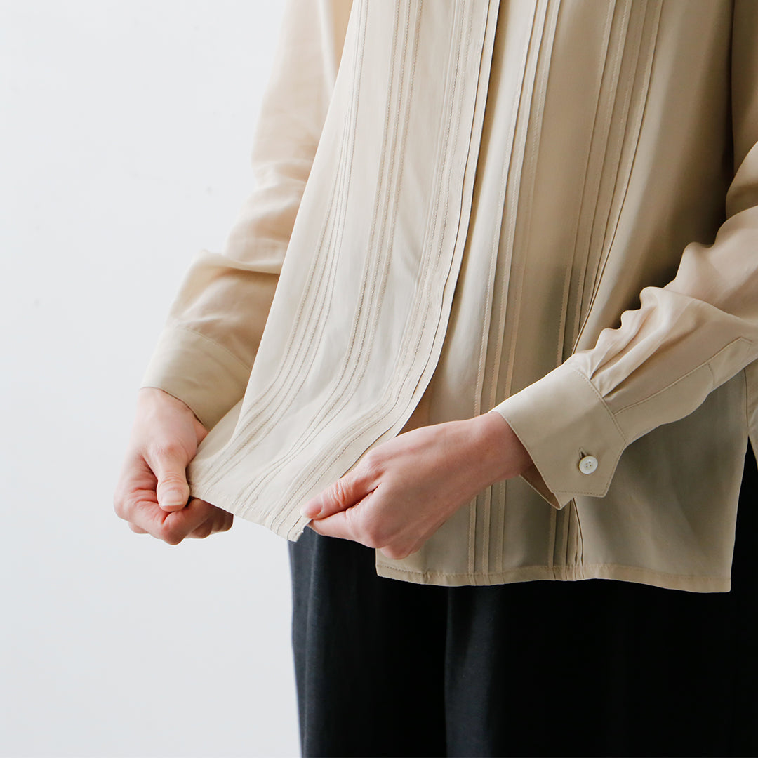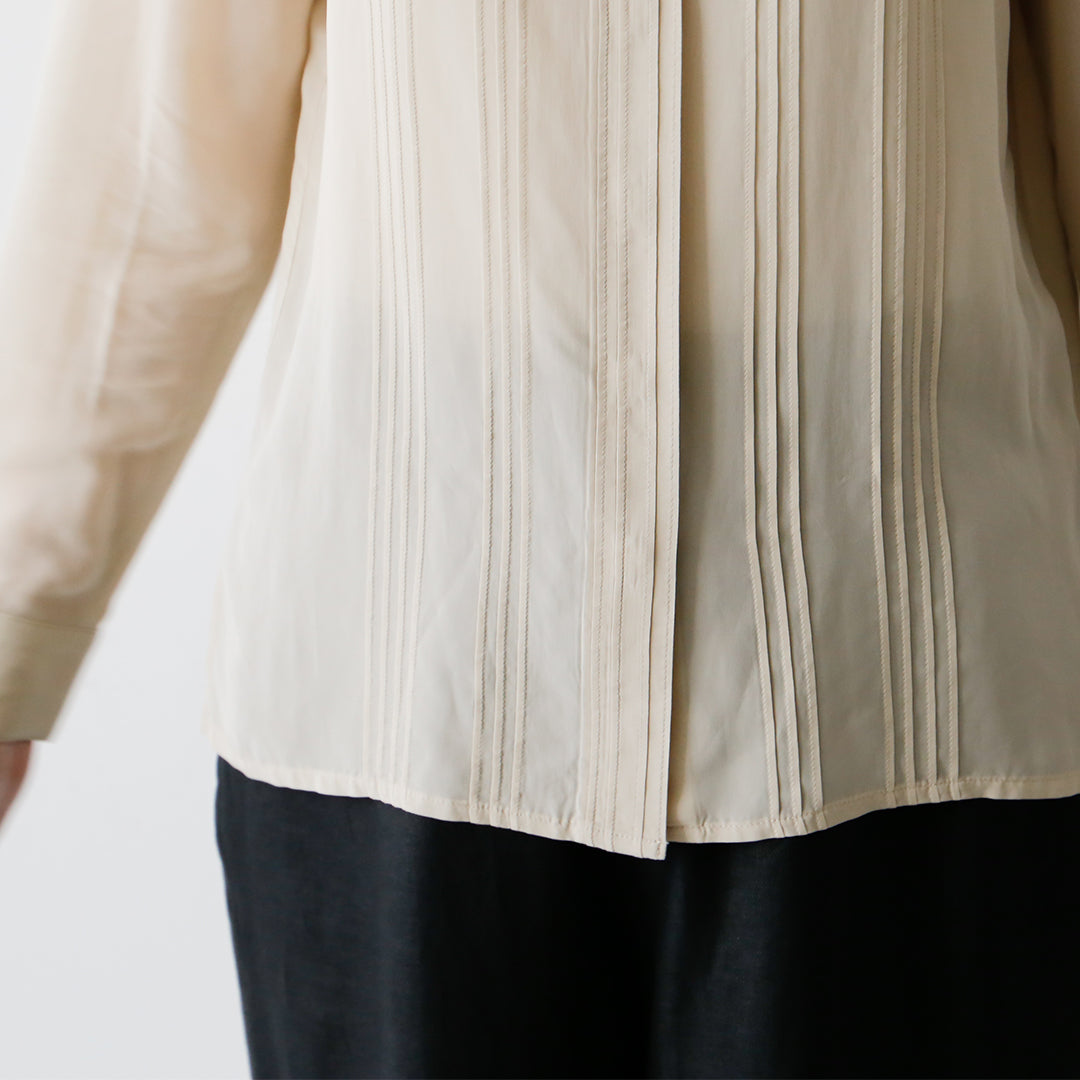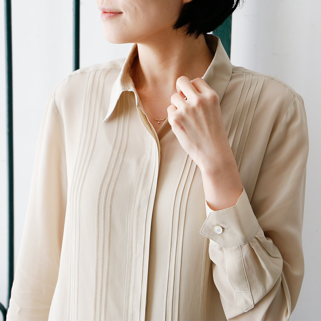 鋭角の襟と個性的な袖のカフスが、全体をきりりと引き締め端正な雰囲気に。比翼開きが、前身に施したピンタックをより印象的にしてくれます。