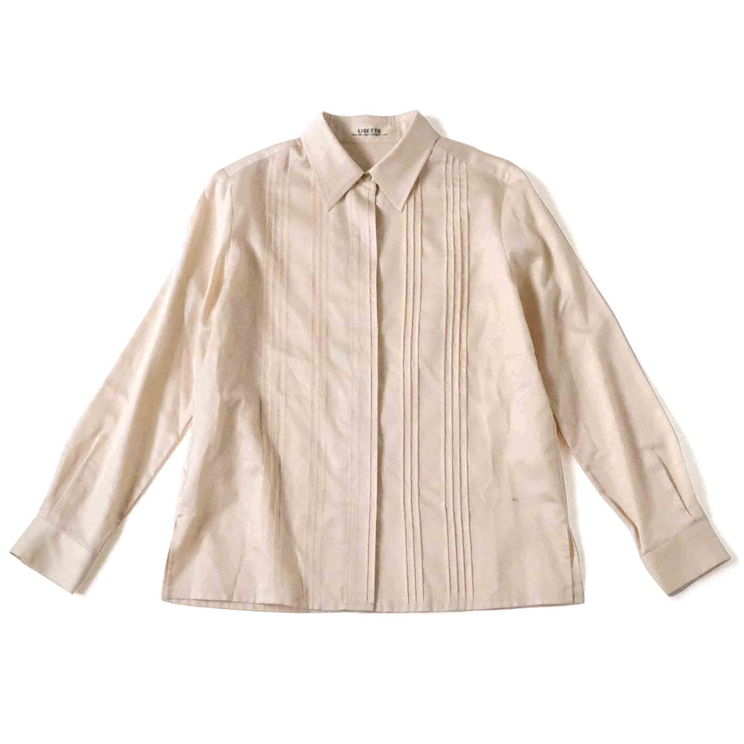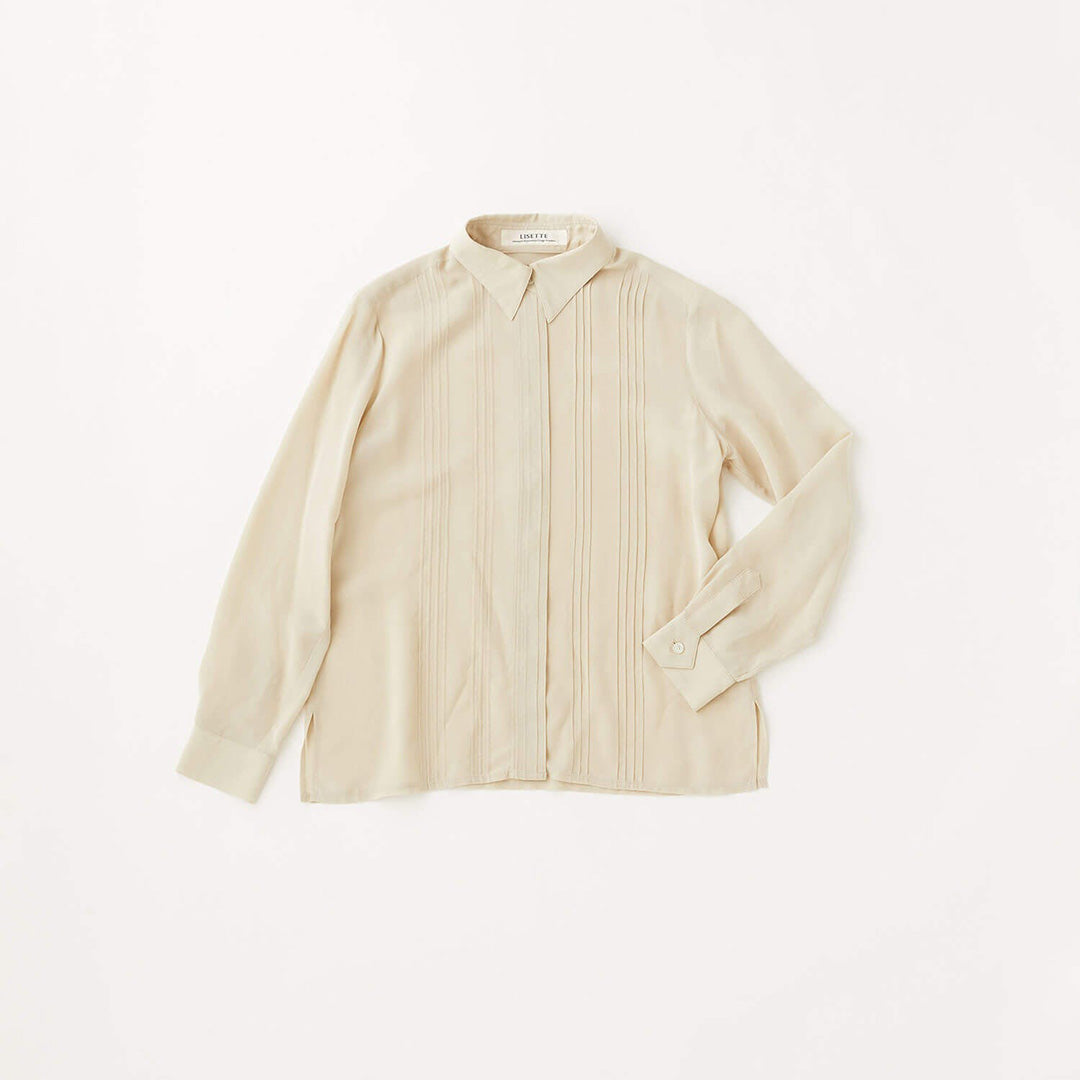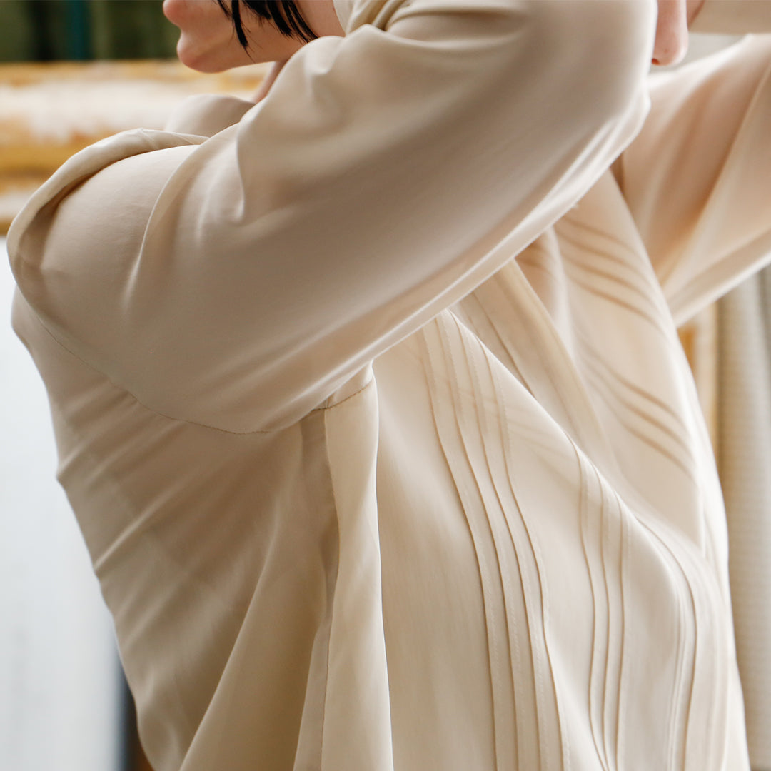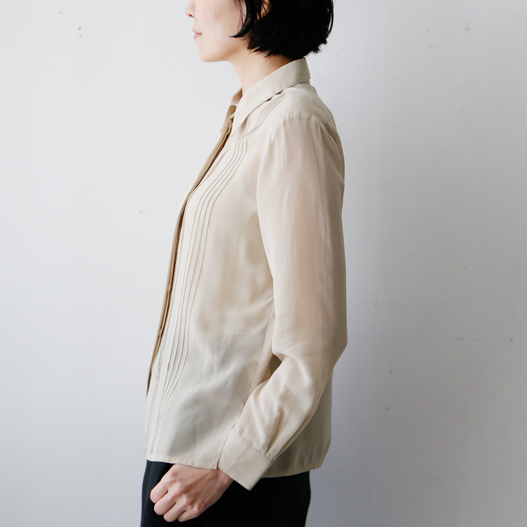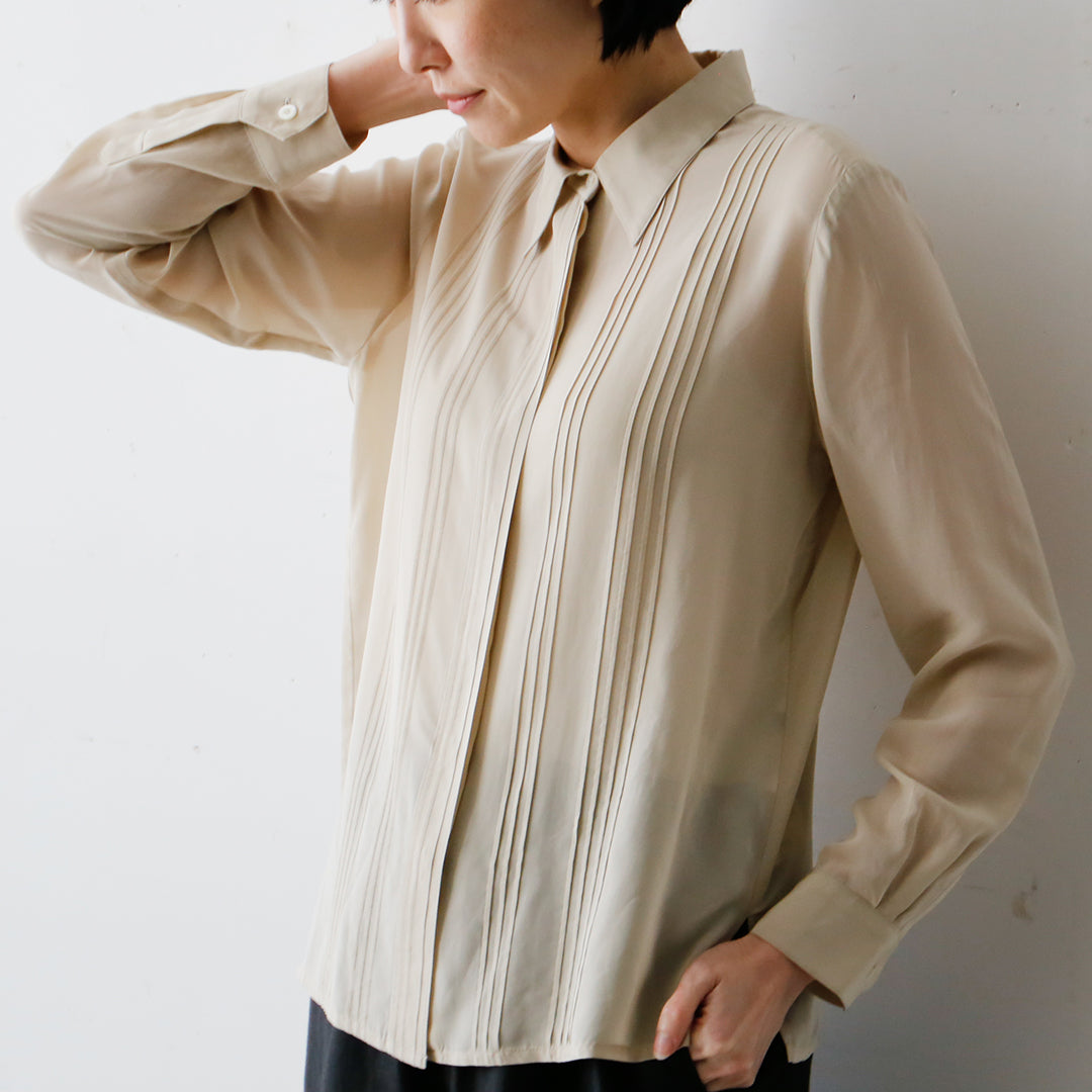 鋭角の襟と個性的な袖のカフスが、全体をきりりと引き締め端正な雰囲気に。比翼開きが、前身に施したピンタックをより印象的にしてくれます。