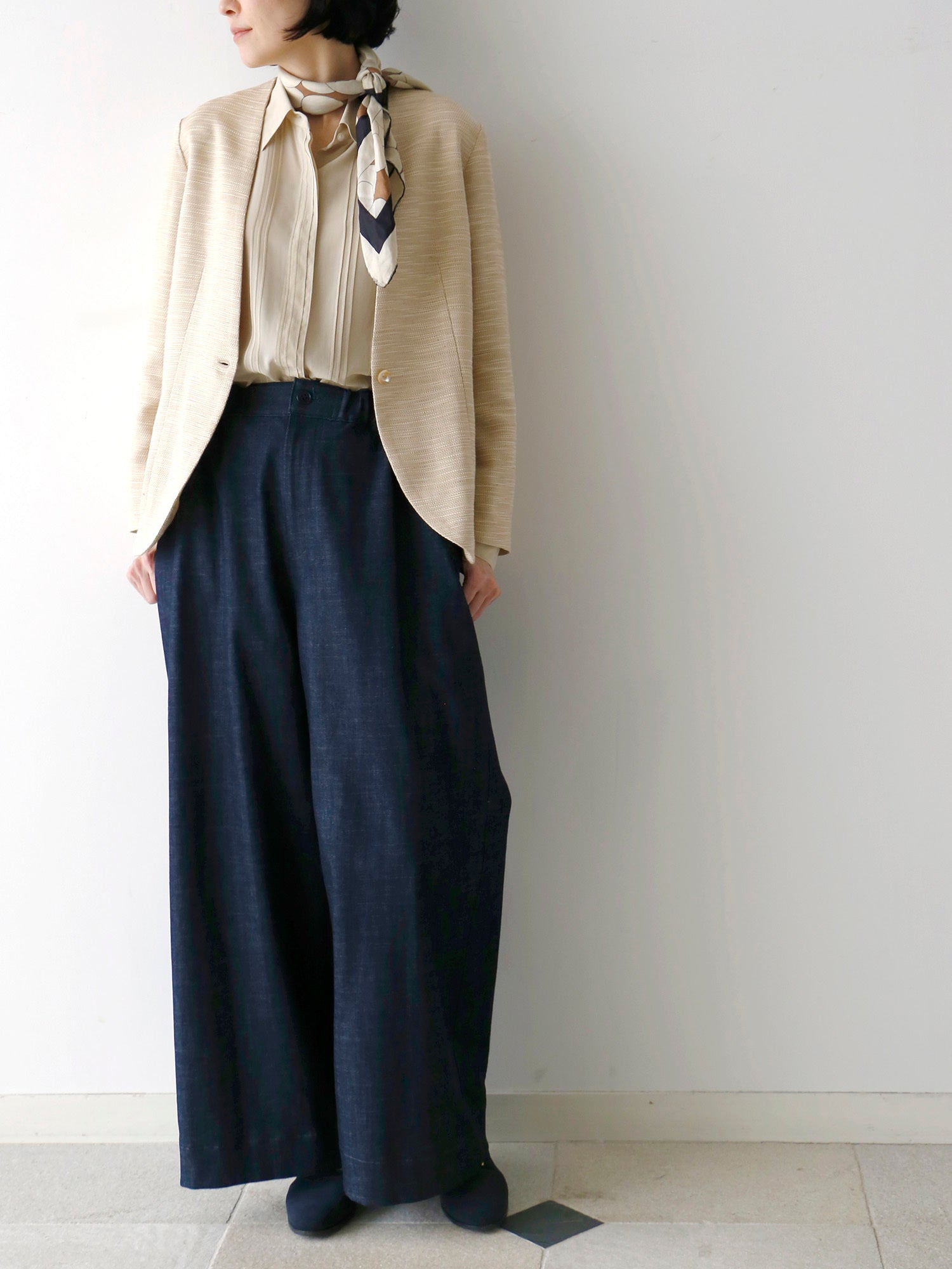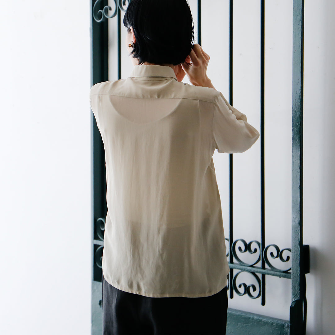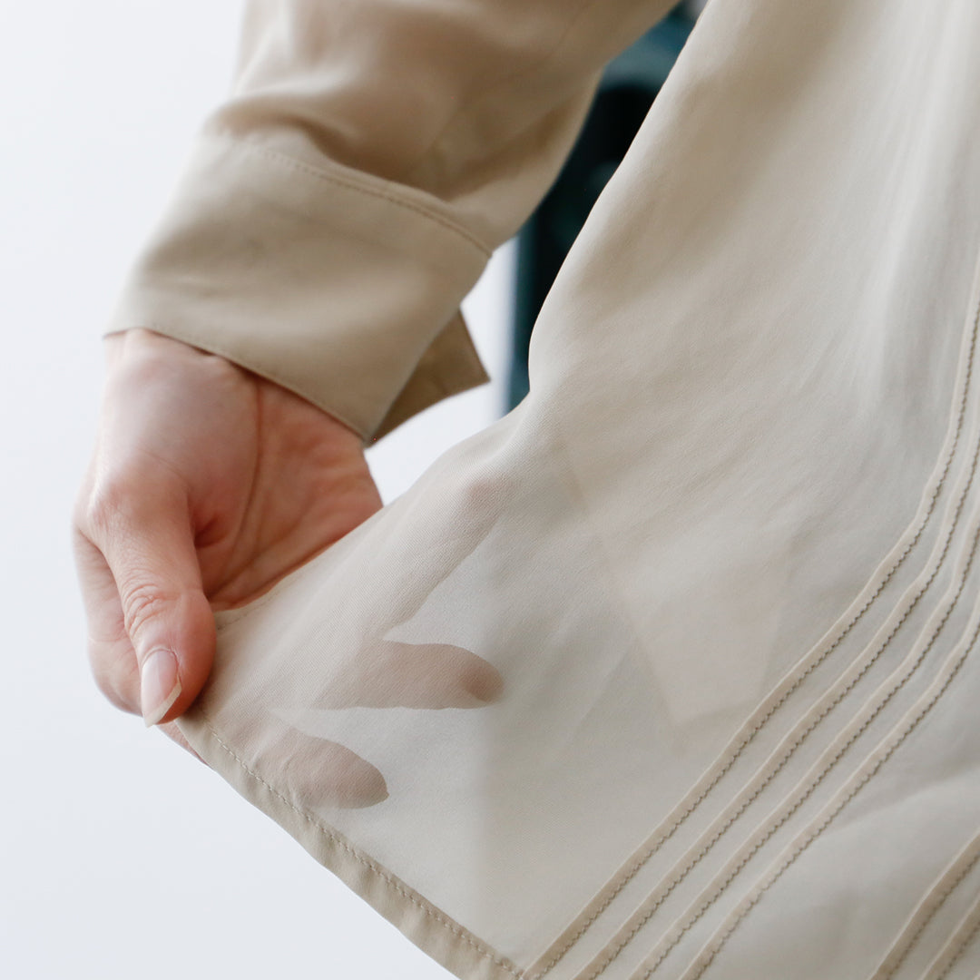 生地はイタリアのSERICA社のもの。シックなベージュは肌を美しく見せてくれます。きちんと感を出したい時のコーディネートや、パンツと合わせたカジュアルスタイルにも。