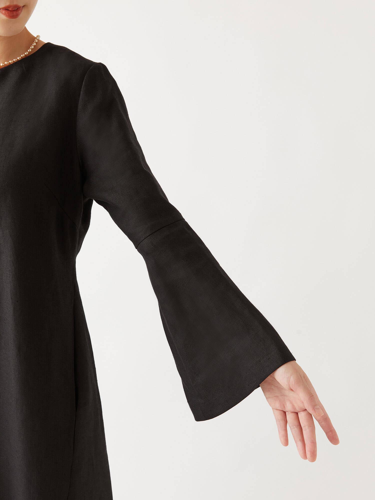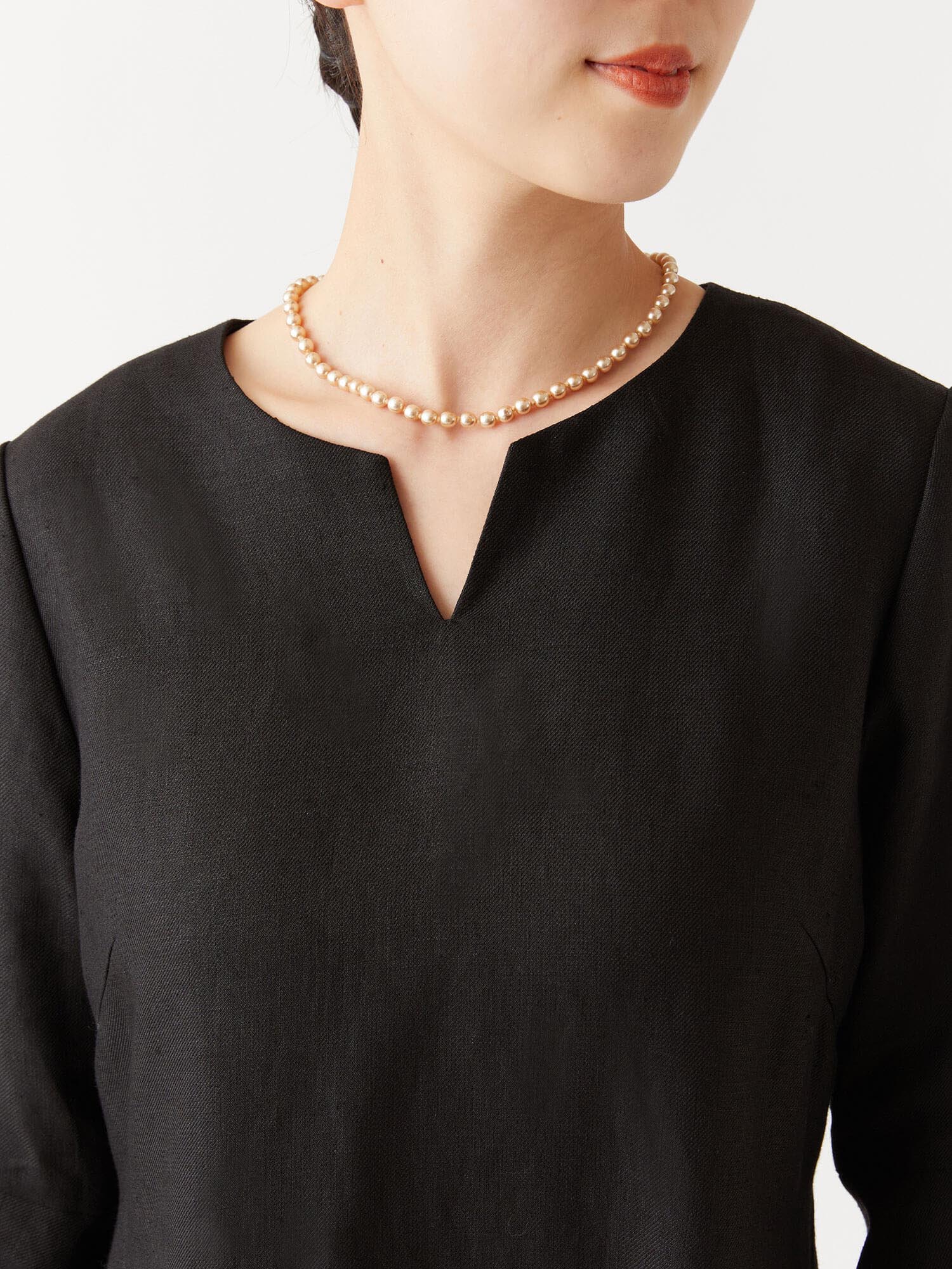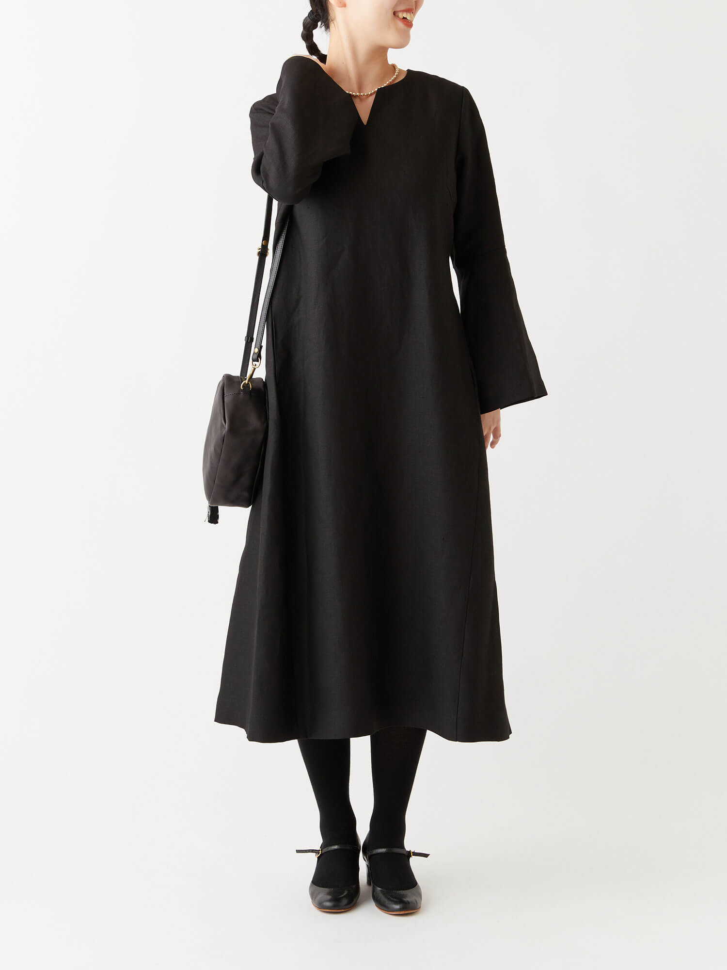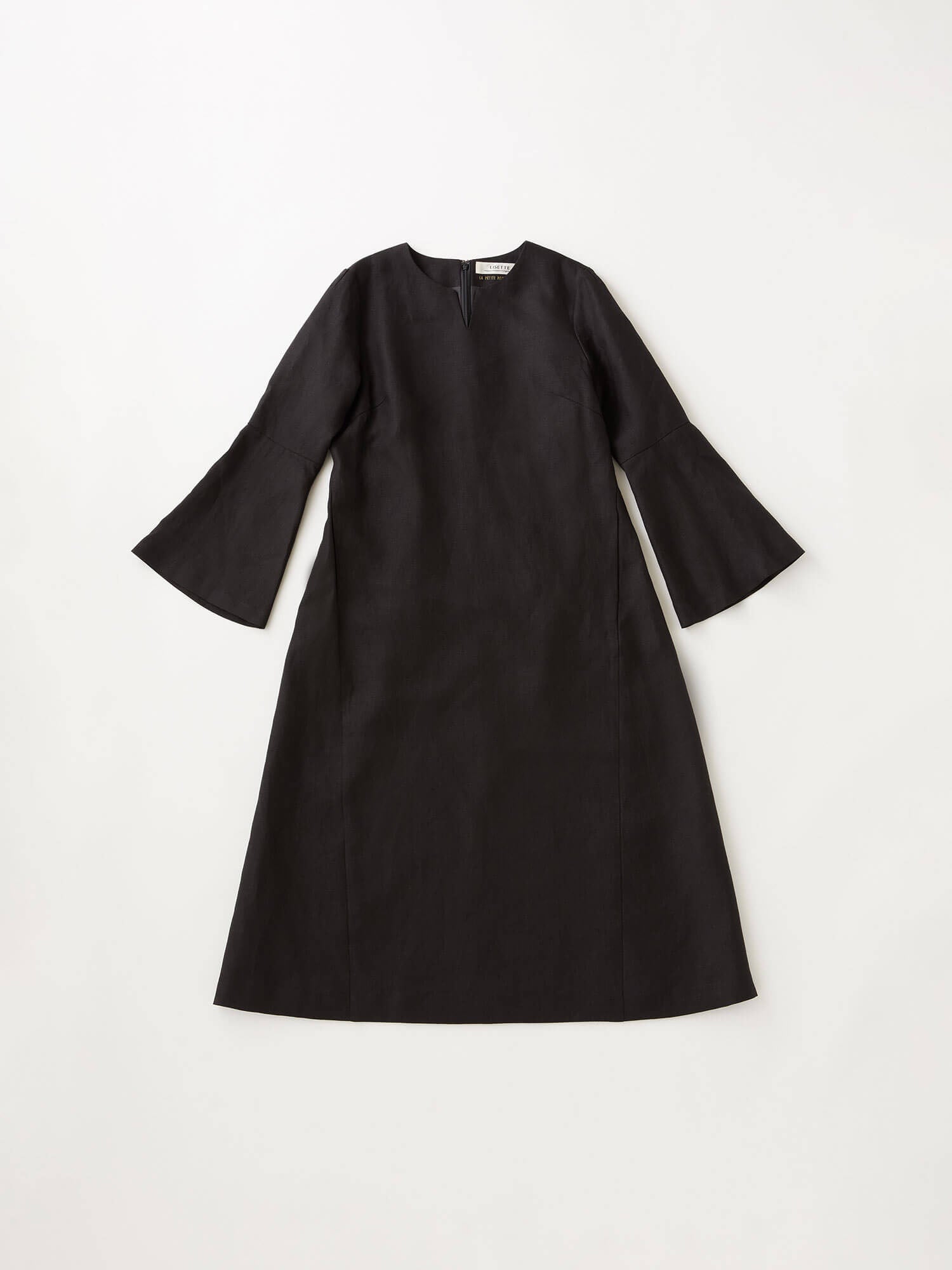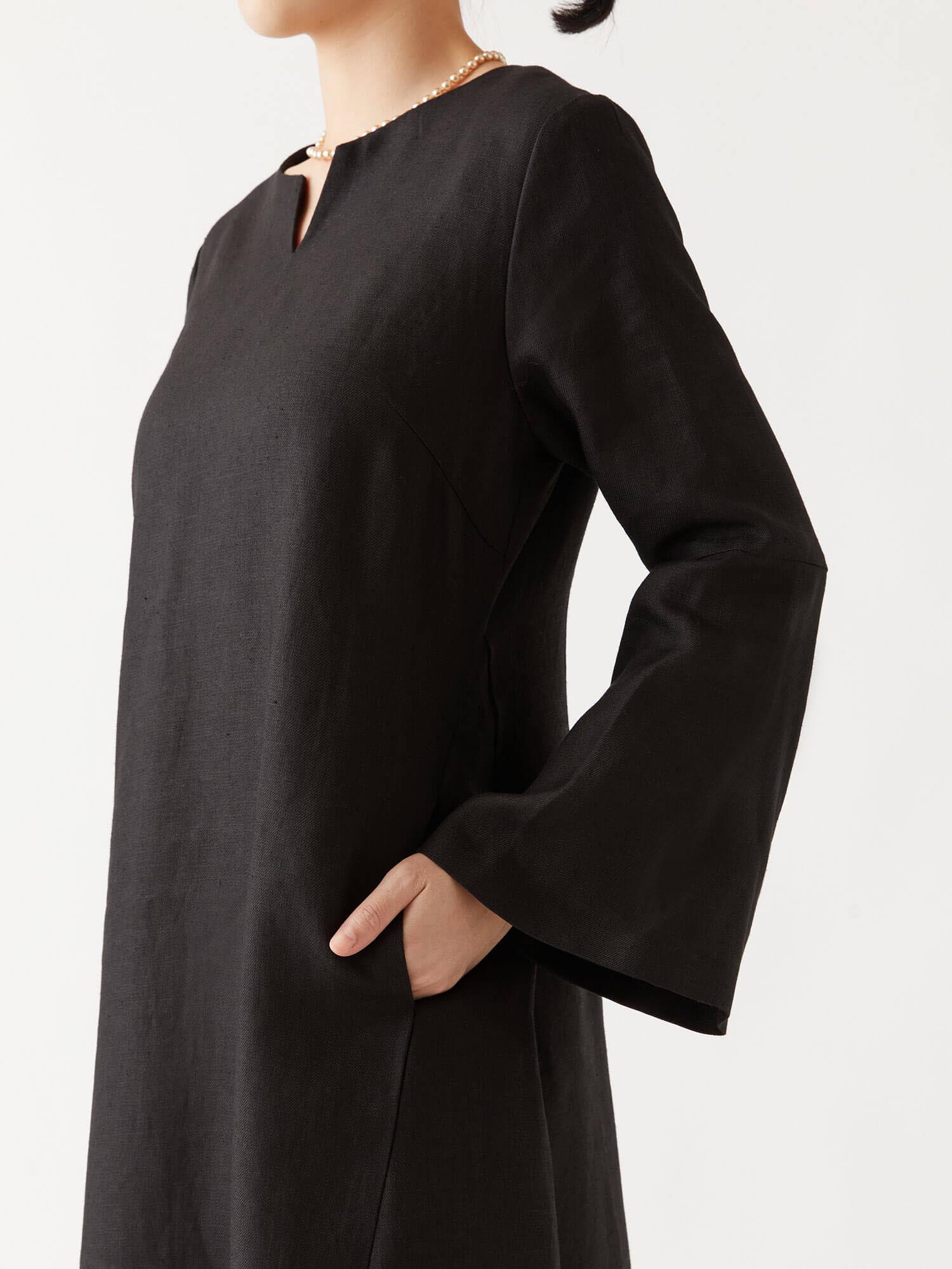 ダーツが入った細身の身頃と対照的な、裾に向かって広がる袖が印象的。袖は切り替えになっています。首元にはスリットが入り、より女性らしさを際立たせています。