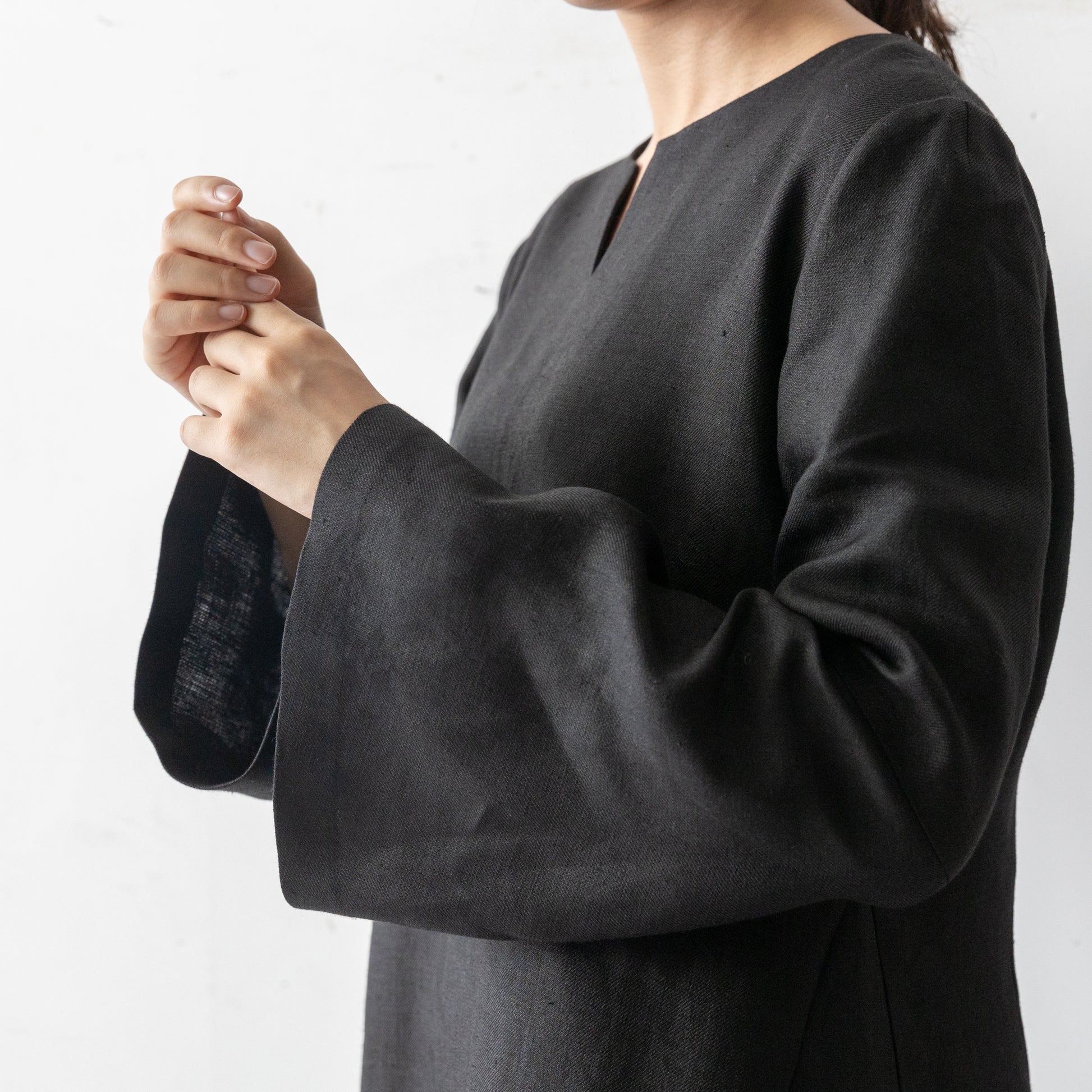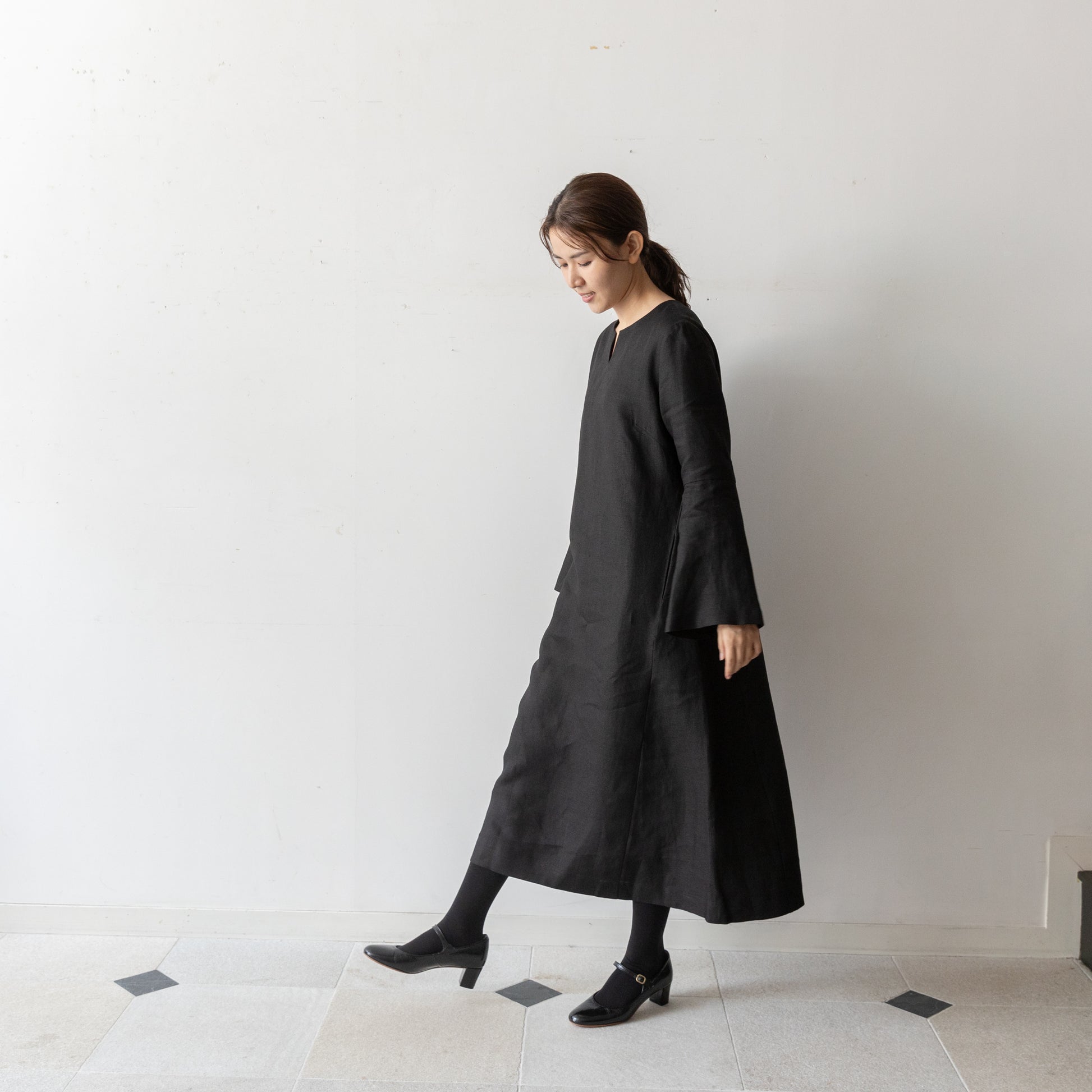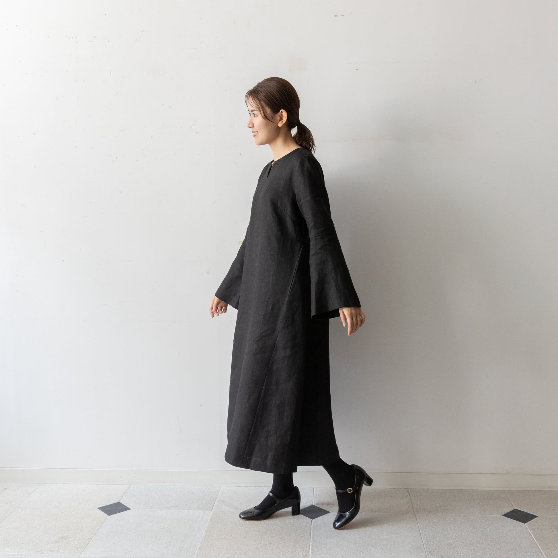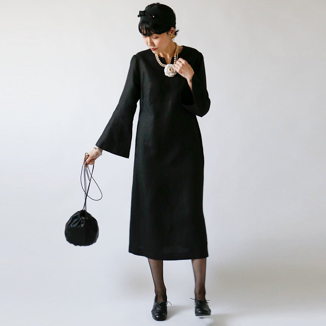 ベルのようなフレアした袖と細身のシルエットが美しい上品なワンピース。普段使いから、ちょっとしたお呼ばれの席まで幅広く着こなせます。控えめな光沢の黒色のリネン地は華やかなアクセサリーをより引き立たせます。ウールリネンの「アマリア / ノアール・シャルボン」もございます。