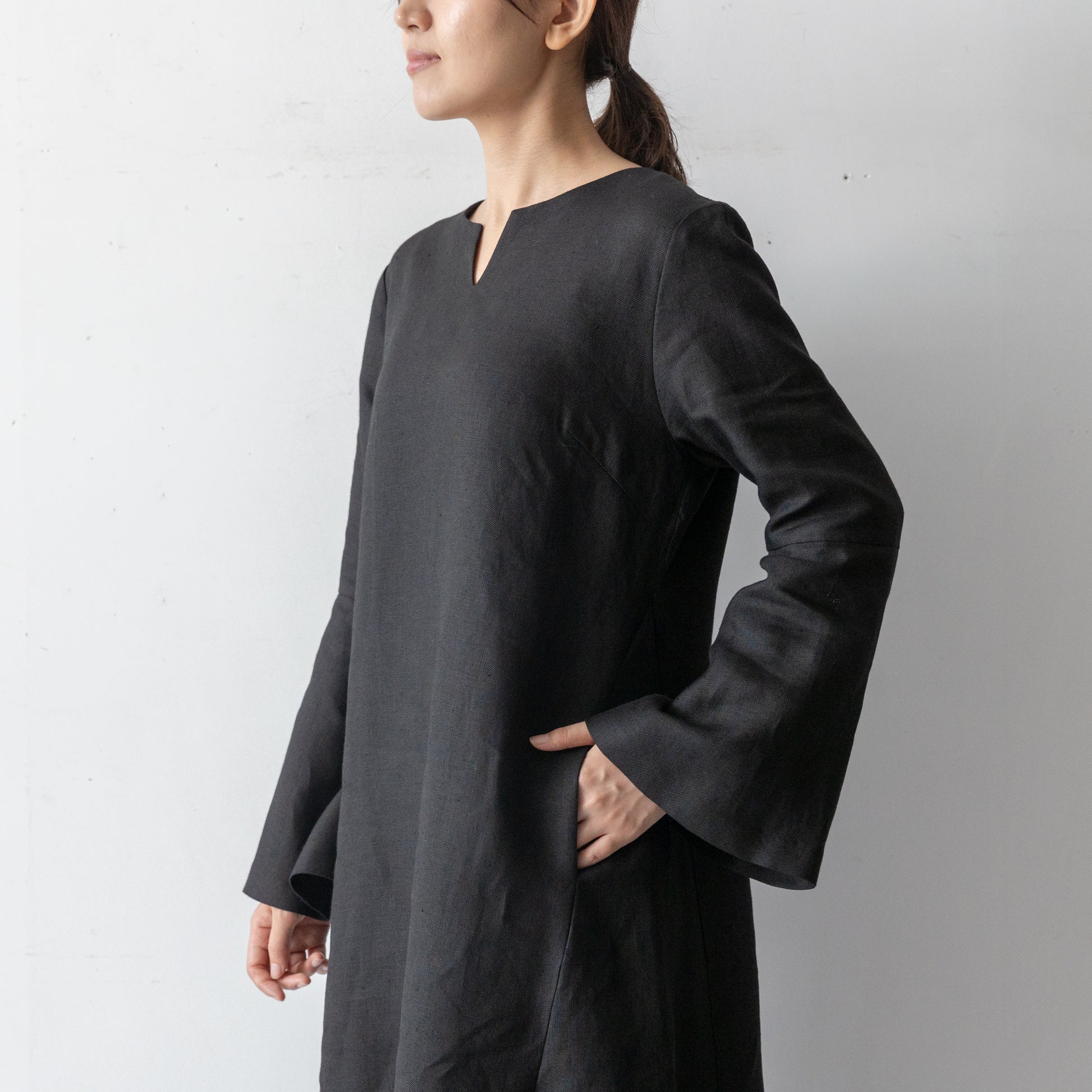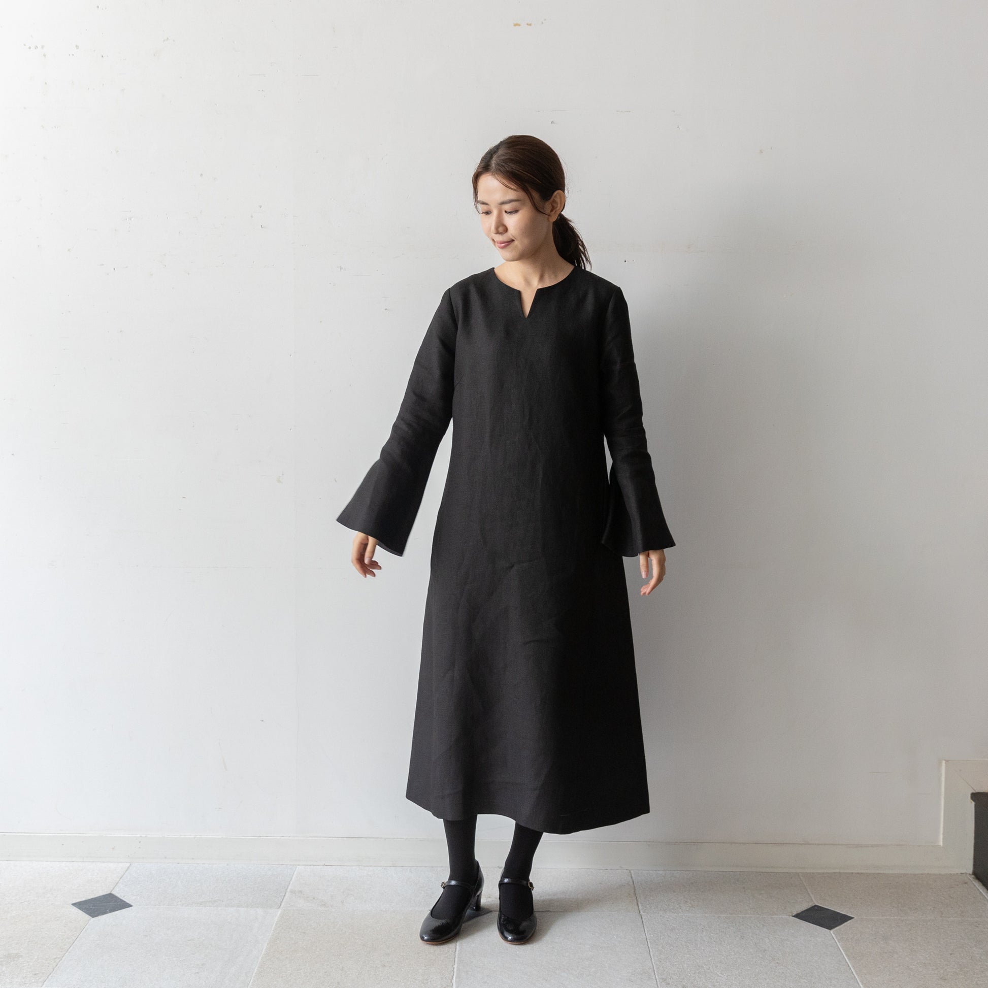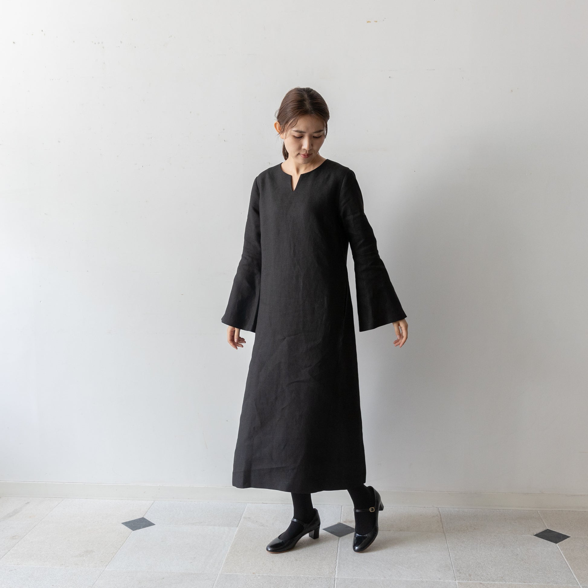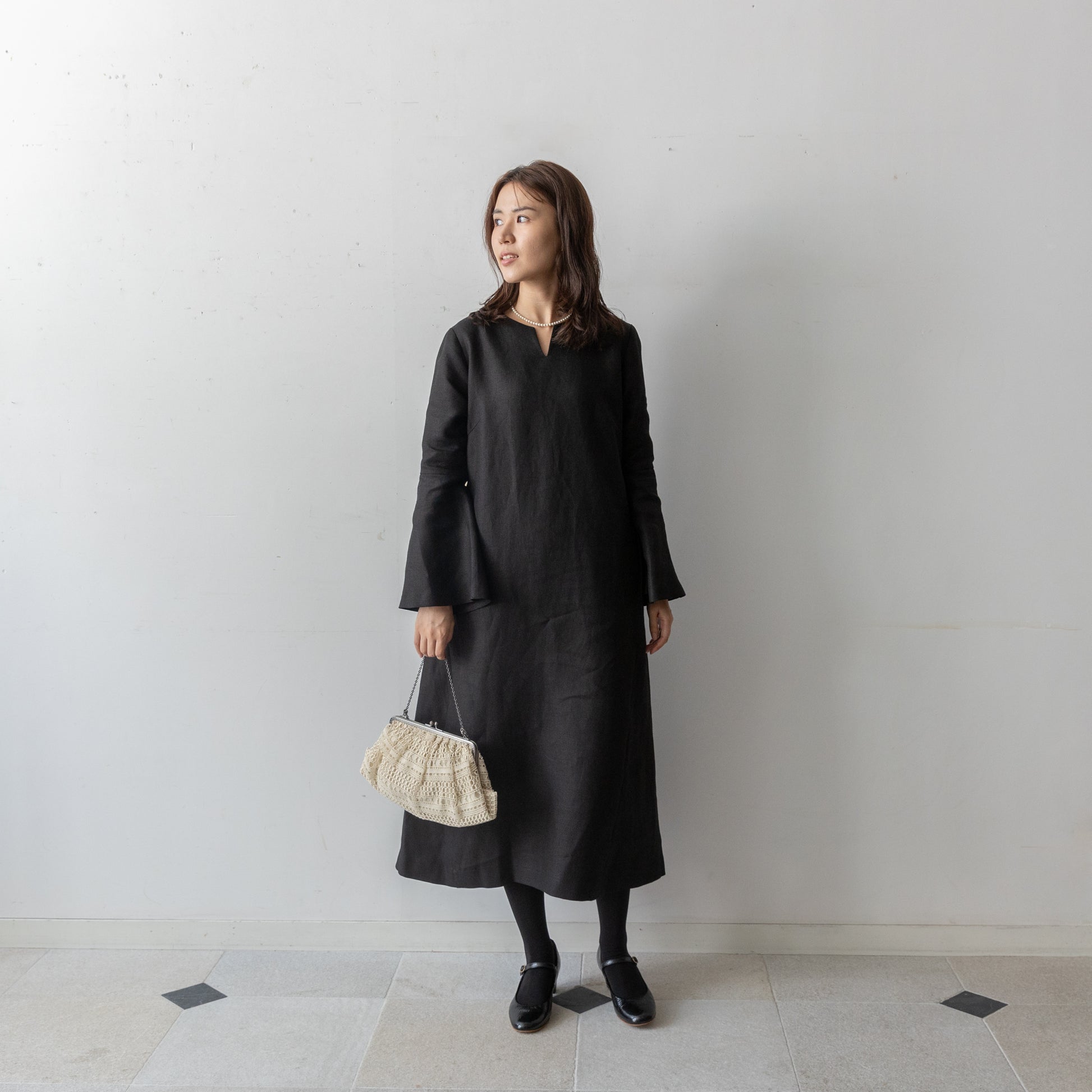 ベルのようなフレアした袖と細身のシルエットが美しい上品なワンピース。普段使いから、ちょっとしたお呼ばれの席まで幅広く着こなせます。控えめな光沢の黒色のリネン地は華やかなアクセサリーをより引き立たせます。ウールリネンの「アマリア / ノアール・シャルボン」もございます。