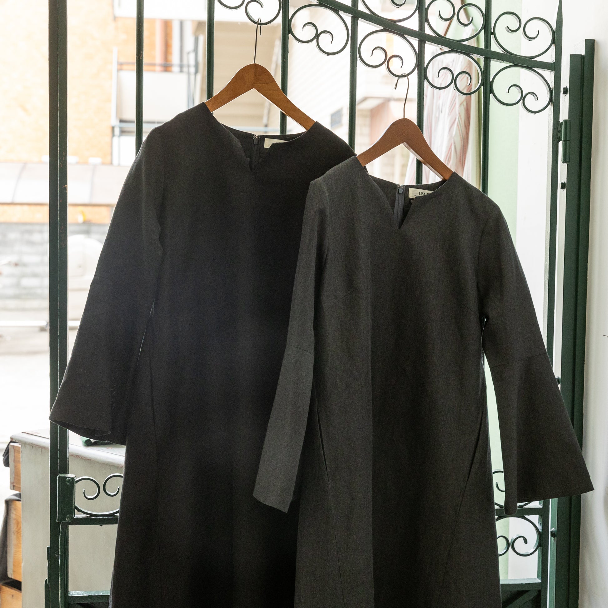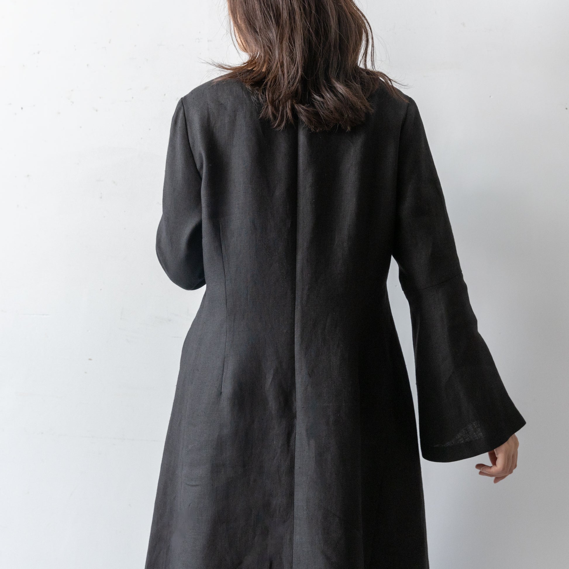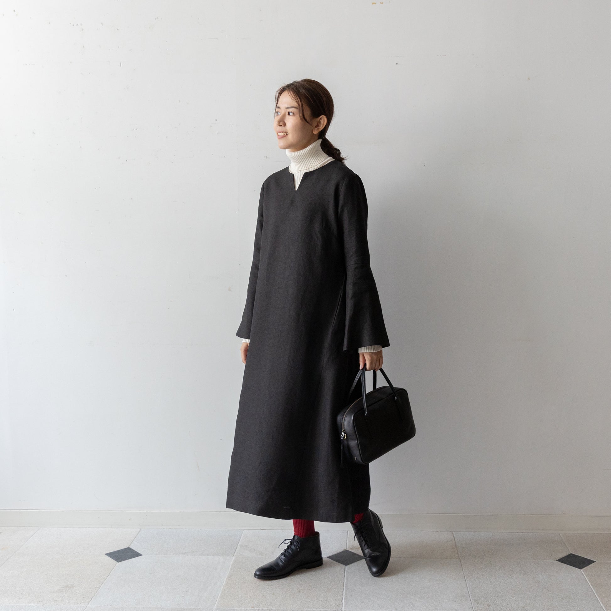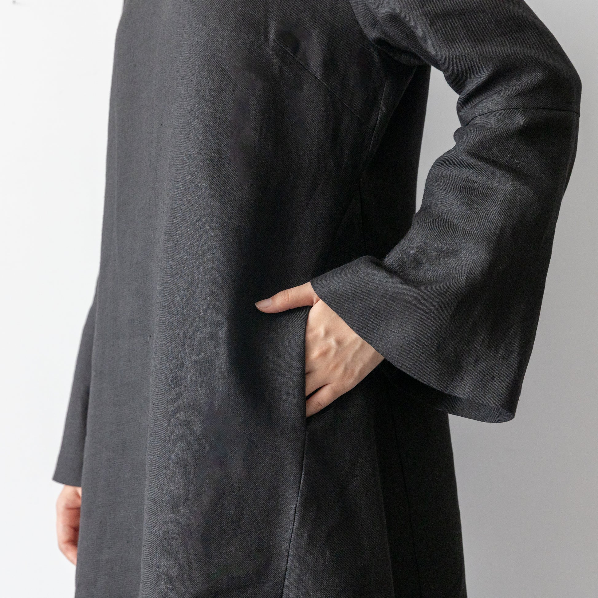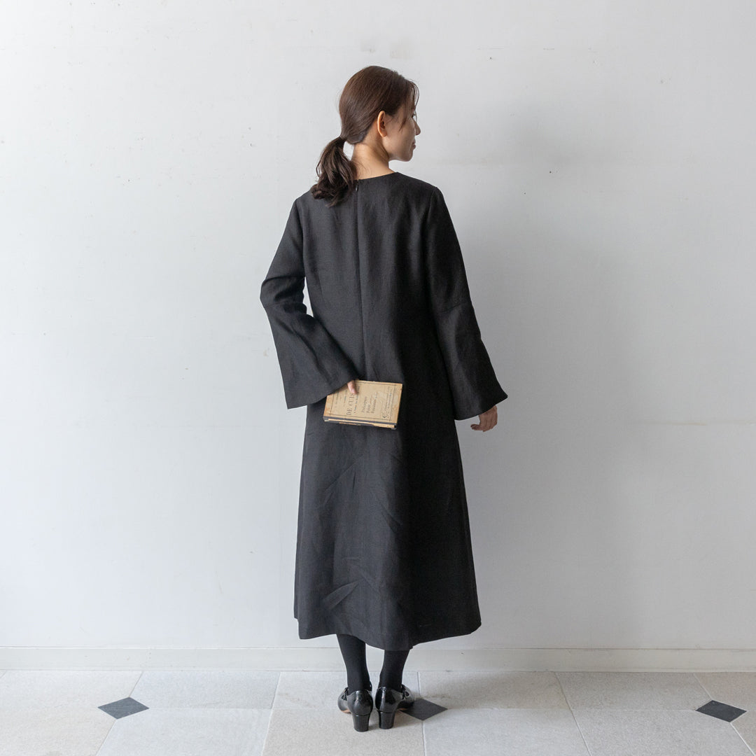 ベルのようなフレアした袖と細身のシルエットが美しい上品なワンピース。普段使いから、ちょっとしたお呼ばれの席まで幅広く着こなせます。控えめな光沢の黒色のリネン地は華やかなアクセサリーをより引き立たせます。ウールリネンの「アマリア / ノアール・シャルボン」もございます。