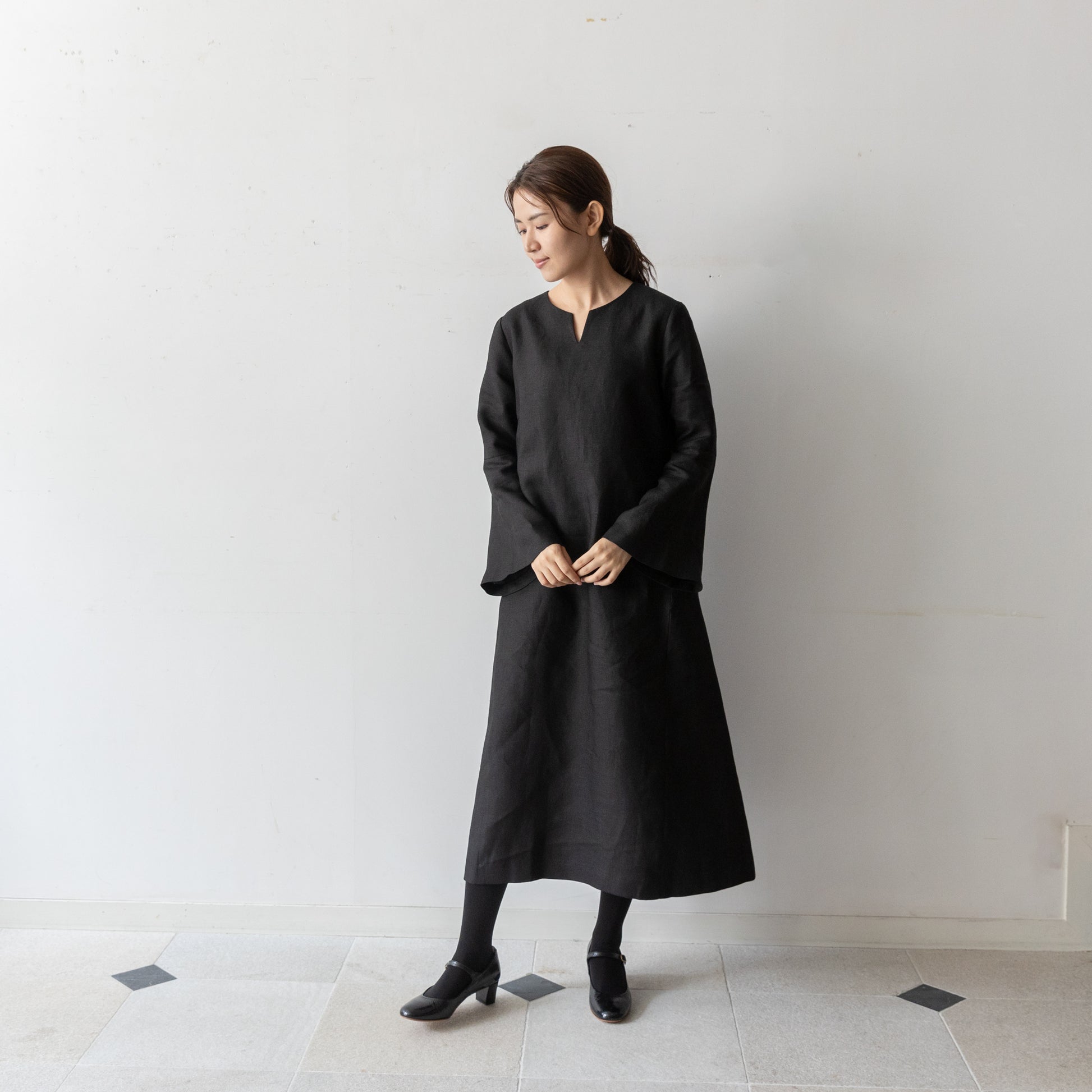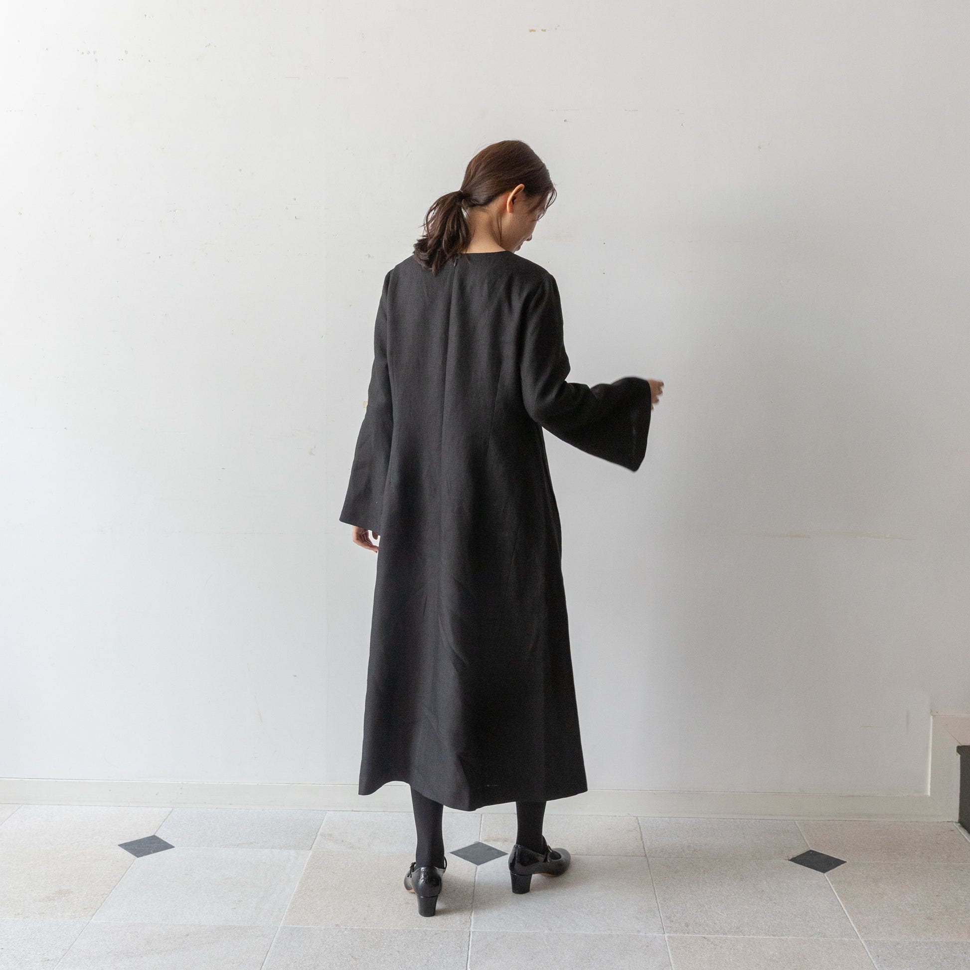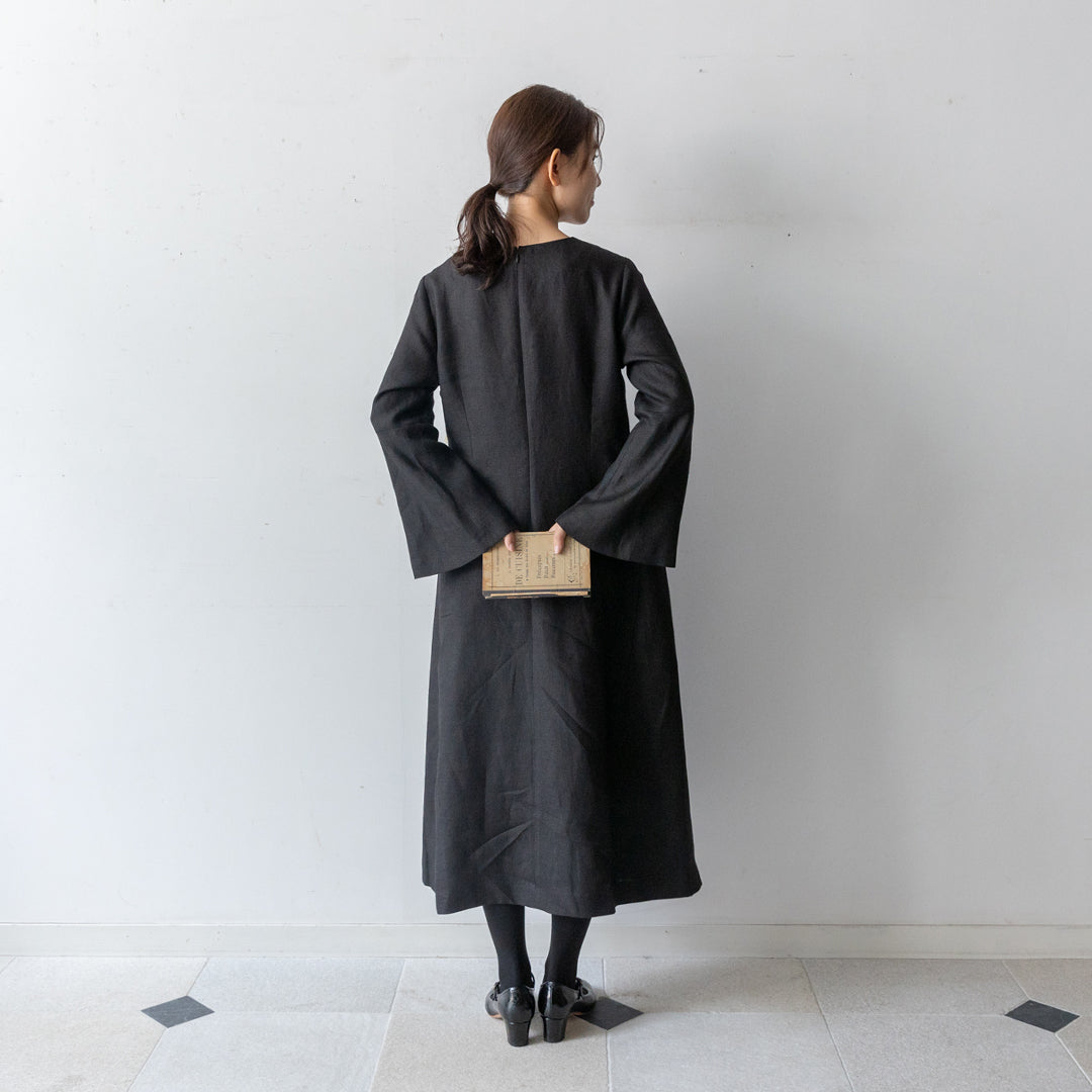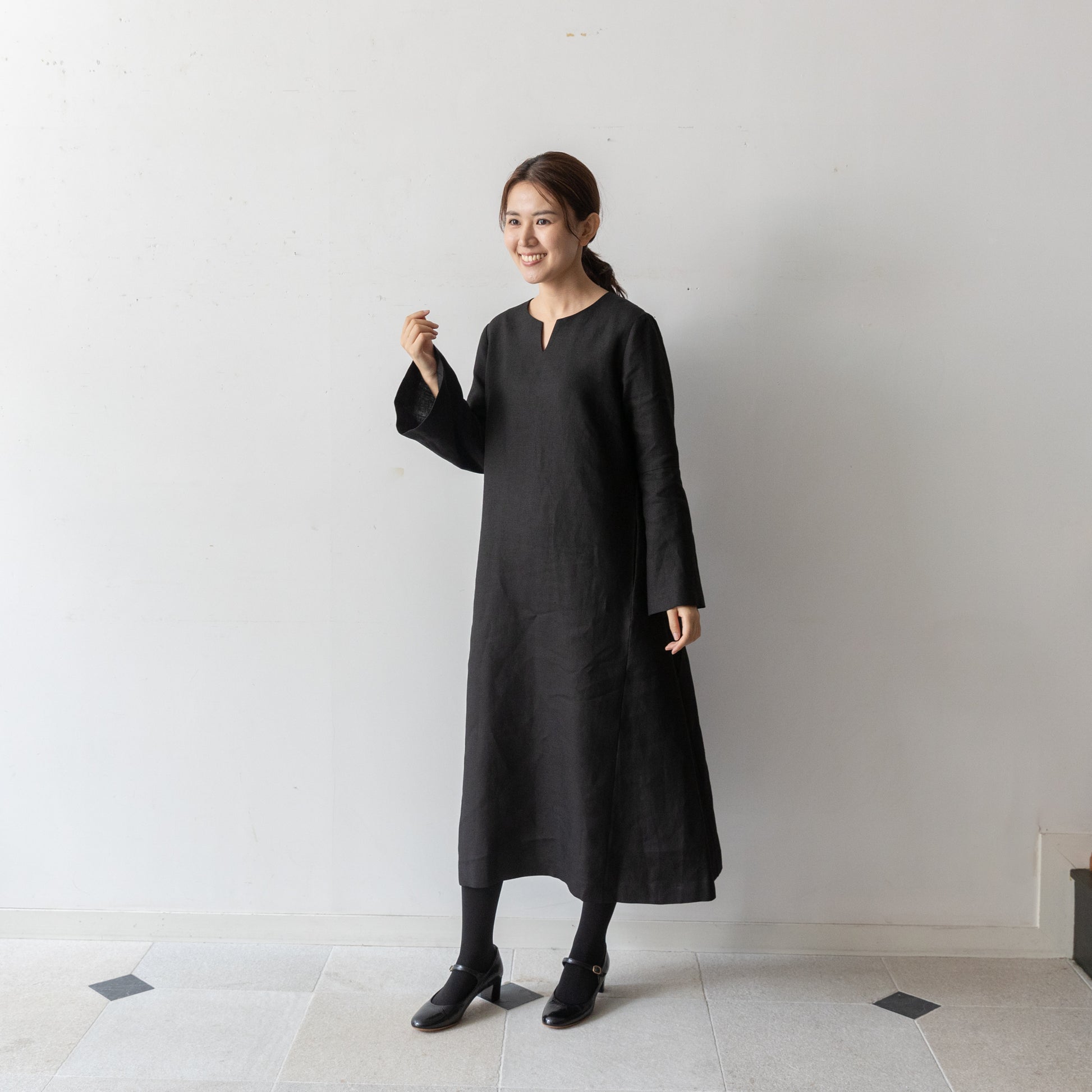 ベルのようなフレアした袖と細身のシルエットが美しい上品なワンピース。普段使いから、ちょっとしたお呼ばれの席まで幅広く着こなせます。控えめな光沢の黒色のリネン地は華やかなアクセサリーをより引き立たせます。ウールリネンの「アマリア / ノアール・シャルボン」もございます。