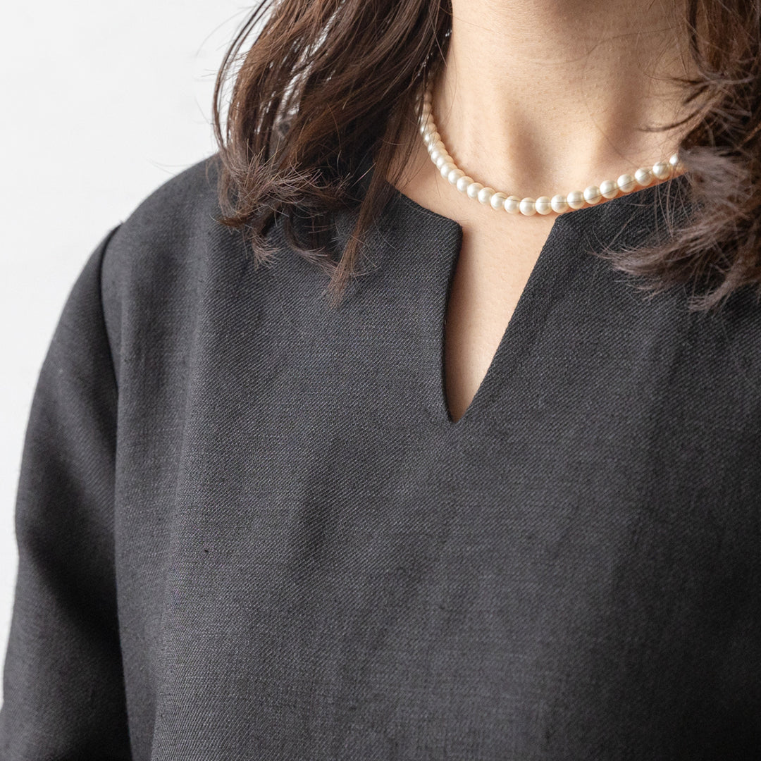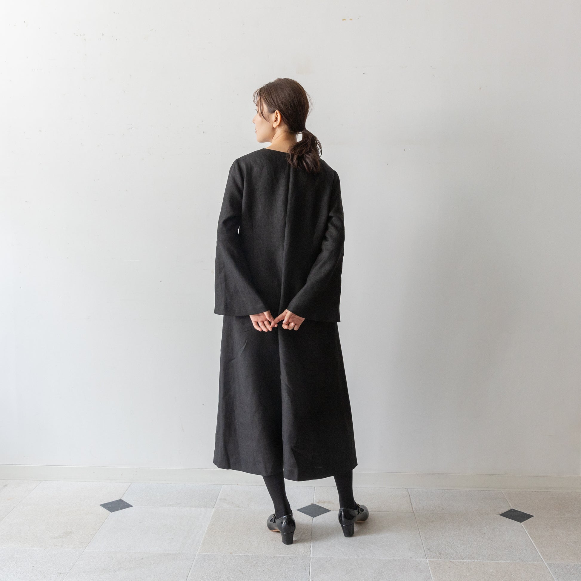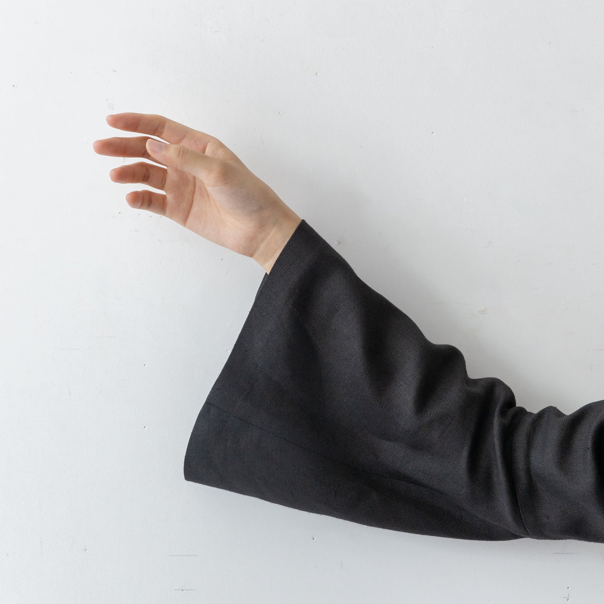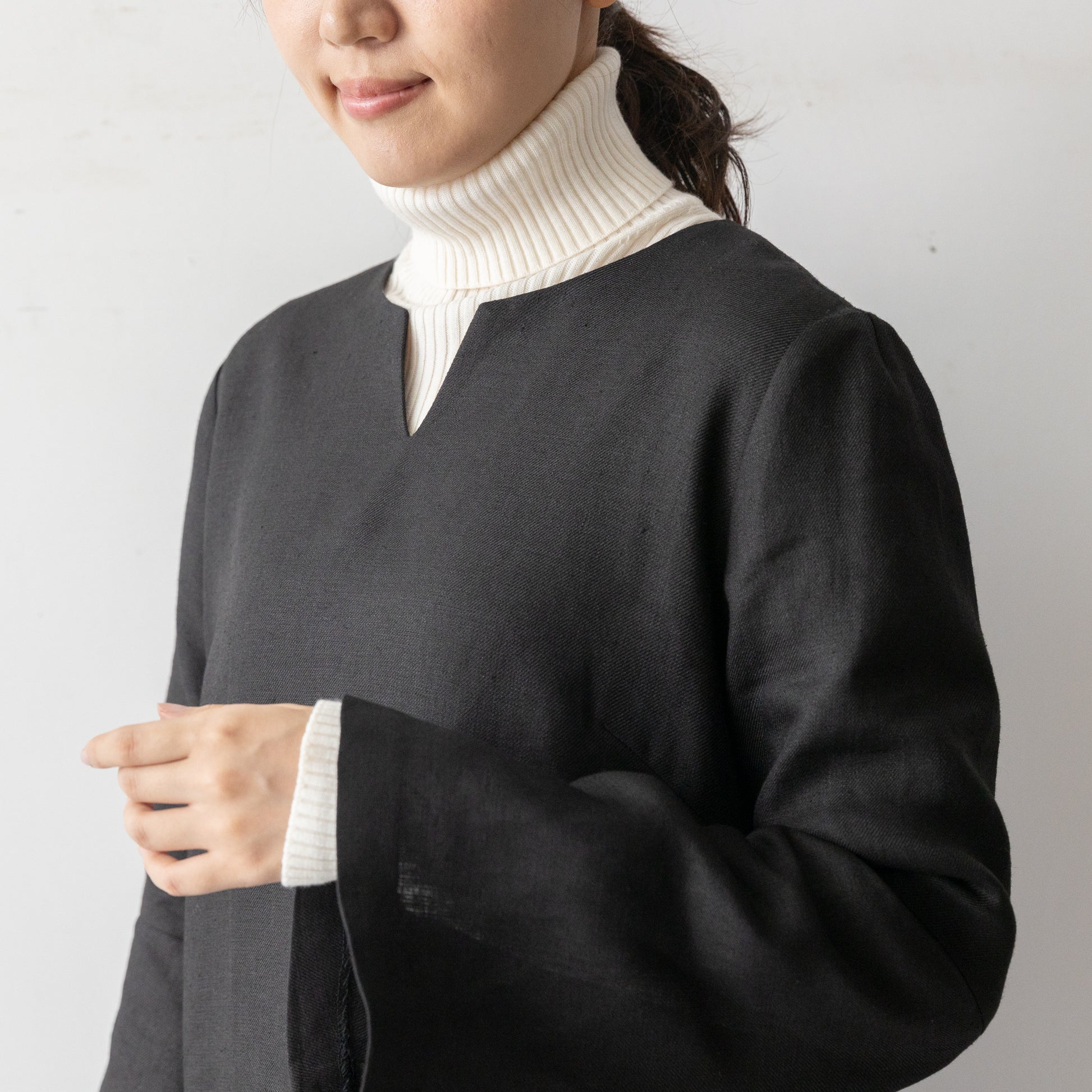 控えめな光沢の黒色のリネン地は華やかなアクセサリーをより引き立たせます。1枚ではもちろん、タートルニットと重ねてカジュアルに。