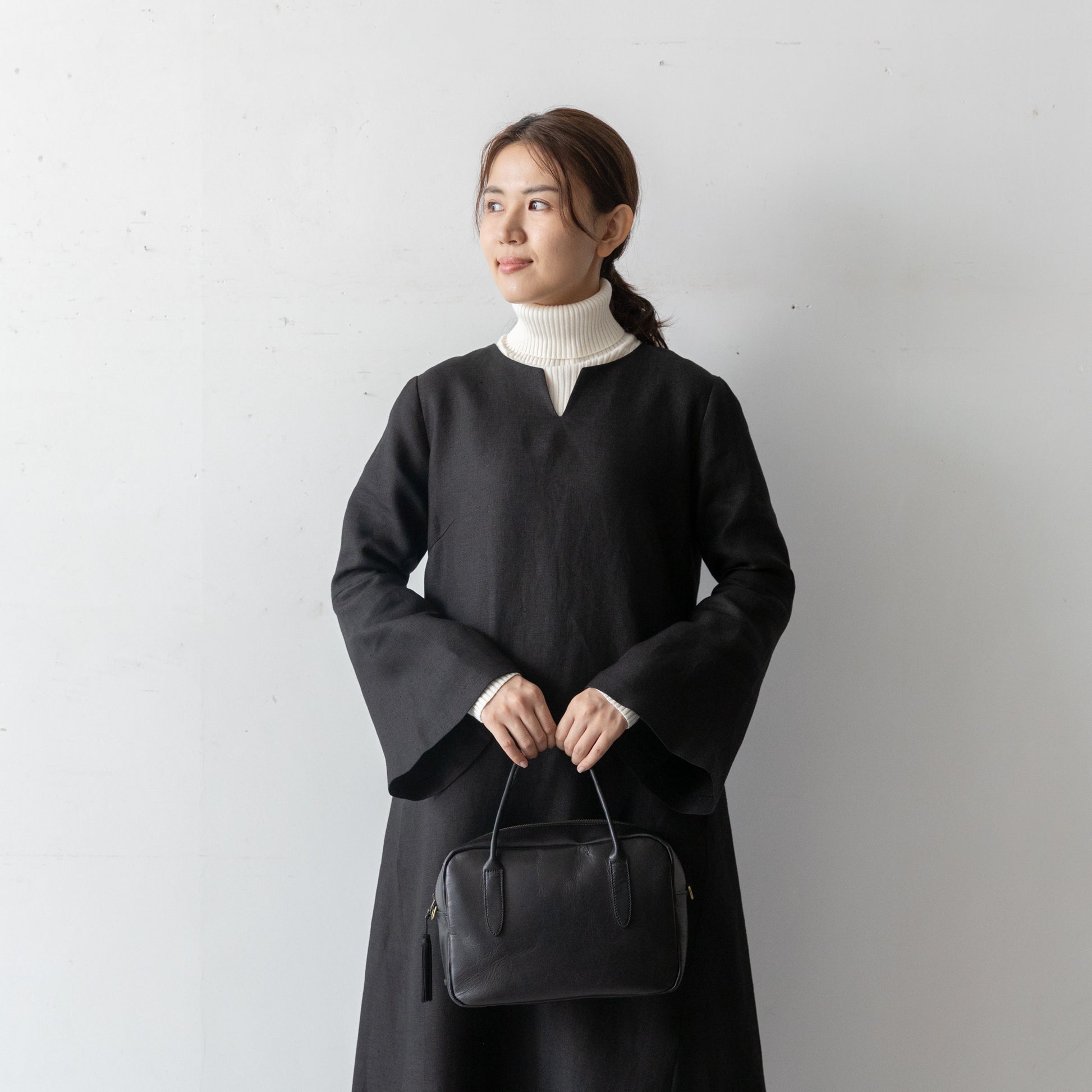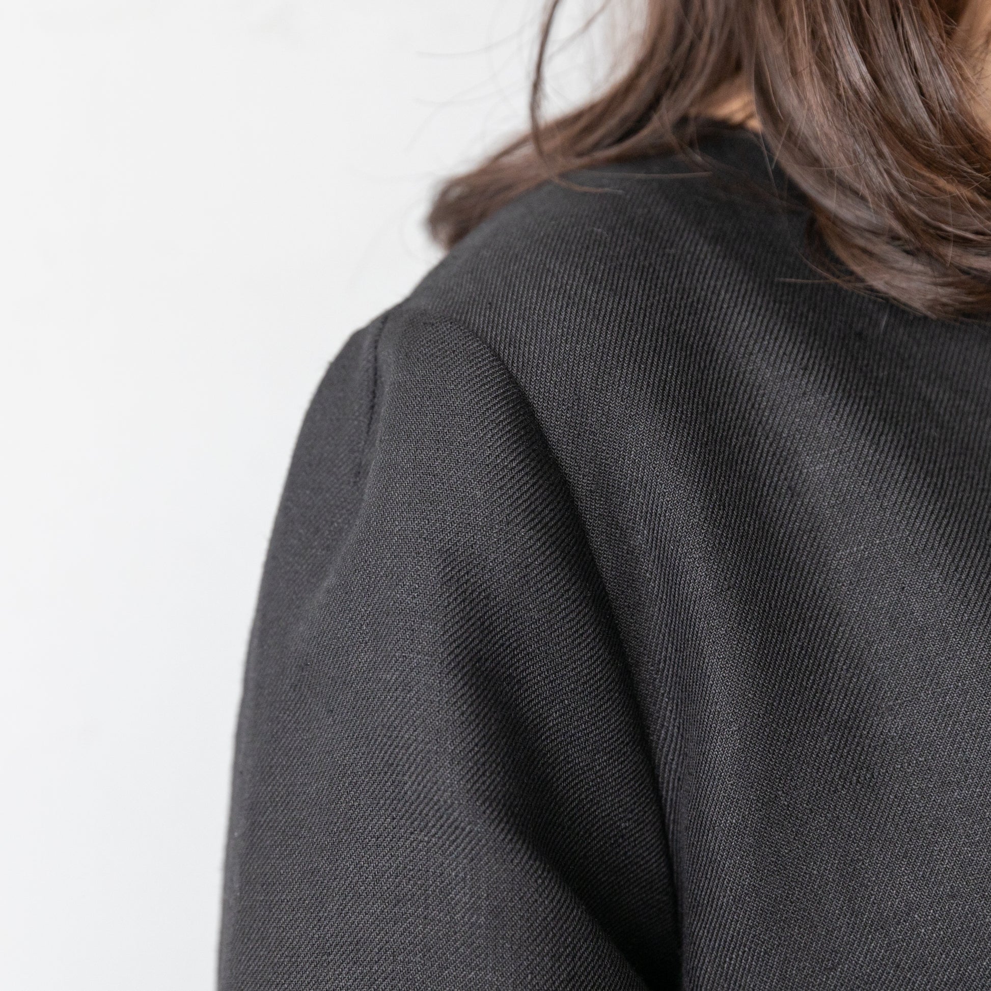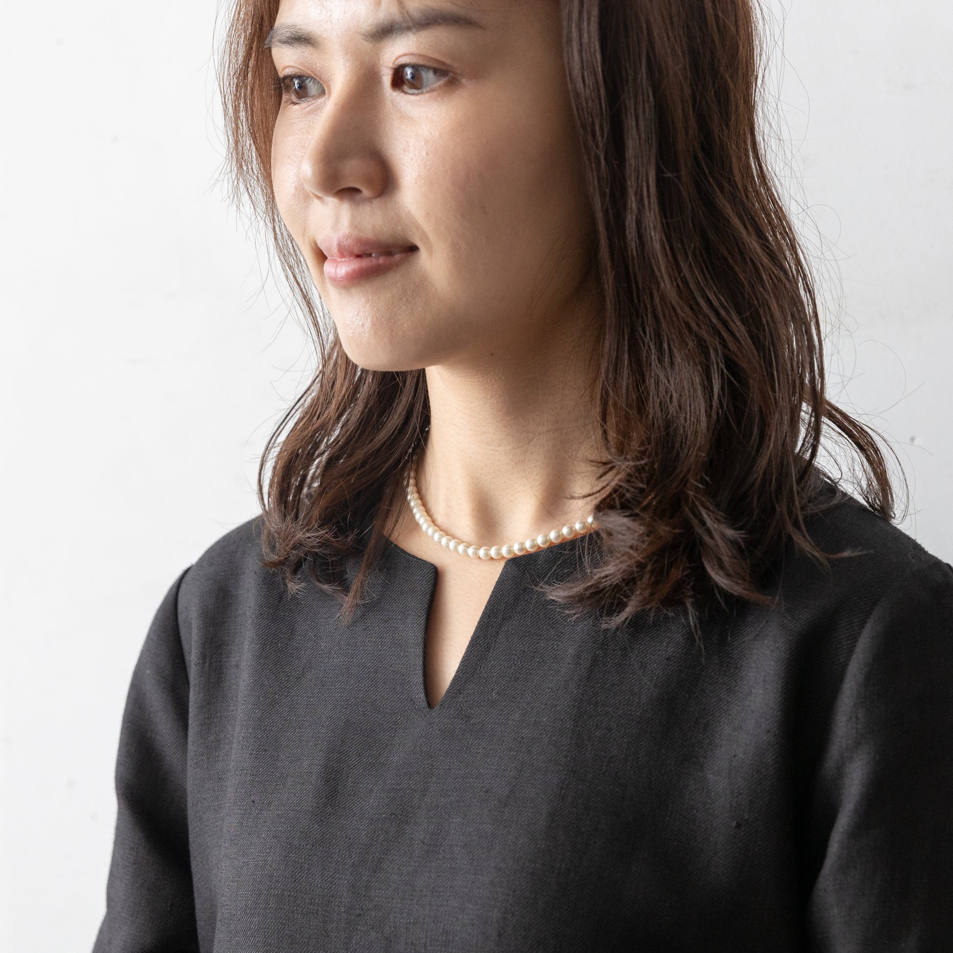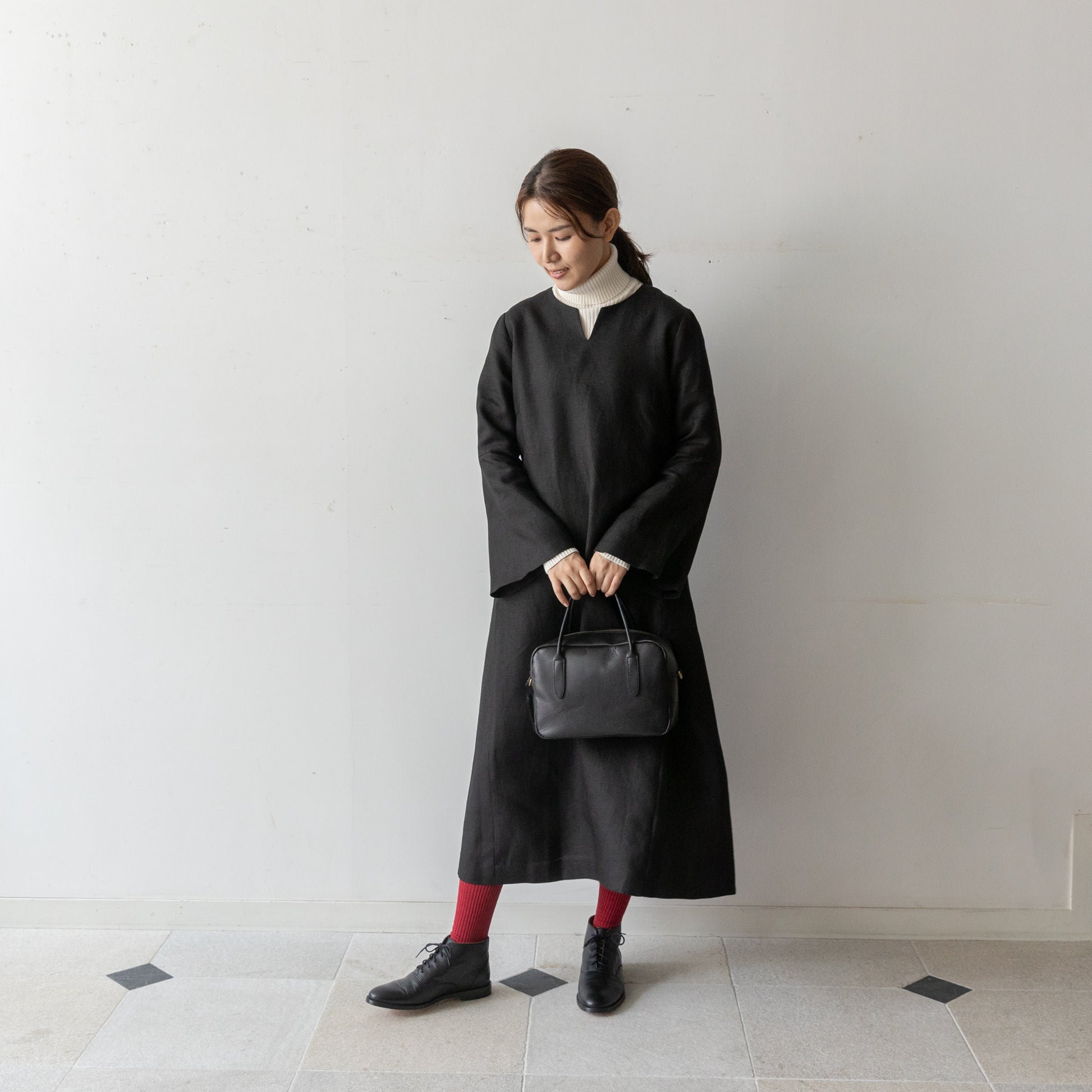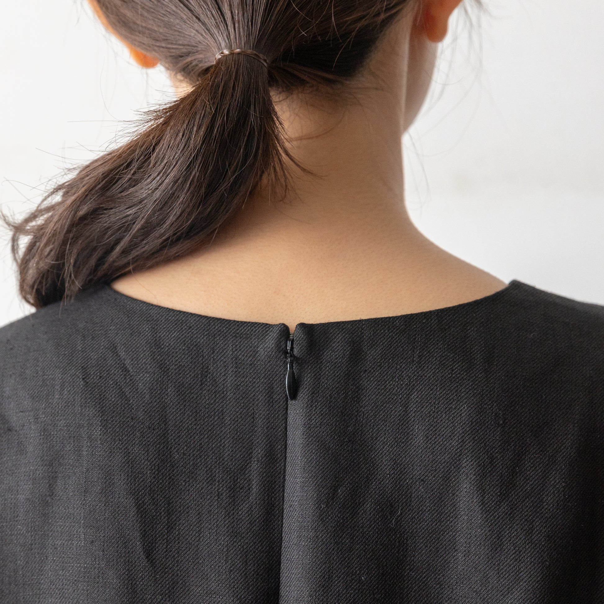 控えめな光沢の黒色のリネン地は華やかなアクセサリーをより引き立たせます。1枚ではもちろん、タートルニットと重ねてカジュアルに。