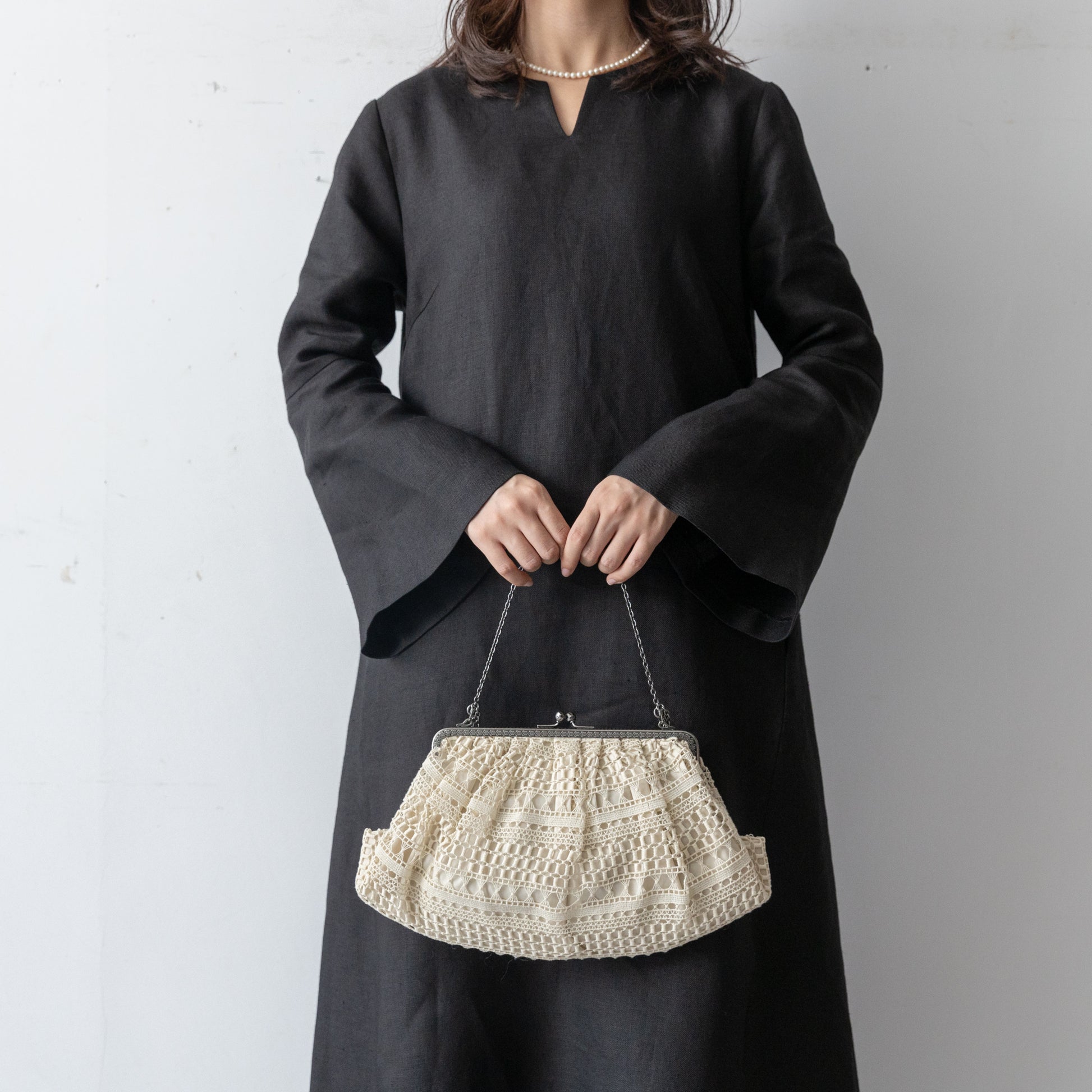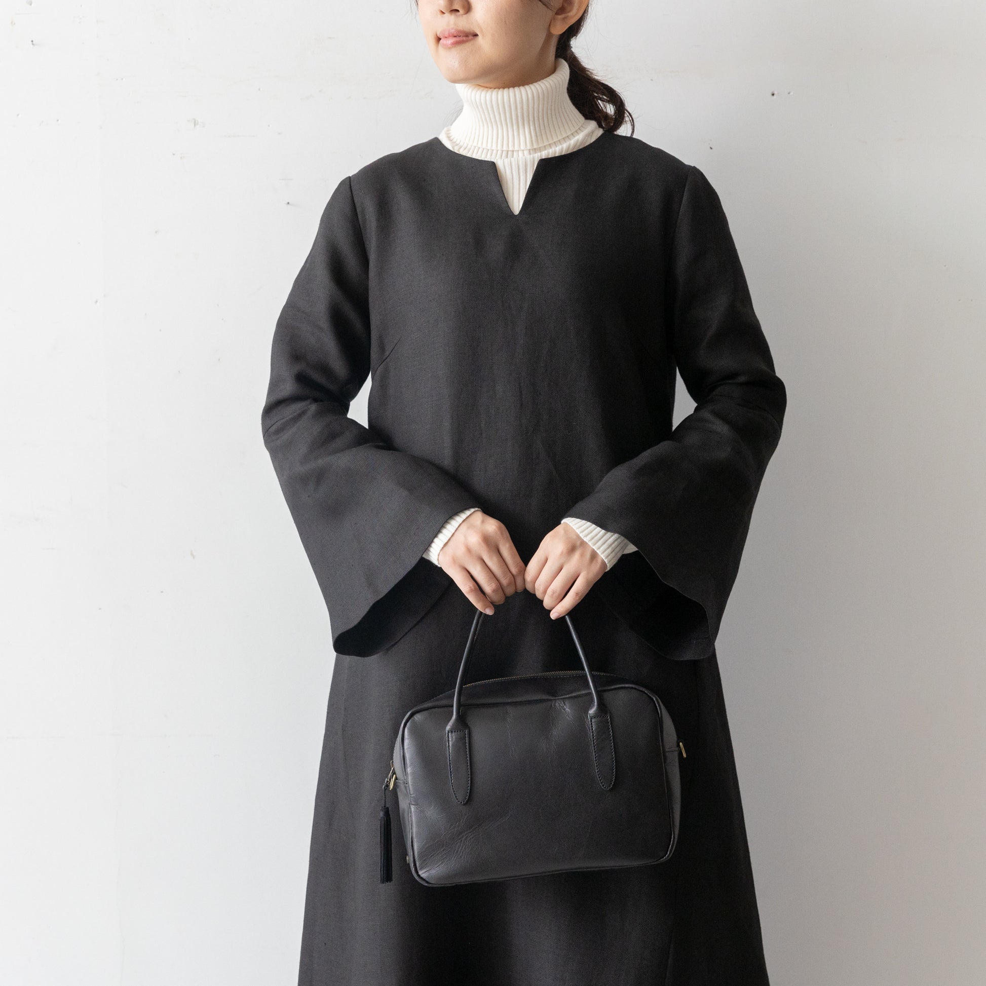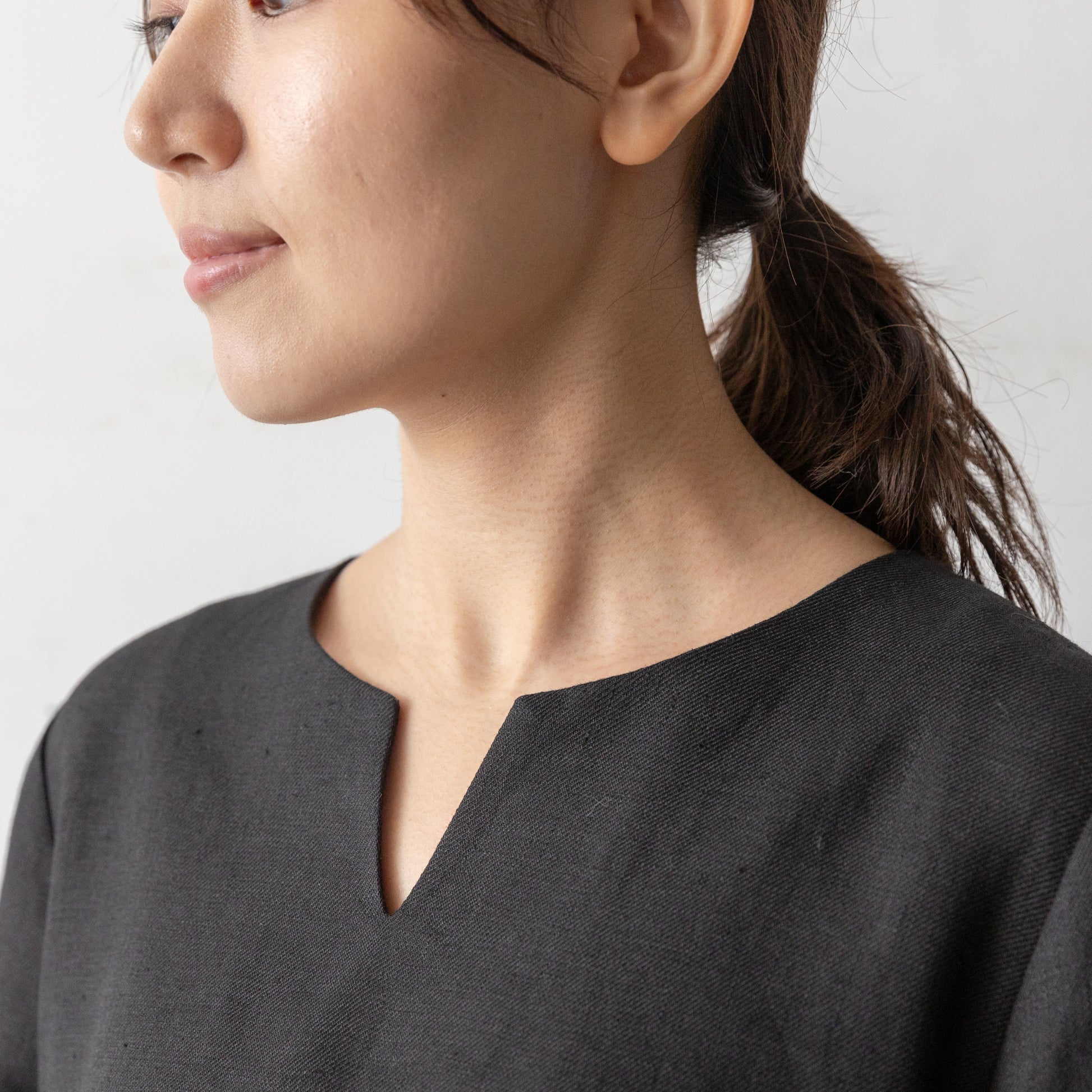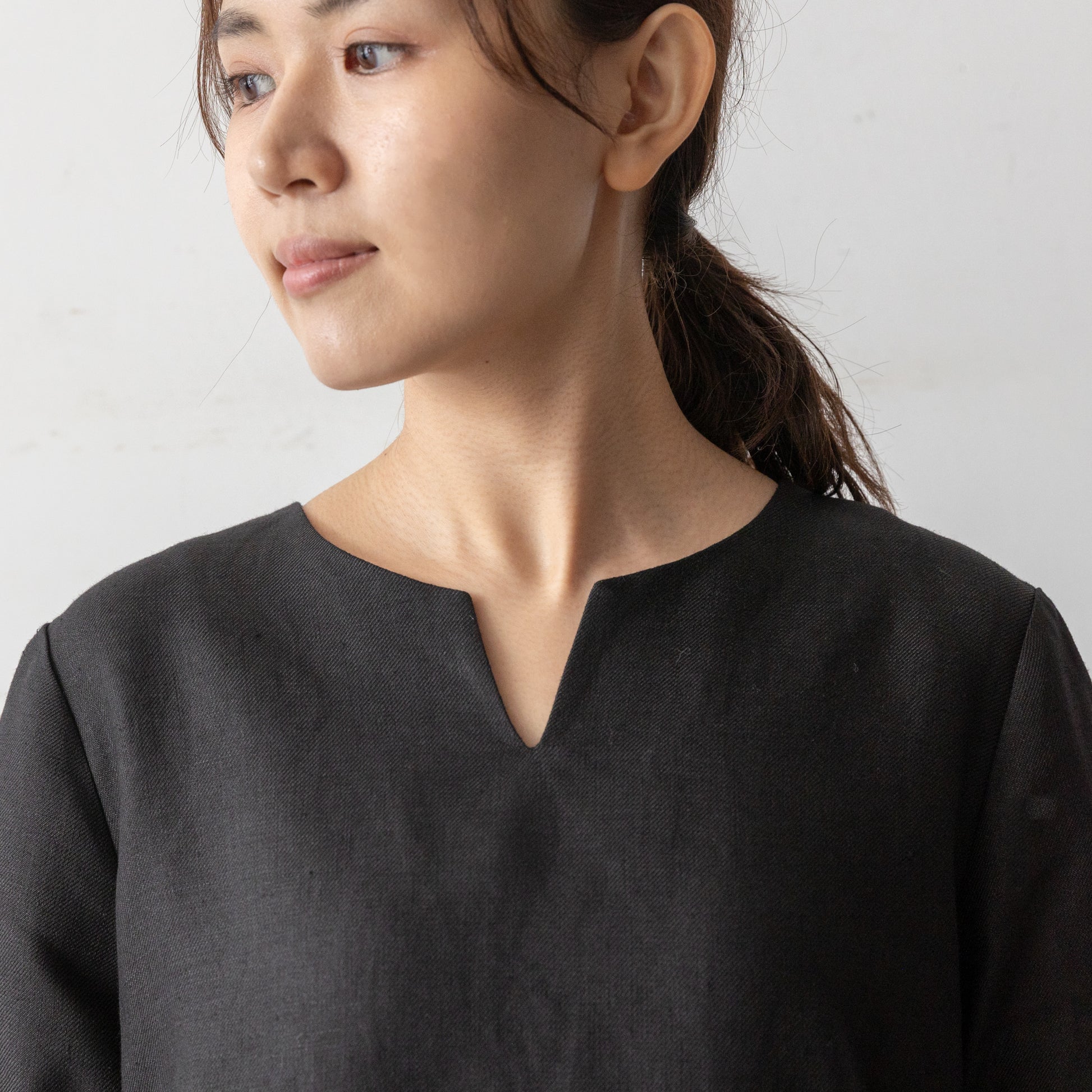 控えめな光沢の黒色のリネン地は華やかなアクセサリーをより引き立たせます。1枚ではもちろん、タートルニットと重ねてカジュアルに。