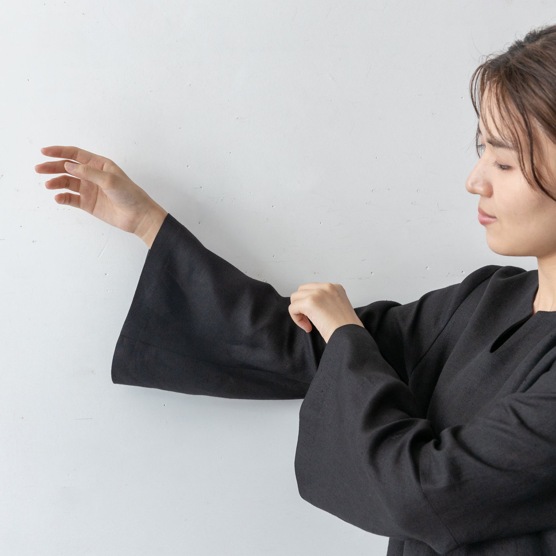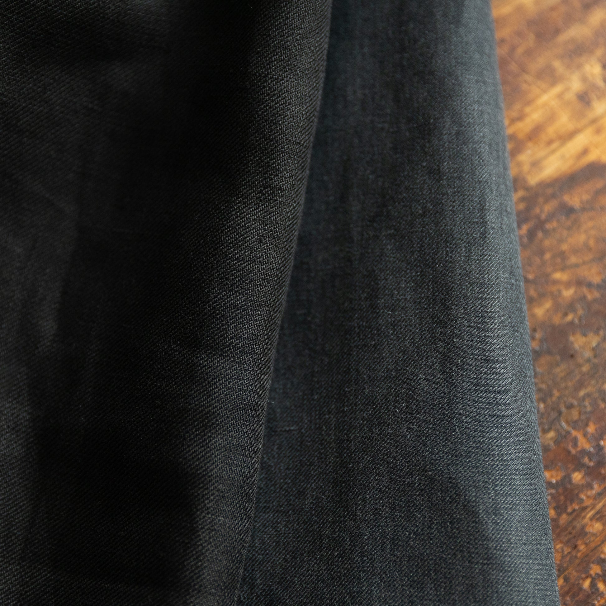 深い黒色の「ノアール」の生地は秋冬用の程よく厚みのあるリネン素材。▲ところどころに見られるネップは生地の風合いとしてお楽しみください
