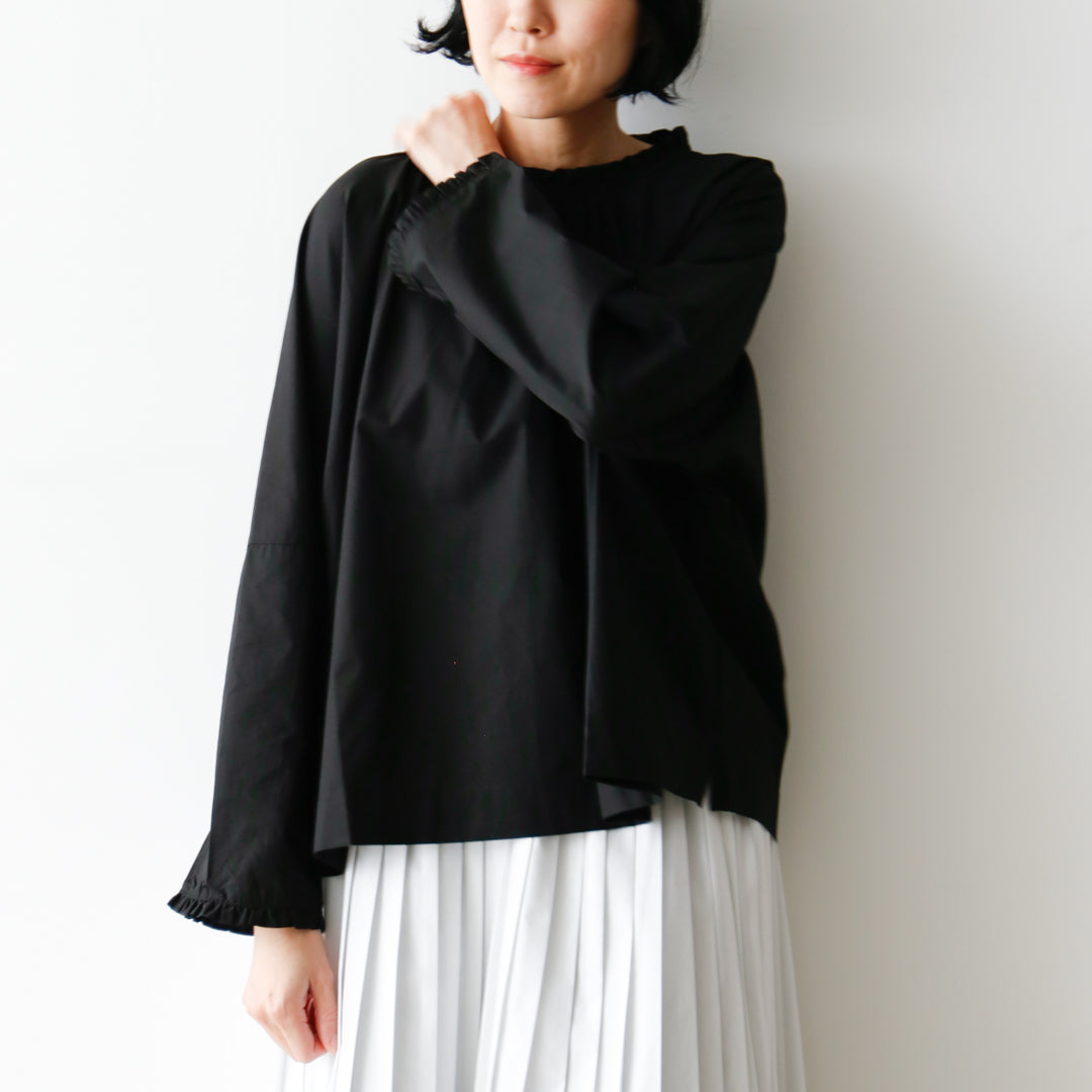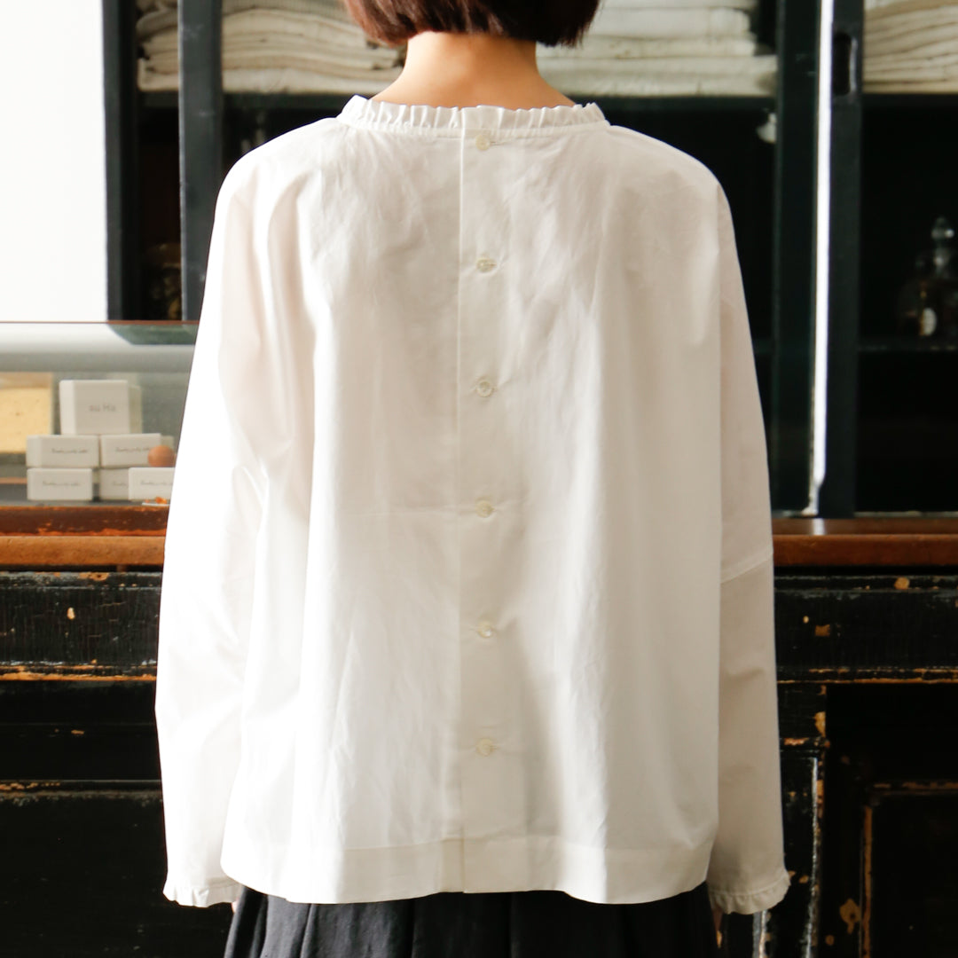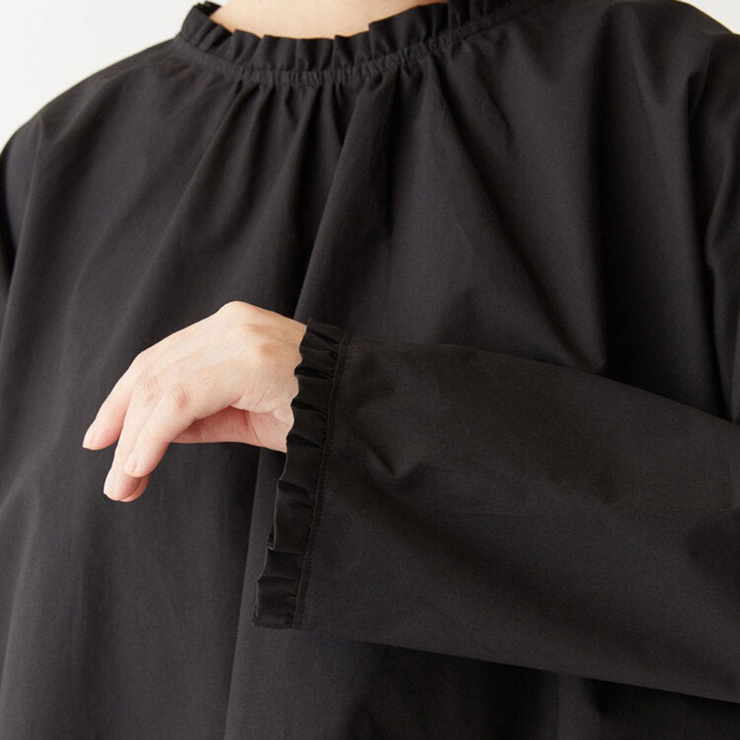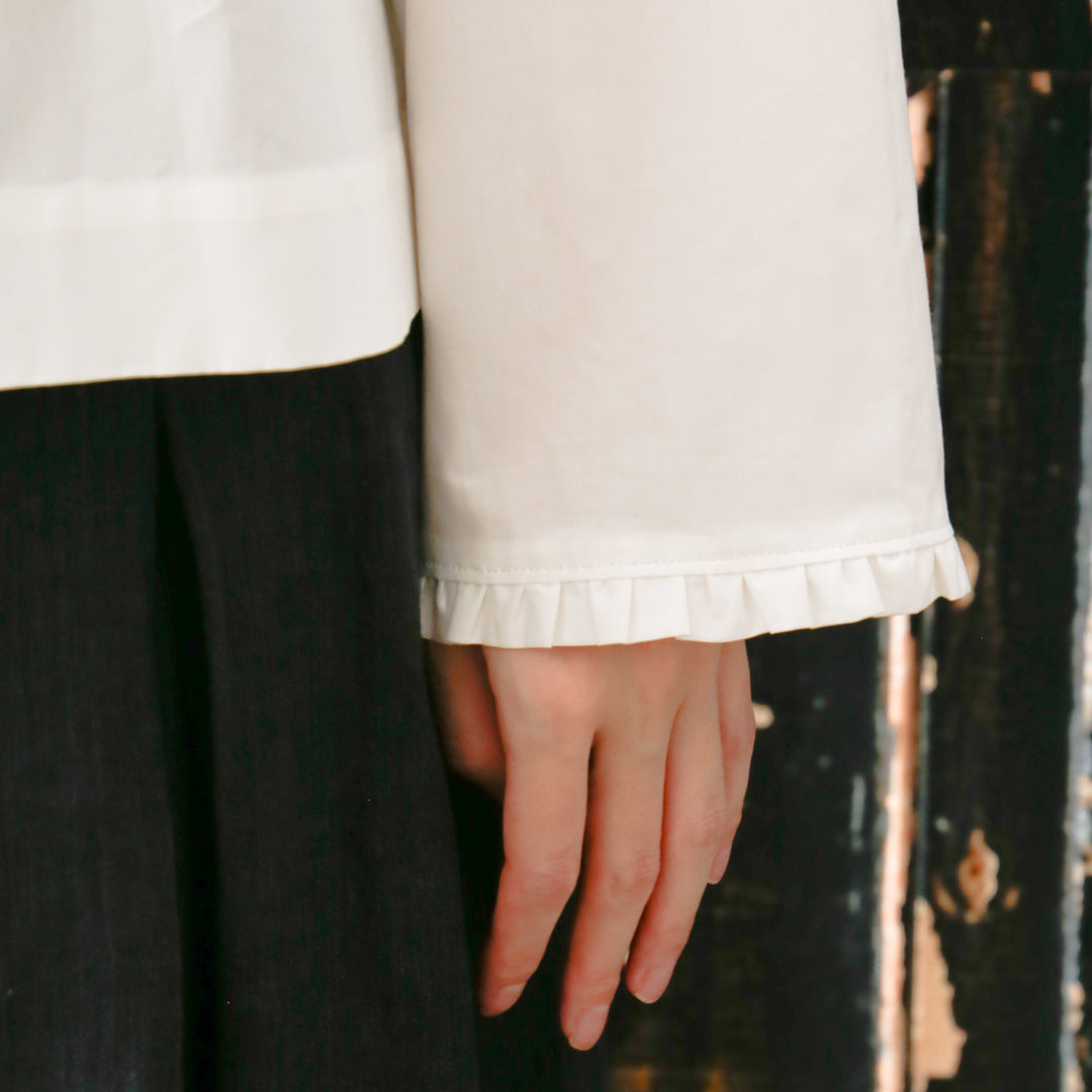 襟元と袖口にフリルを施し、ギャザーを寄せました。女性らしいデザインを散りばめつつ、パリッとした生地の質感と長めの袖でどこかモードな雰囲気も。