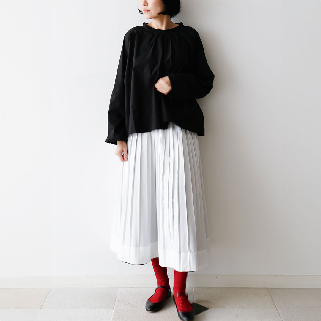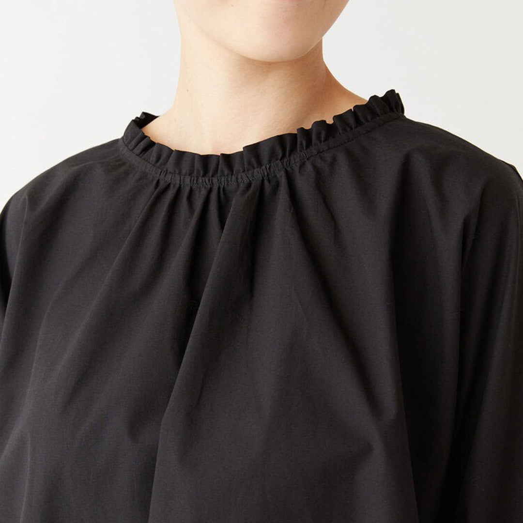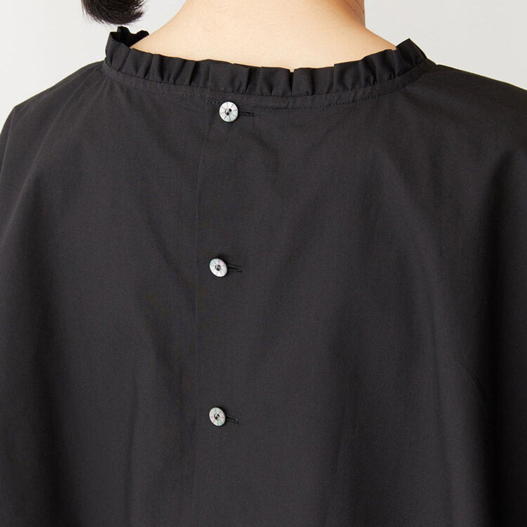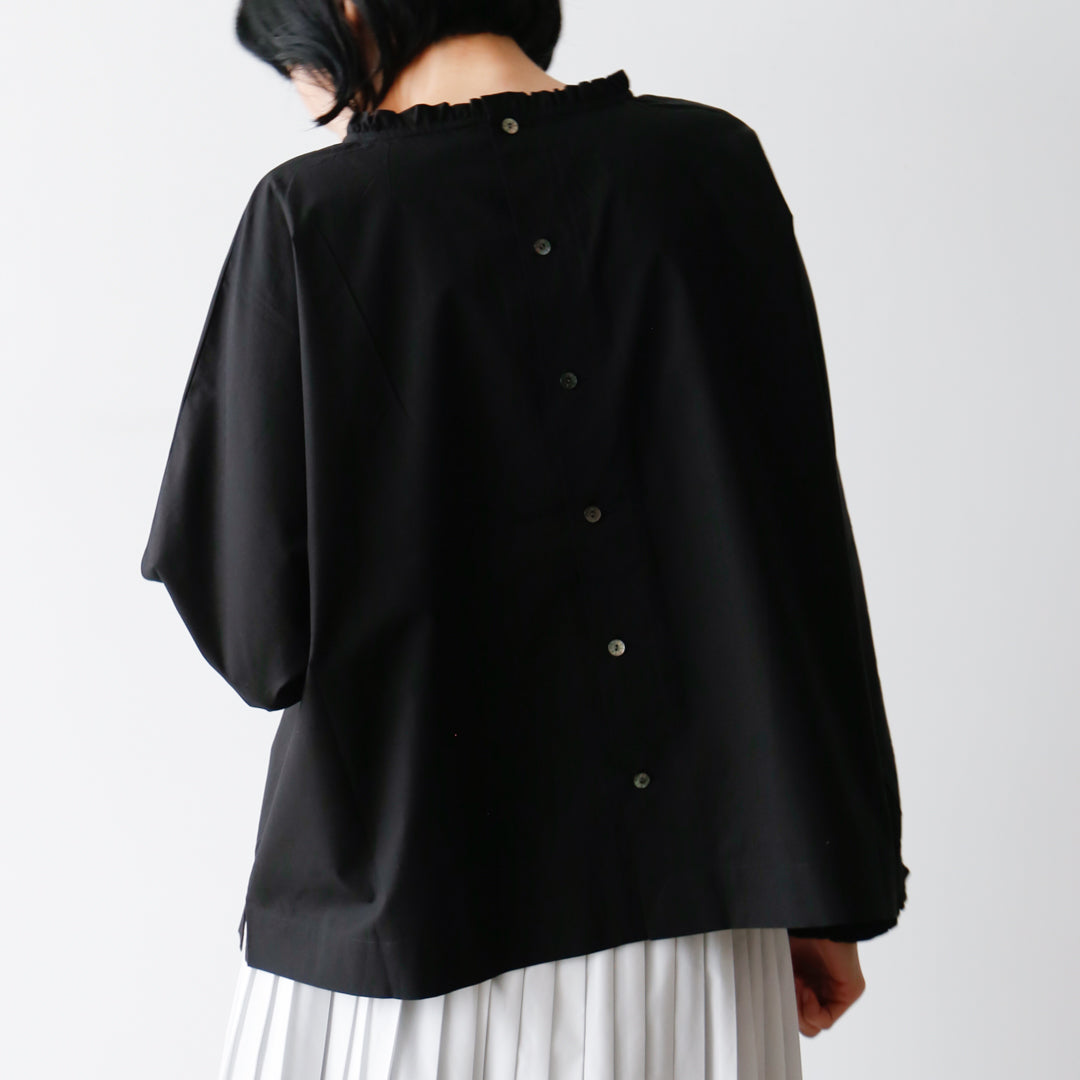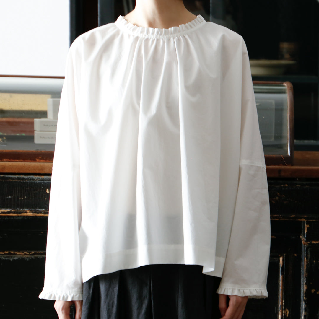 襟元と袖口にフリルを施し、ギャザーを寄せました。女性らしいデザインを散りばめつつ、パリッとした生地の質感と長めの袖でどこかモードな雰囲気も。