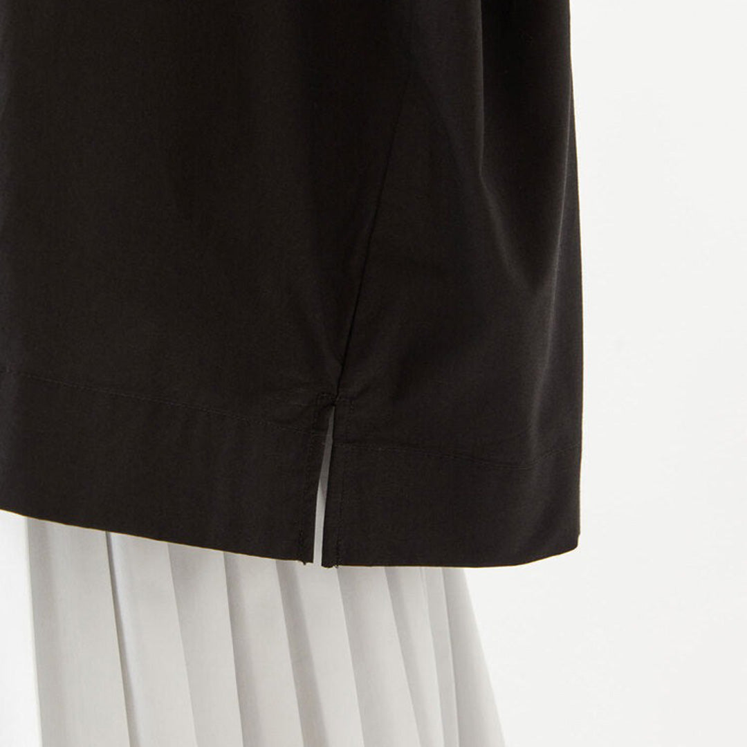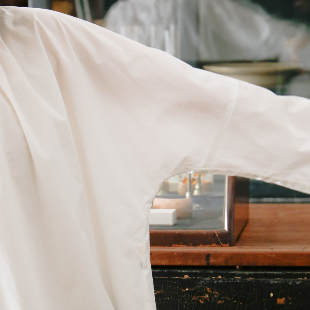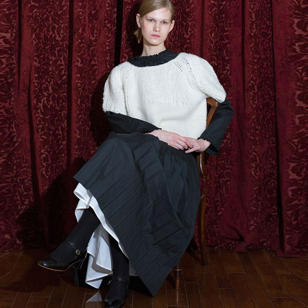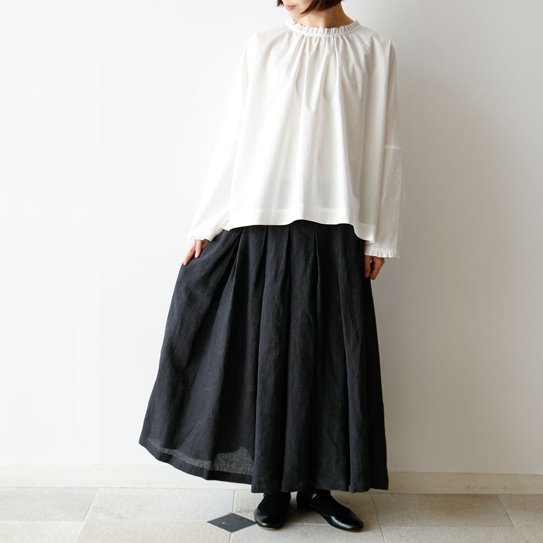 襟元と袖口にフリルを施し、ギャザーを寄せました。女性らしいデザインを散りばめつつ、パリッとした生地の質感と長めの袖でどこかモードな雰囲気も。