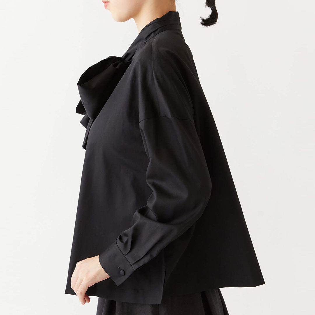 ボリュームのある襟元のおかげでアクセサリーいらずの華やかさ。リボン結びで女性らしく、片結びにして上品かつハンサムに。結び方で印象を変えて楽しめます。