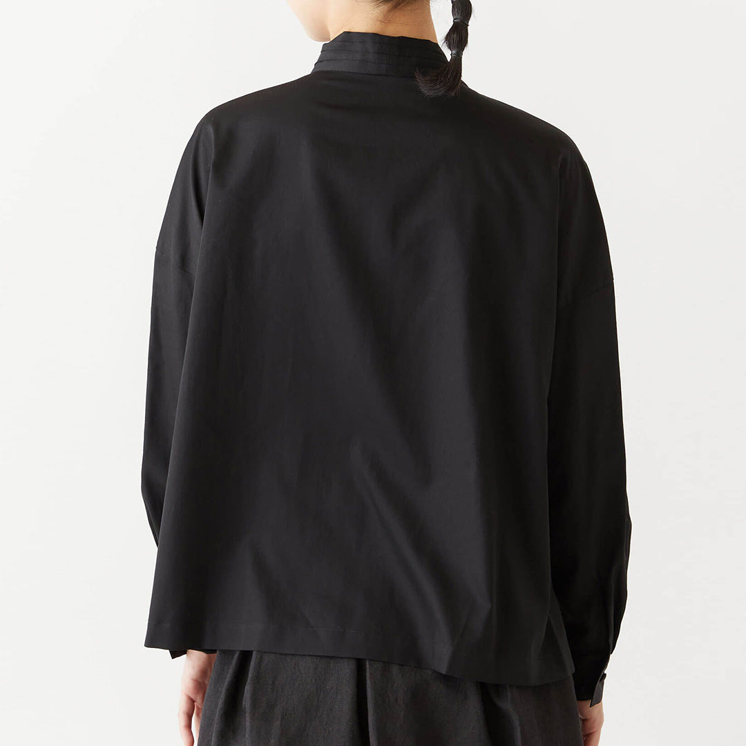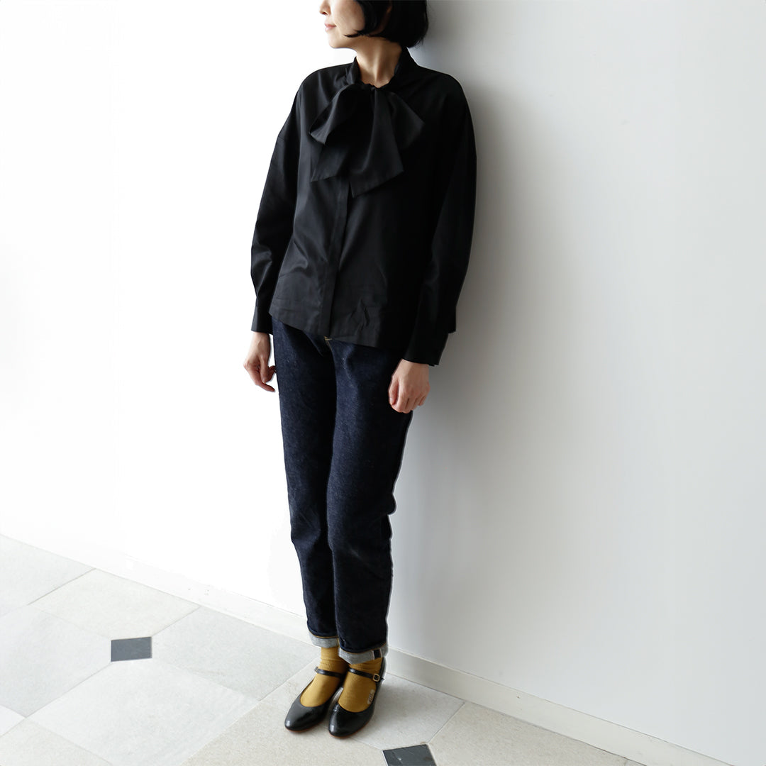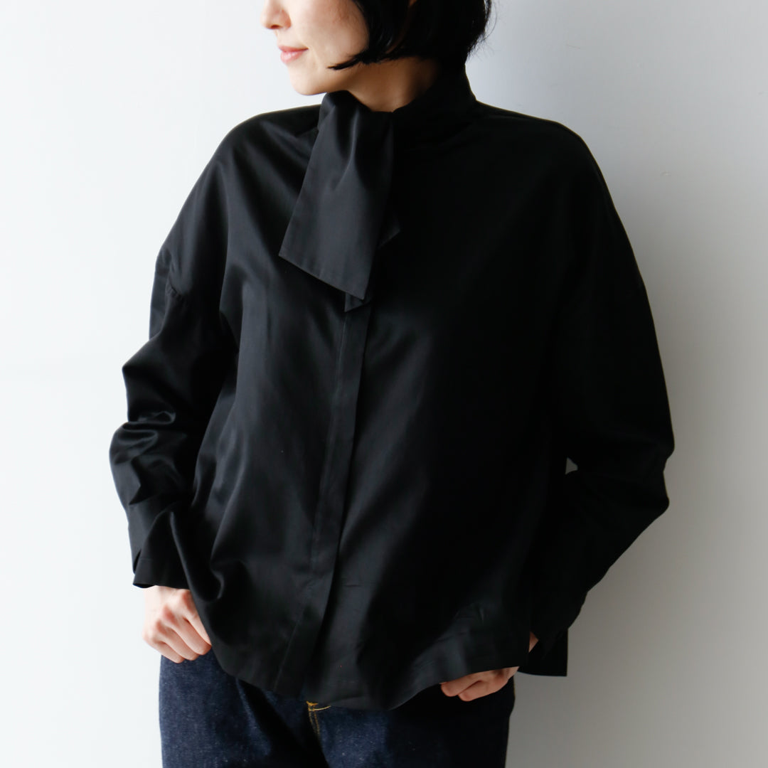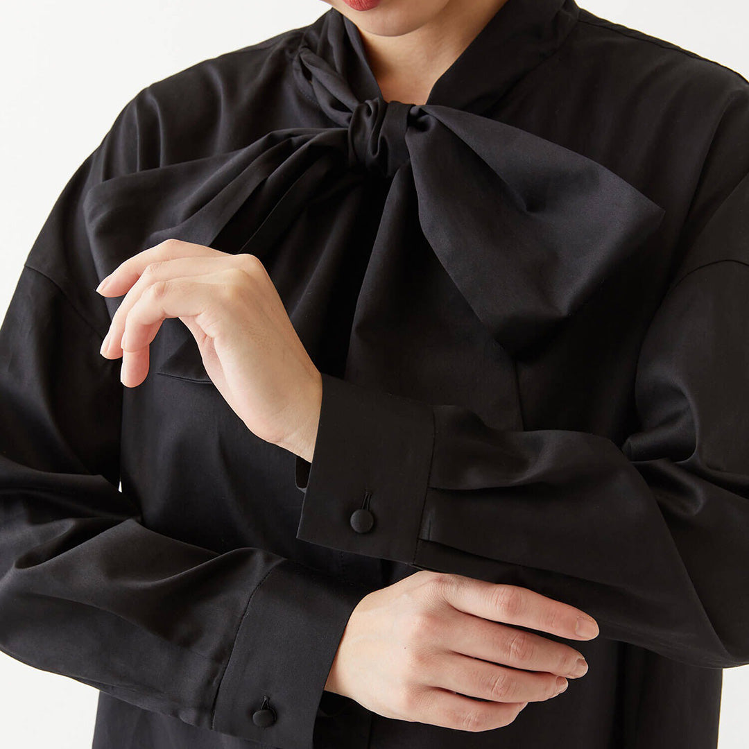 オンオフ問わず活躍する、コットンサテンのボウタイブラウス。
