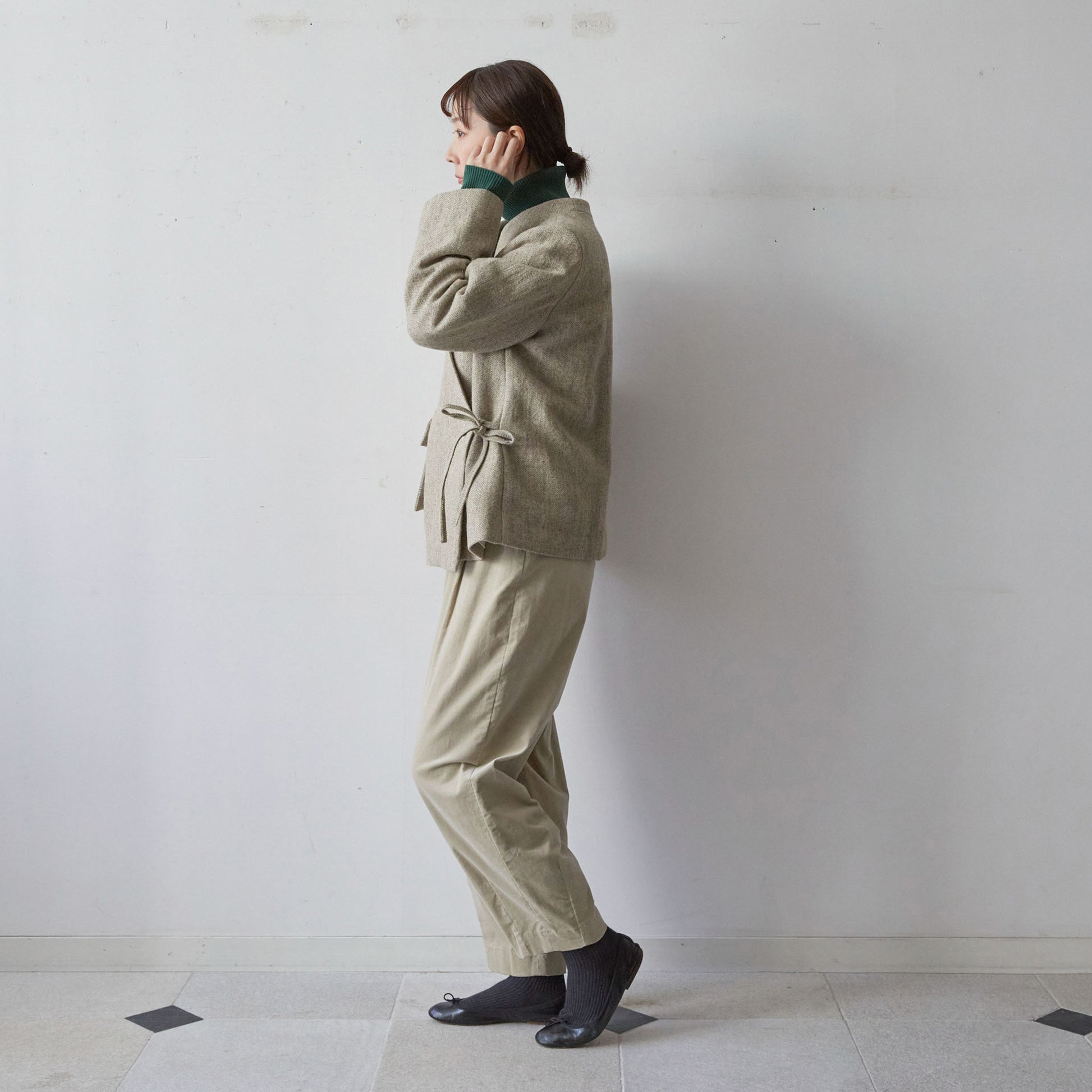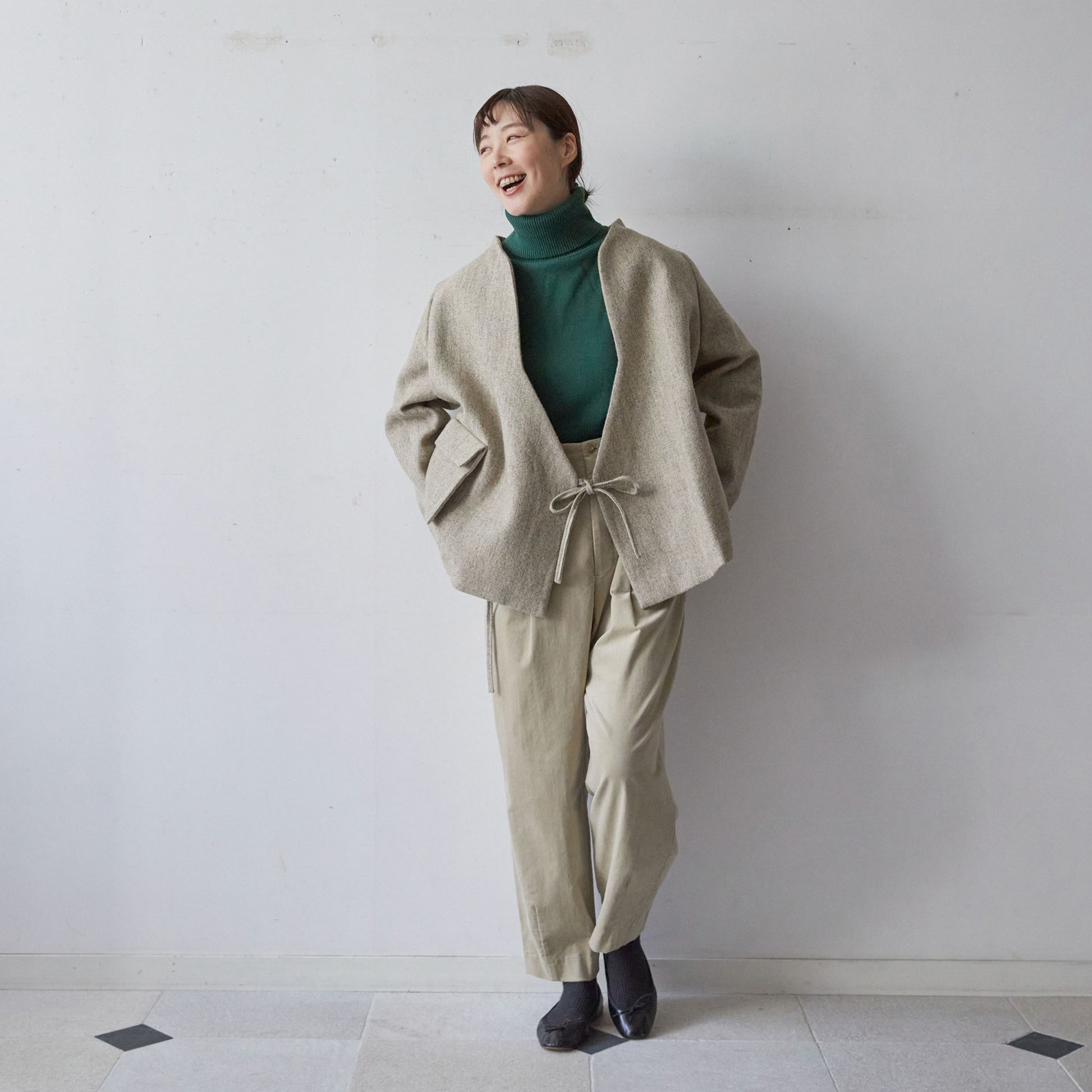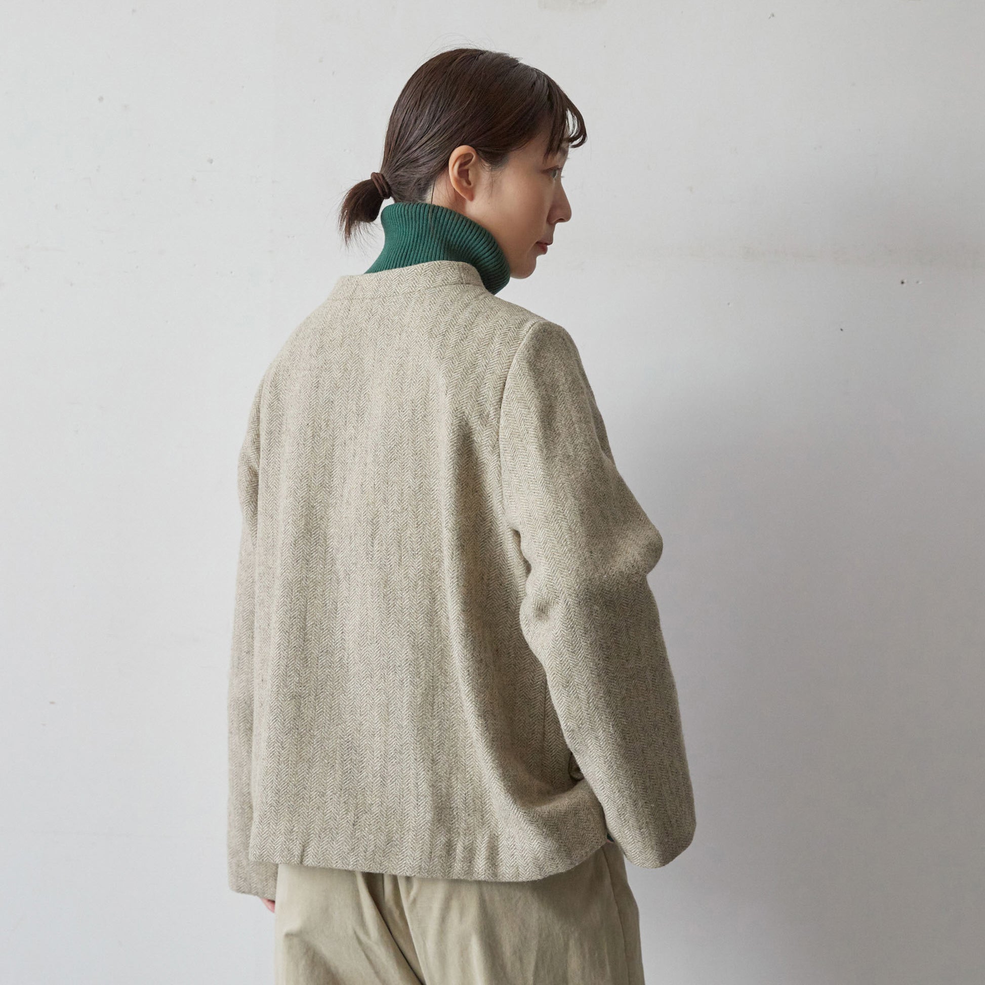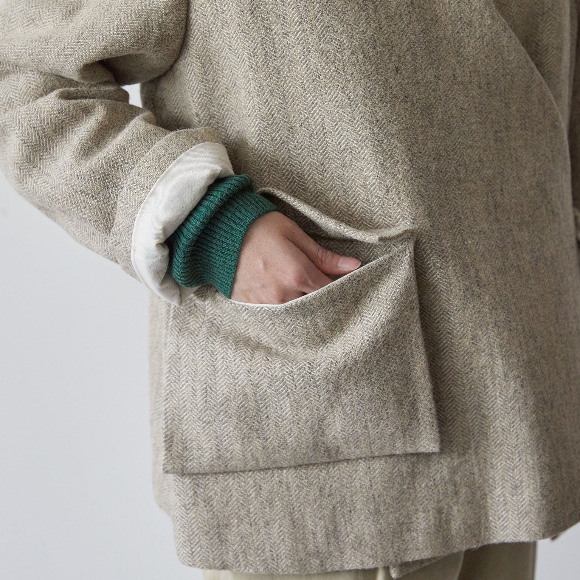 生地は尾州で織られた、リネンウールのヘリンボーン。ウールのあたたかい風合いと、リネンのくったりとしたやわらかさを持ち合わせています。