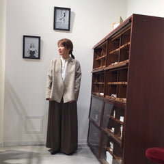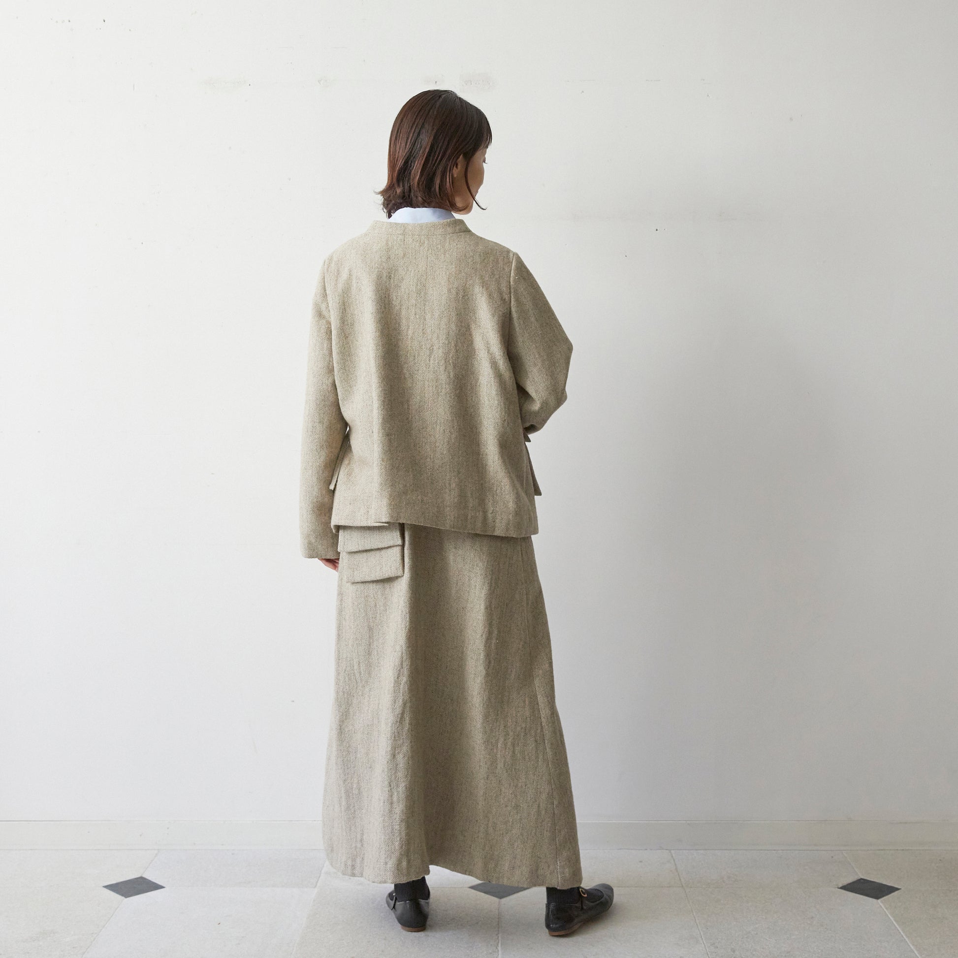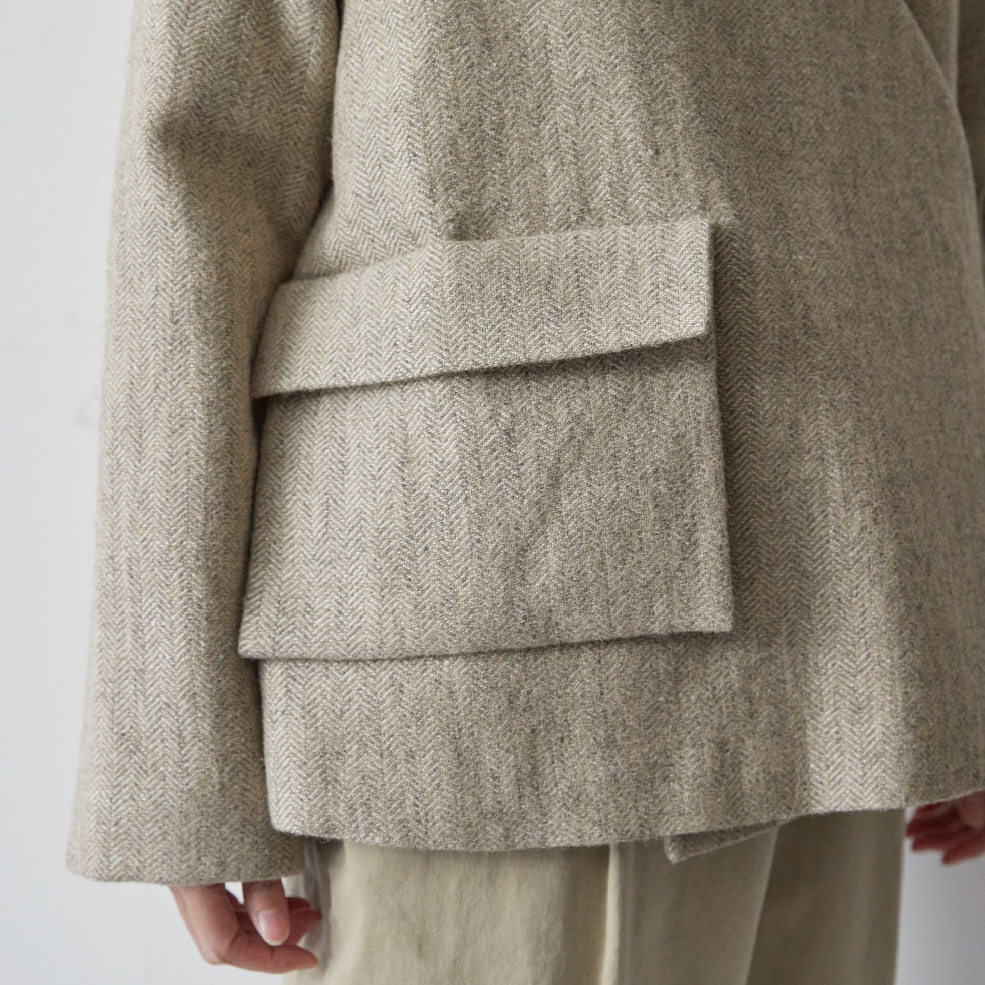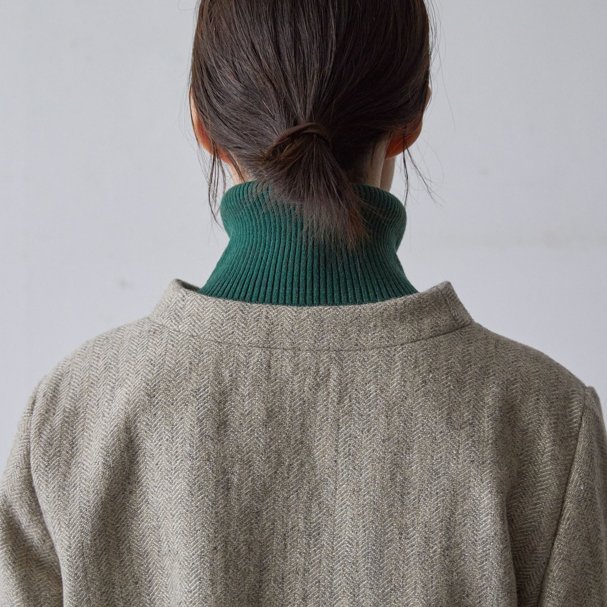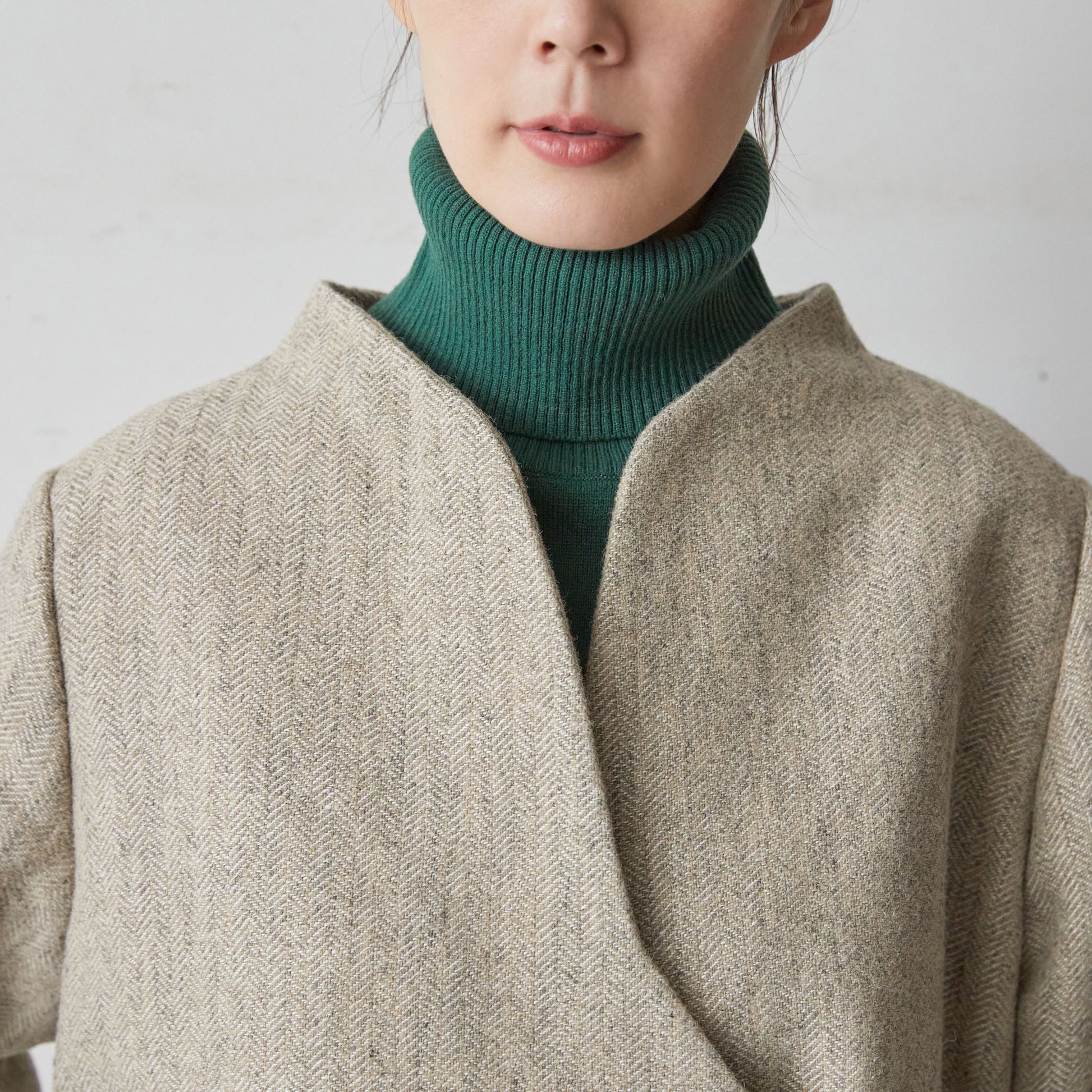 生地は尾州で織られた、リネンウールのヘリンボーン。ウールのあたたかい風合いと、リネンのくったりとしたやわらかさを持ち合わせています。