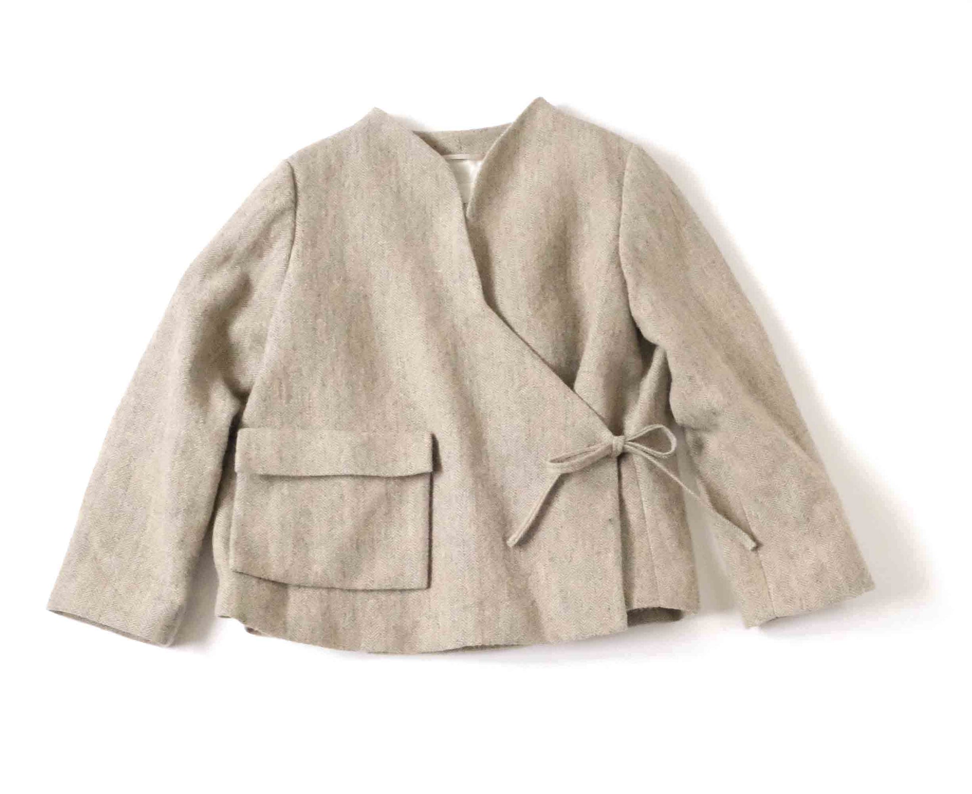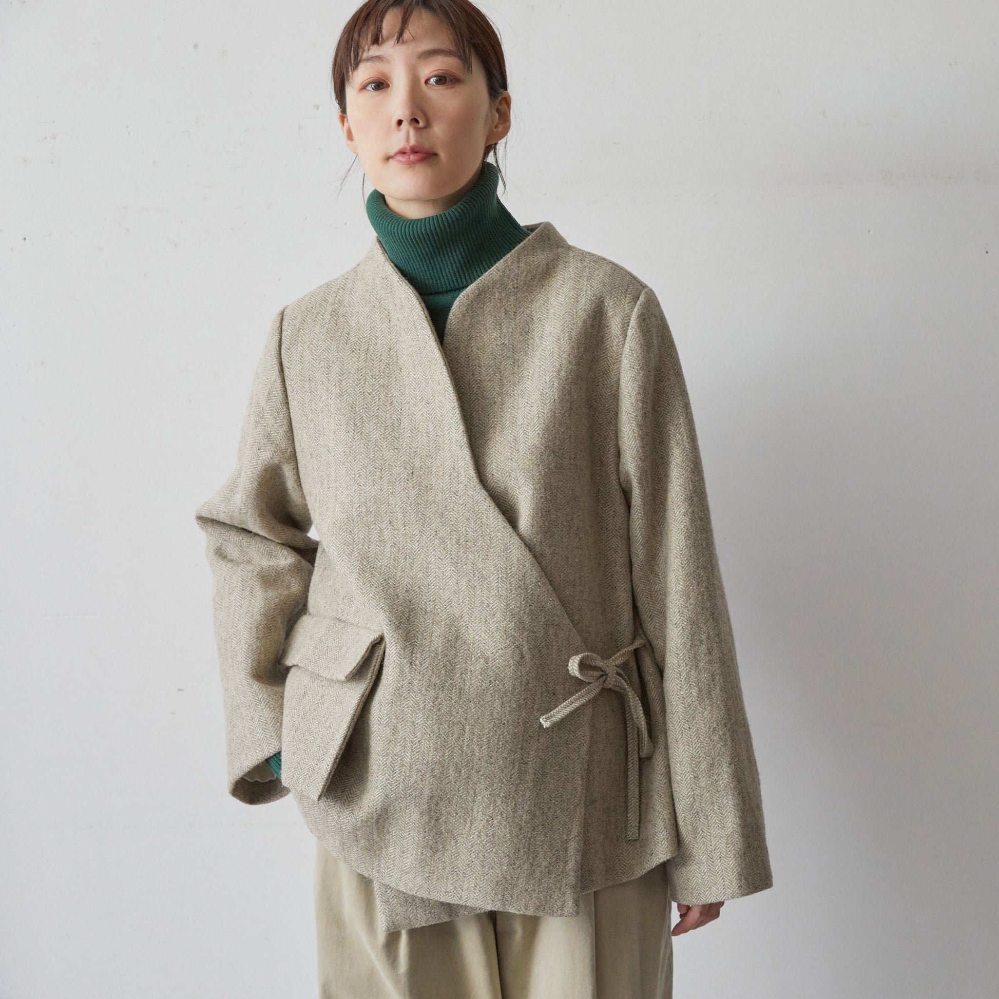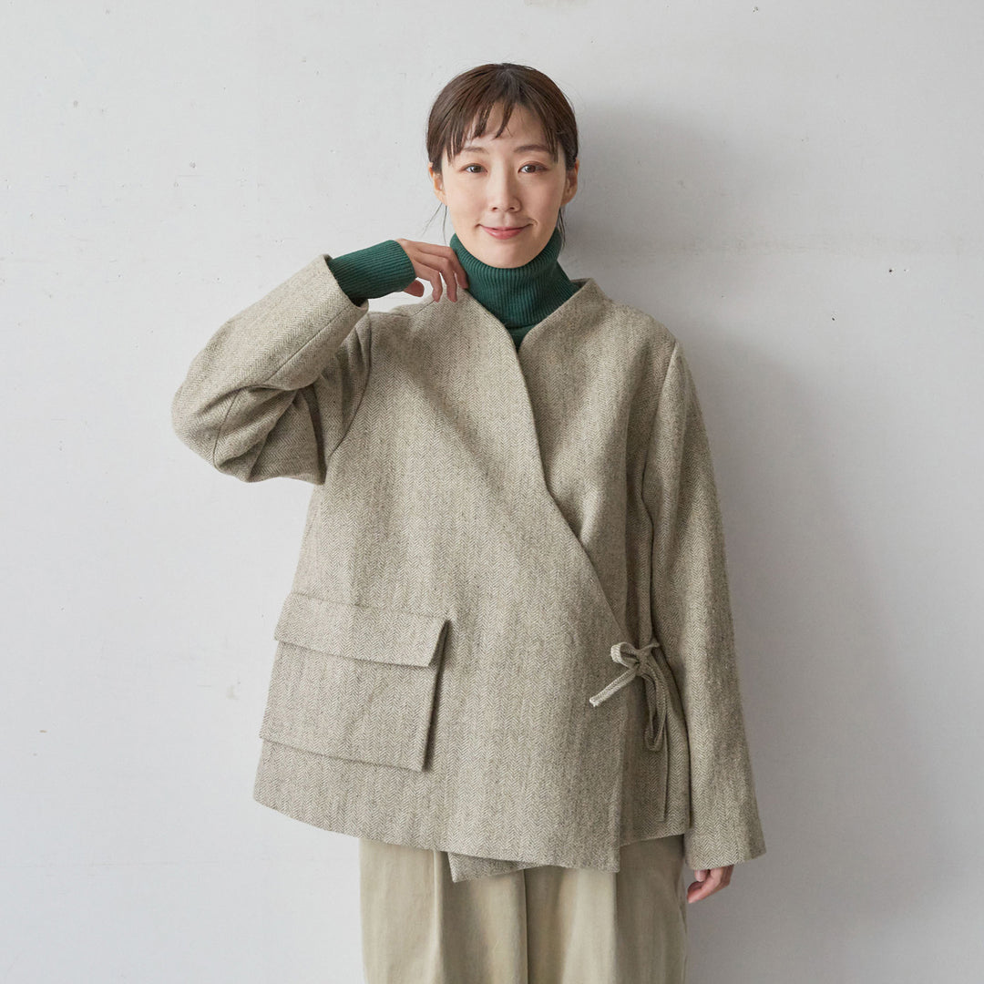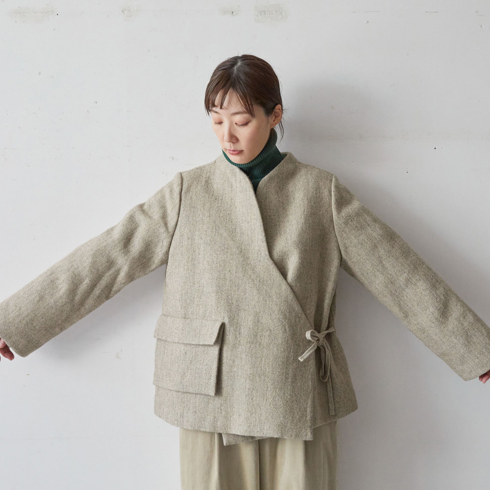 ヘリンボーン織のリネンウールで仕立てた、カシュクールジャケット「フランソワ」をご紹介します。バルキーな生地は尾州で織られた日本製。薄く中綿が入った、とてもあたたかいジャケットです。スカート「ピエール」とのセットアップも楽しめる、コーディネートの幅が広がる一着です。