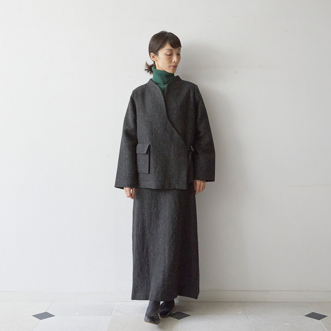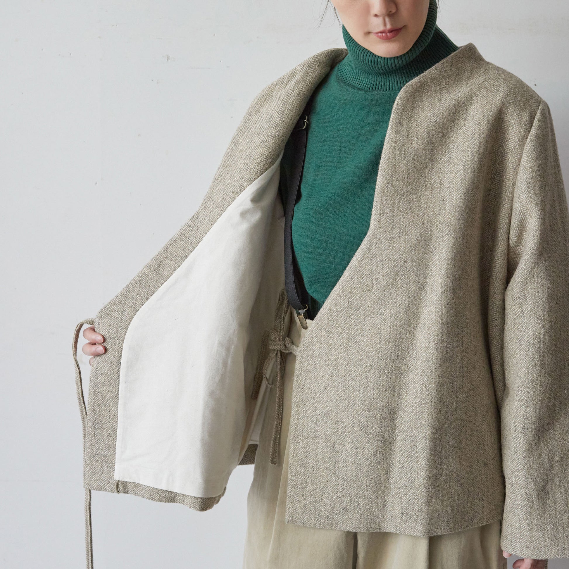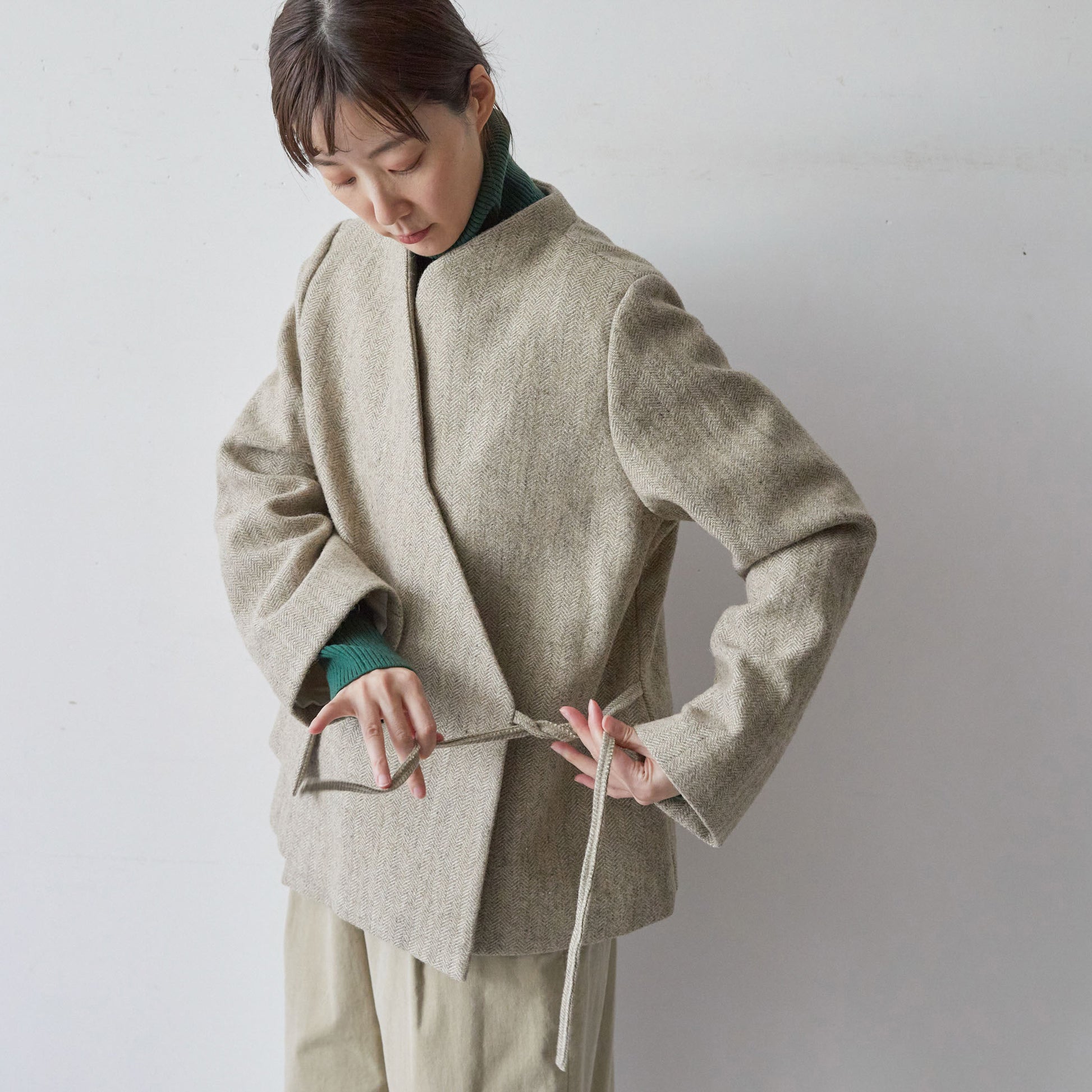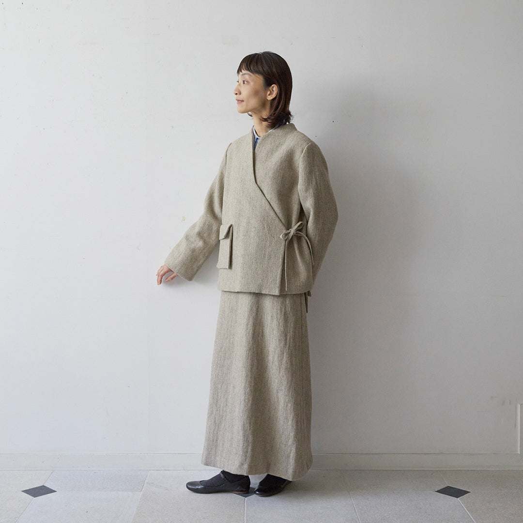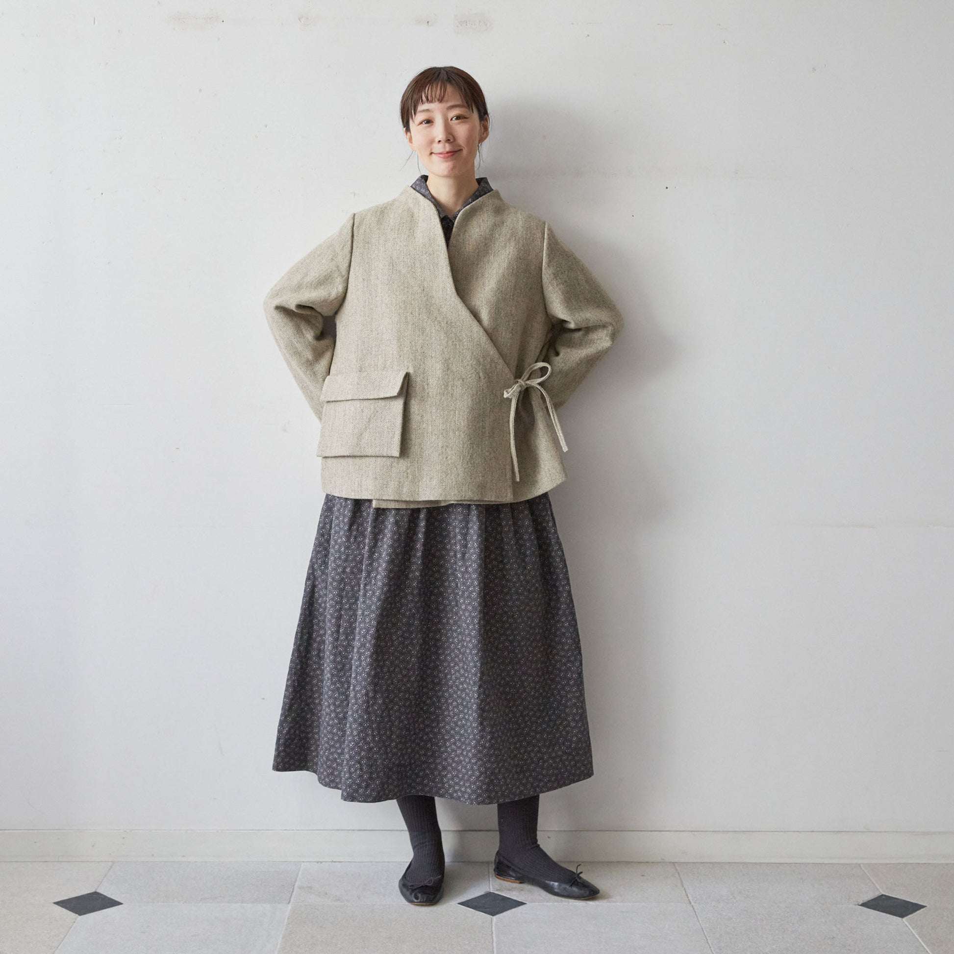 ヘリンボーン織のリネンウールで仕立てた、カシュクールジャケット「フランソワ」をご紹介します。バルキーな生地は尾州で織られた日本製。薄く中綿が入った、とてもあたたかいジャケットです。スカート「ピエール」とのセットアップも楽しめる、コーディネートの幅が広がる一着です。