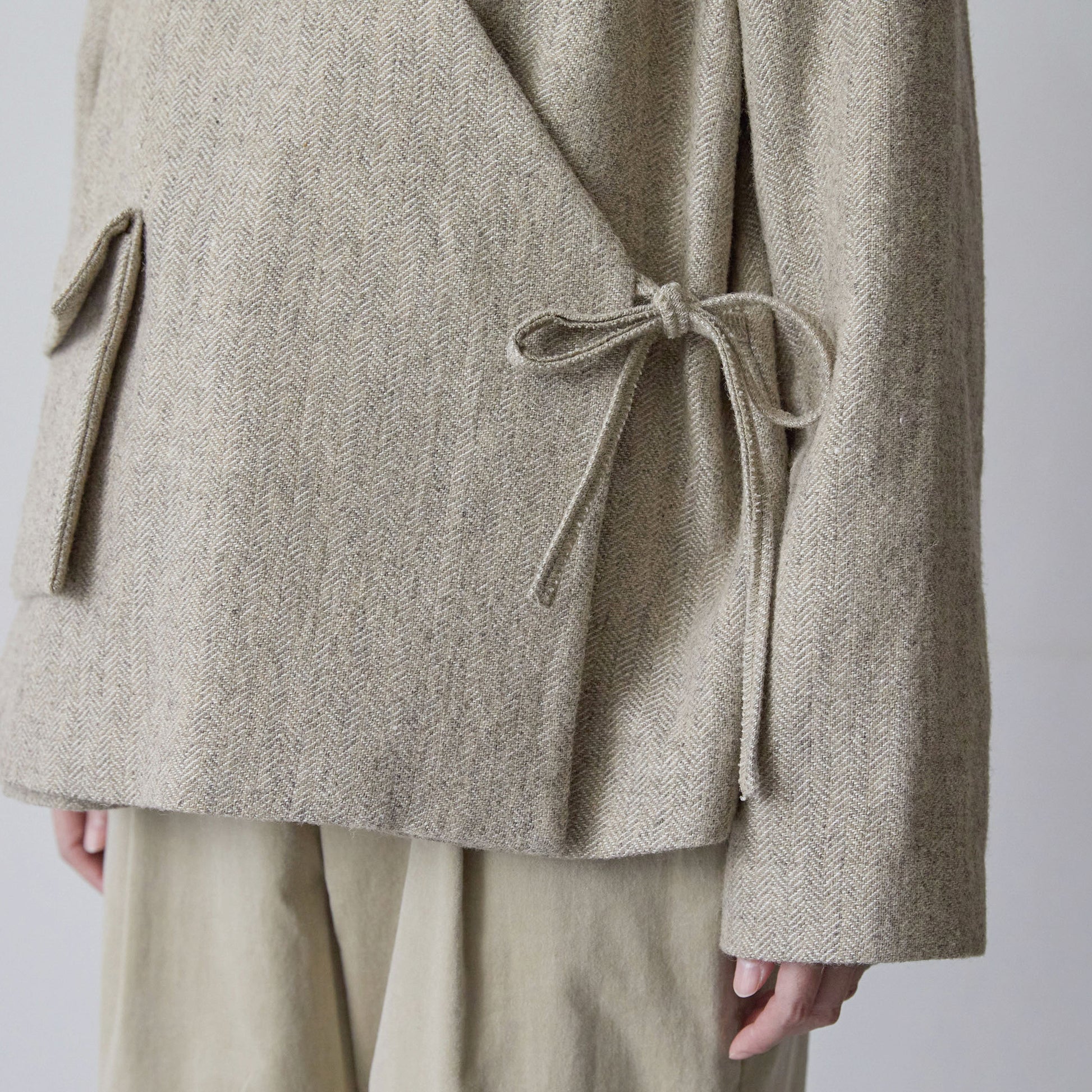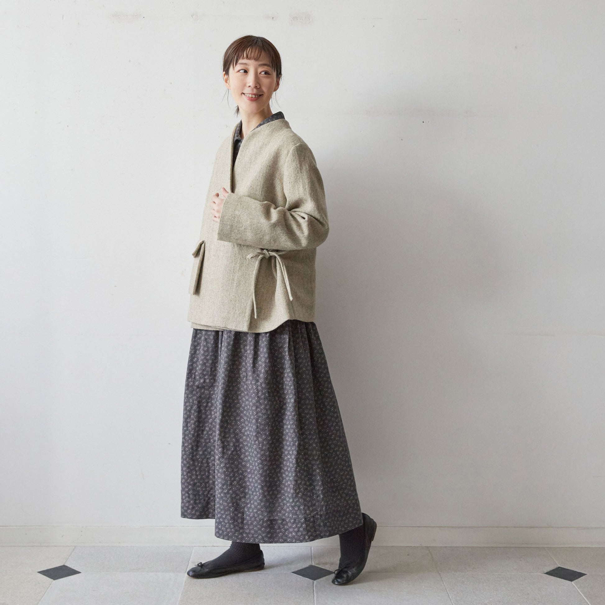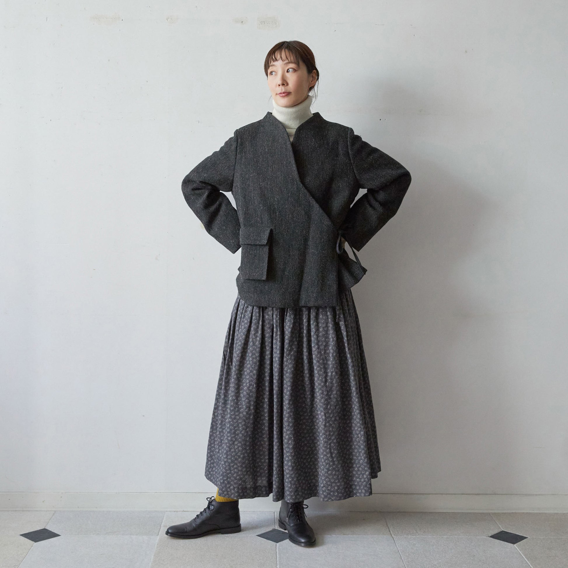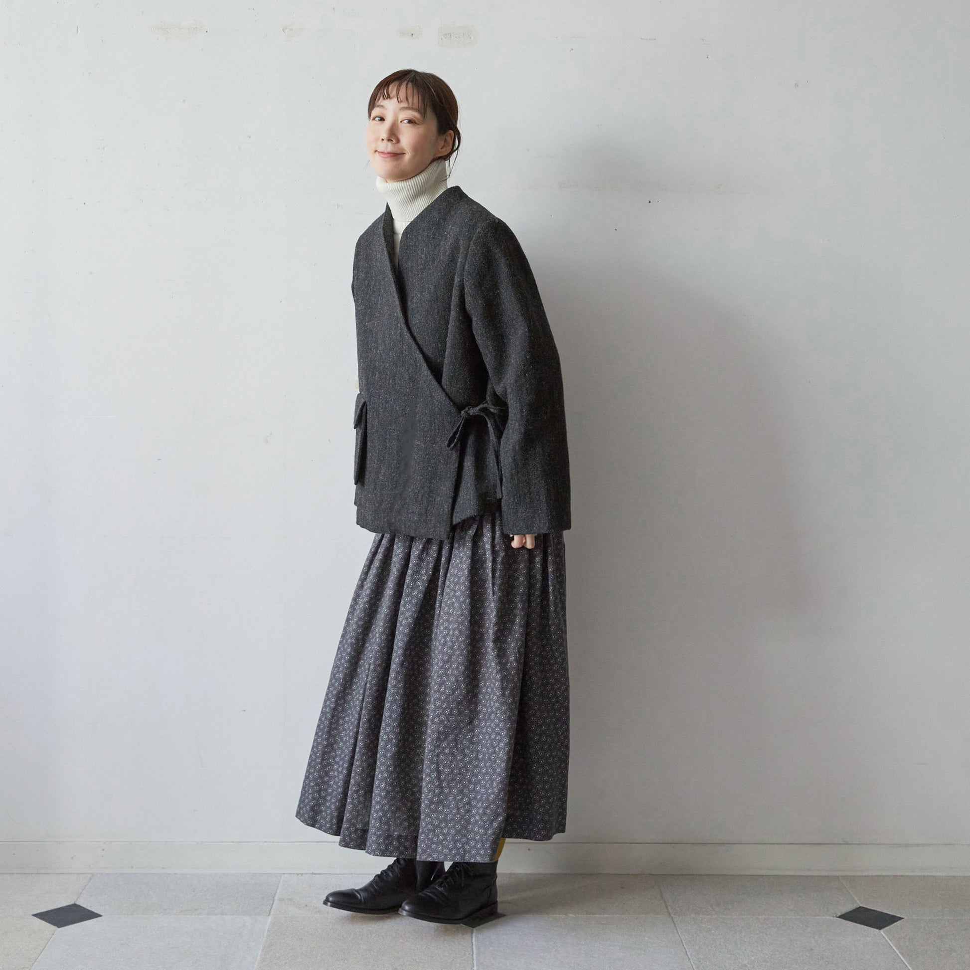 ヘリンボーン織のリネンウールで仕立てた、カシュクールジャケット「フランソワ」をご紹介します。バルキーな生地は尾州で織られた日本製。薄く中綿が入った、とてもあたたかいジャケットです。スカート「ピエール」とのセットアップも楽しめる、コーディネートの幅が広がる一着です。