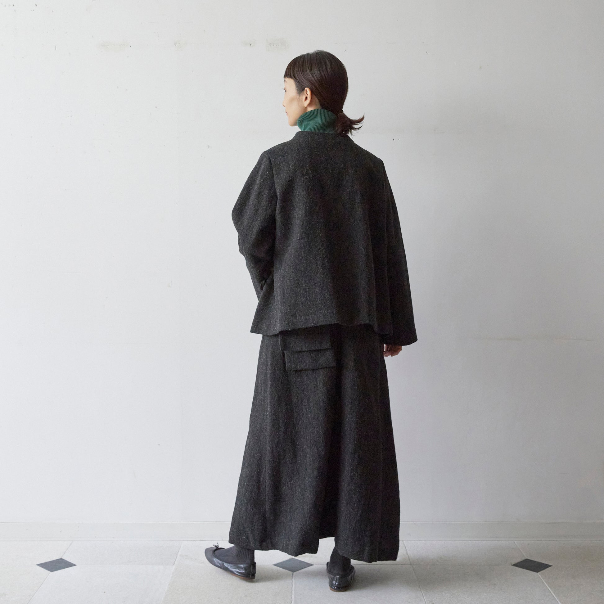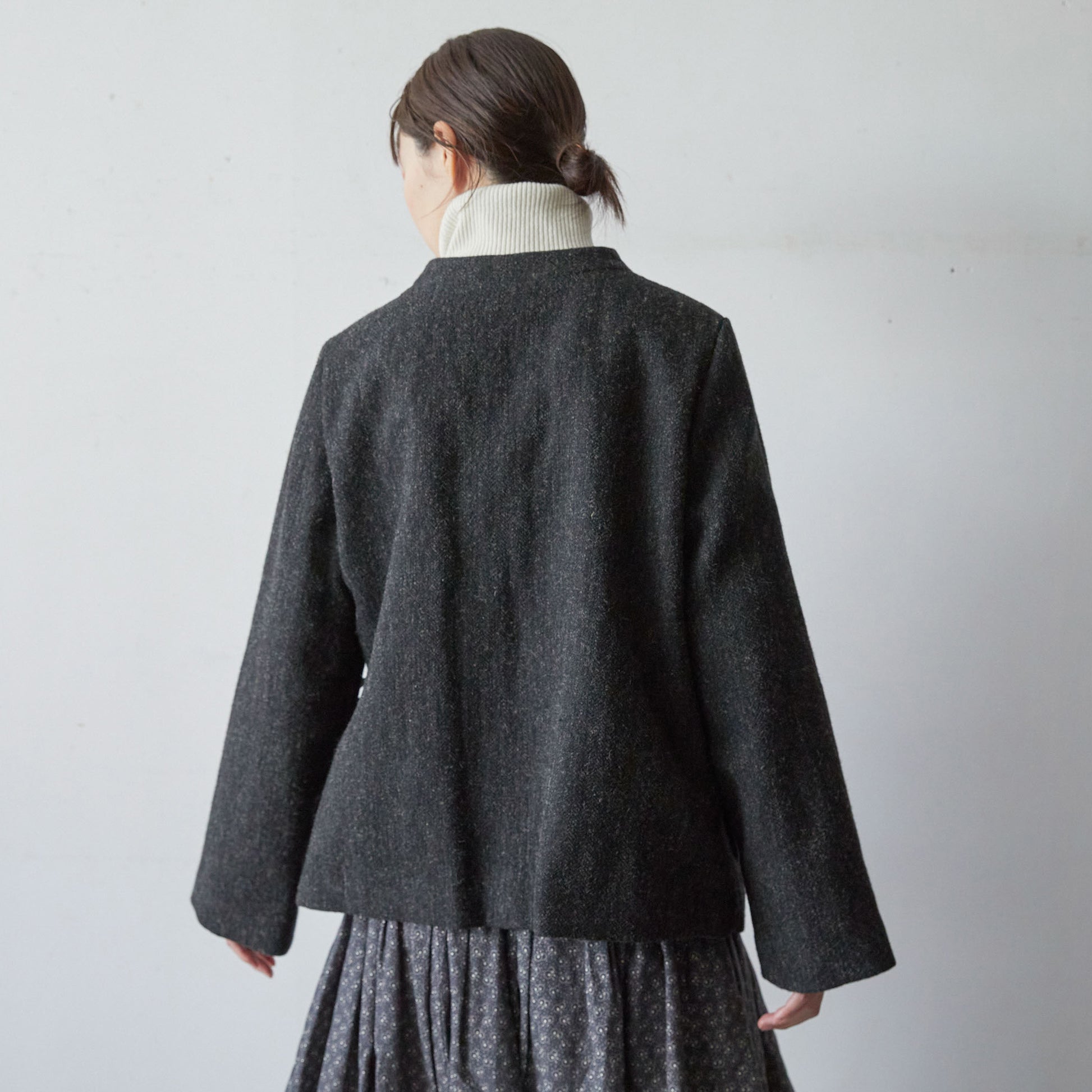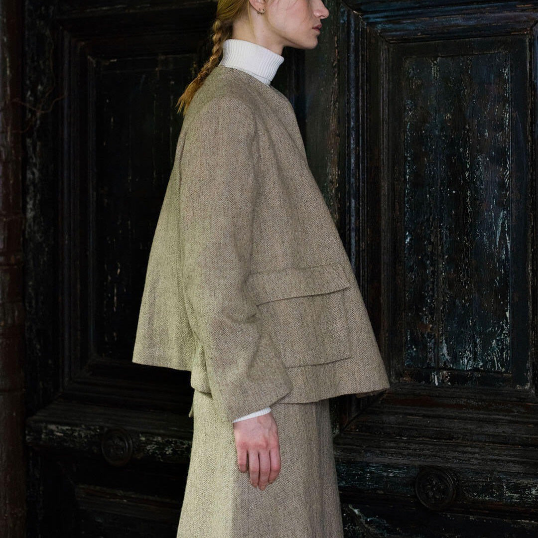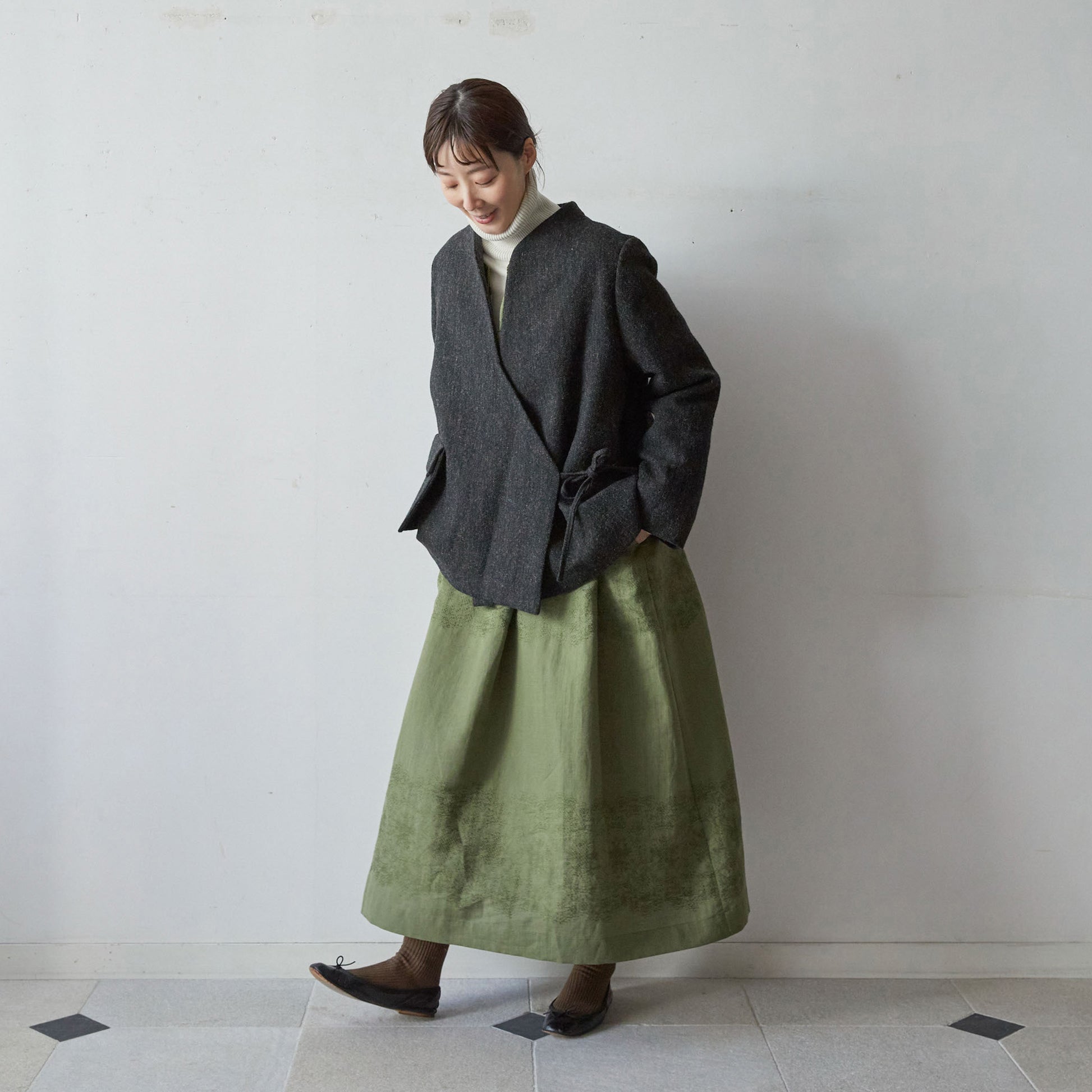 ヘリンボーン織のリネンウールで仕立てた、カシュクールジャケット「フランソワ」をご紹介します。バルキーな生地は尾州で織られた日本製。薄く中綿が入った、とてもあたたかいジャケットです。スカート「ピエール」とのセットアップも楽しめる、コーディネートの幅が広がる一着です。