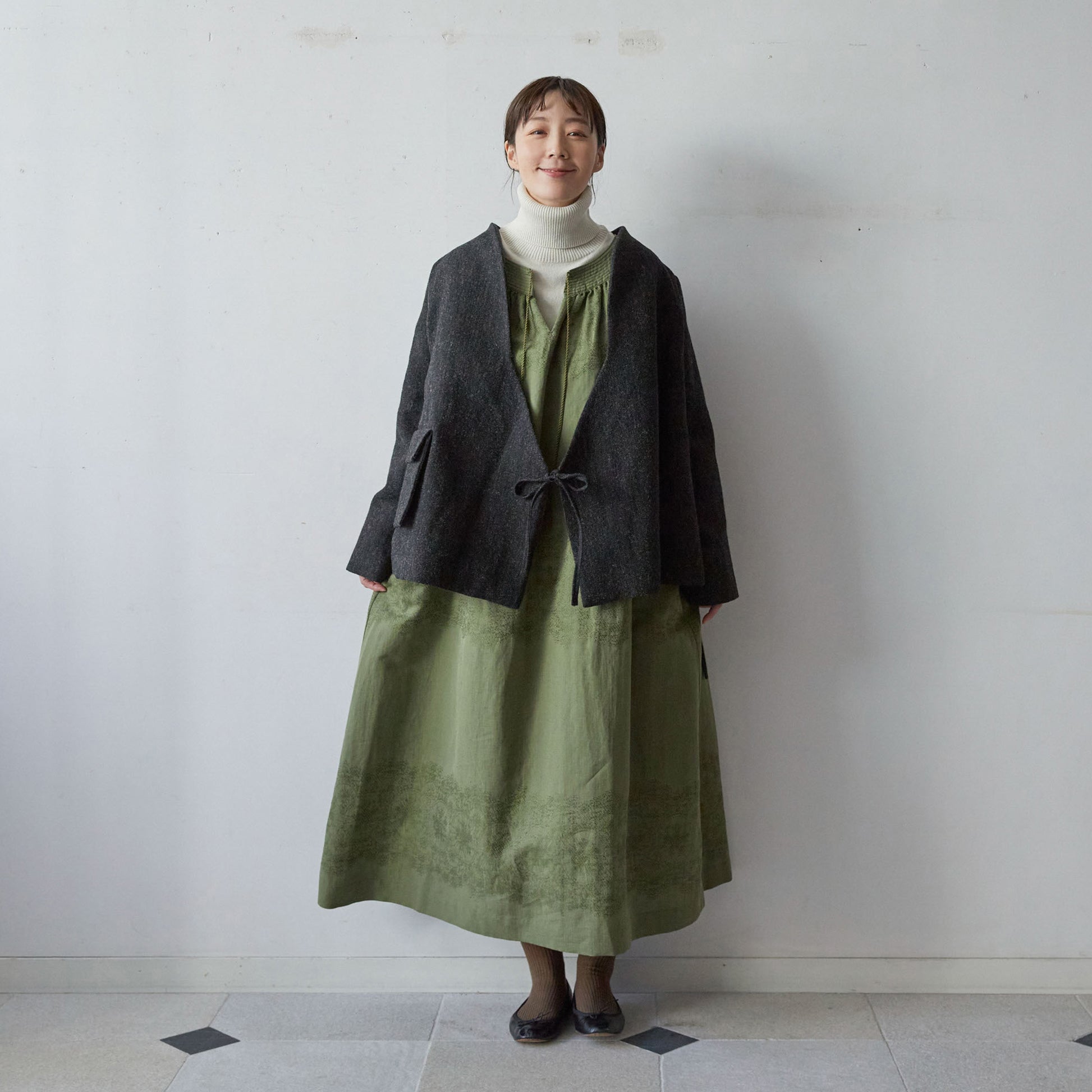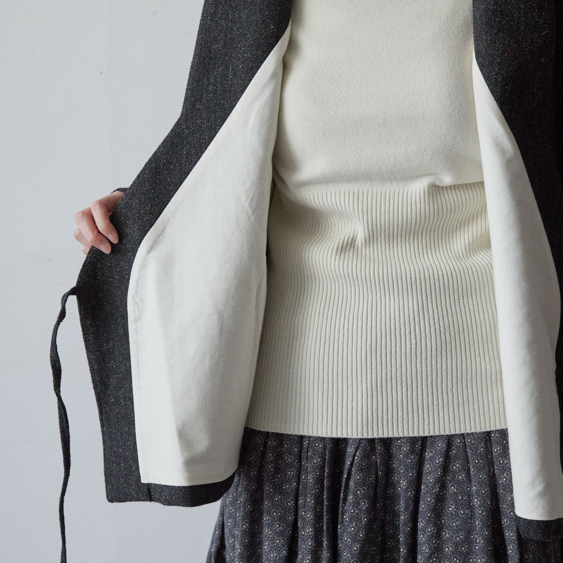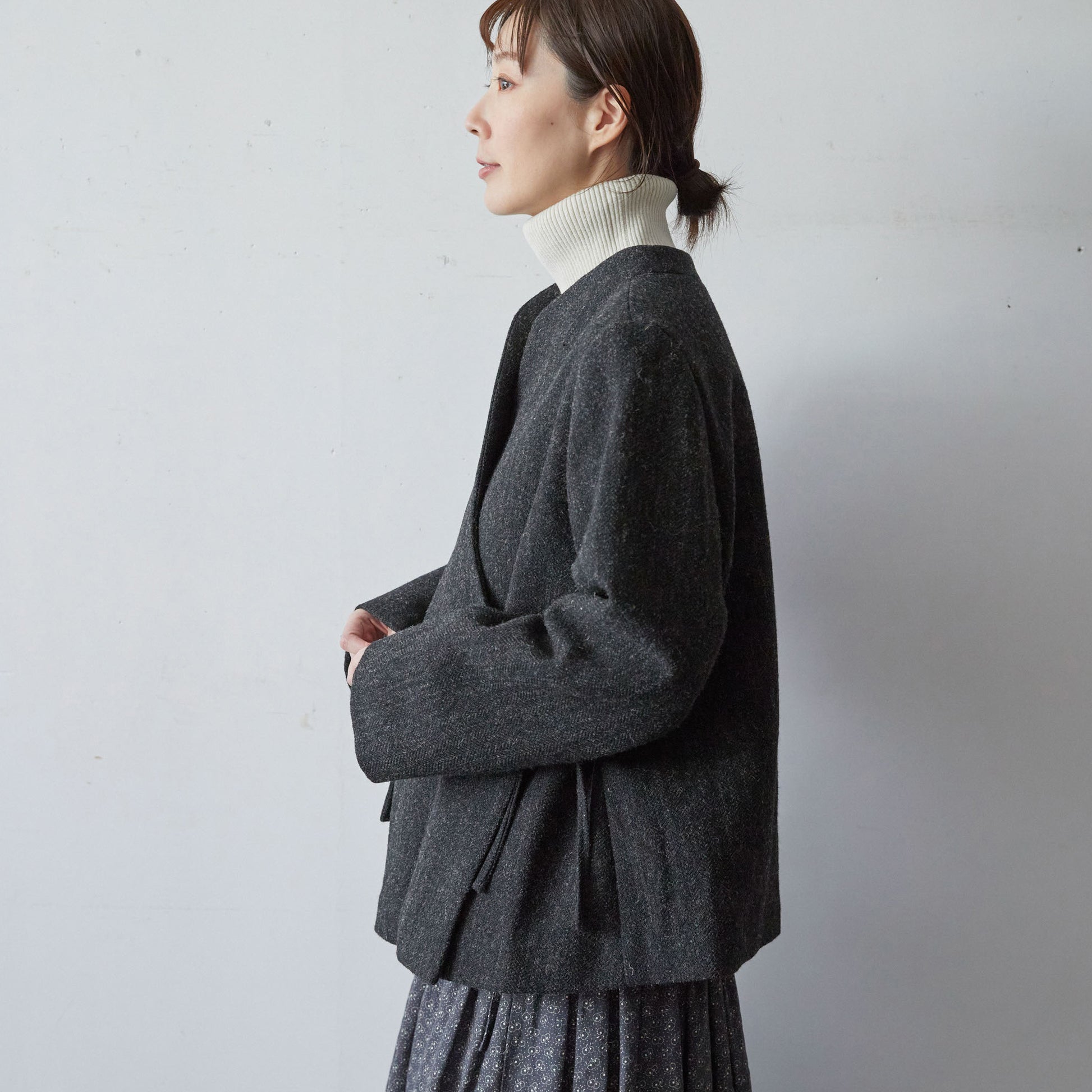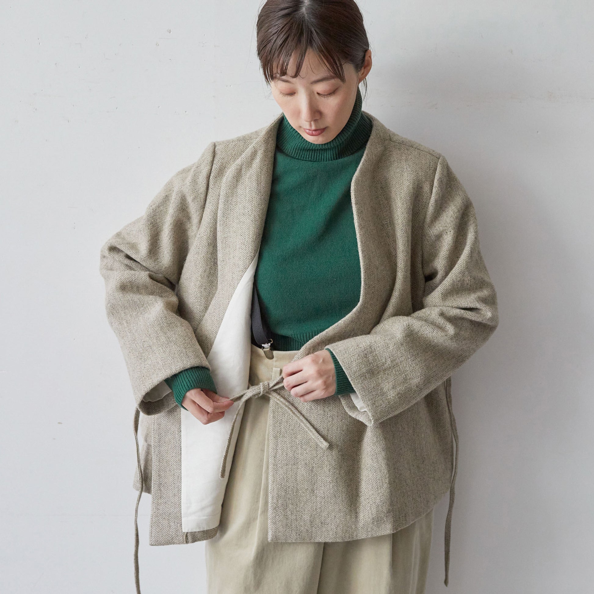 | 素材 | 表地:ウール 52% リネン 48%(日本製) 中わた:ポリエステル 100% 裏地:綿 100%(身頃)、ポリエステル 100%(袖) 縫製:日本 |