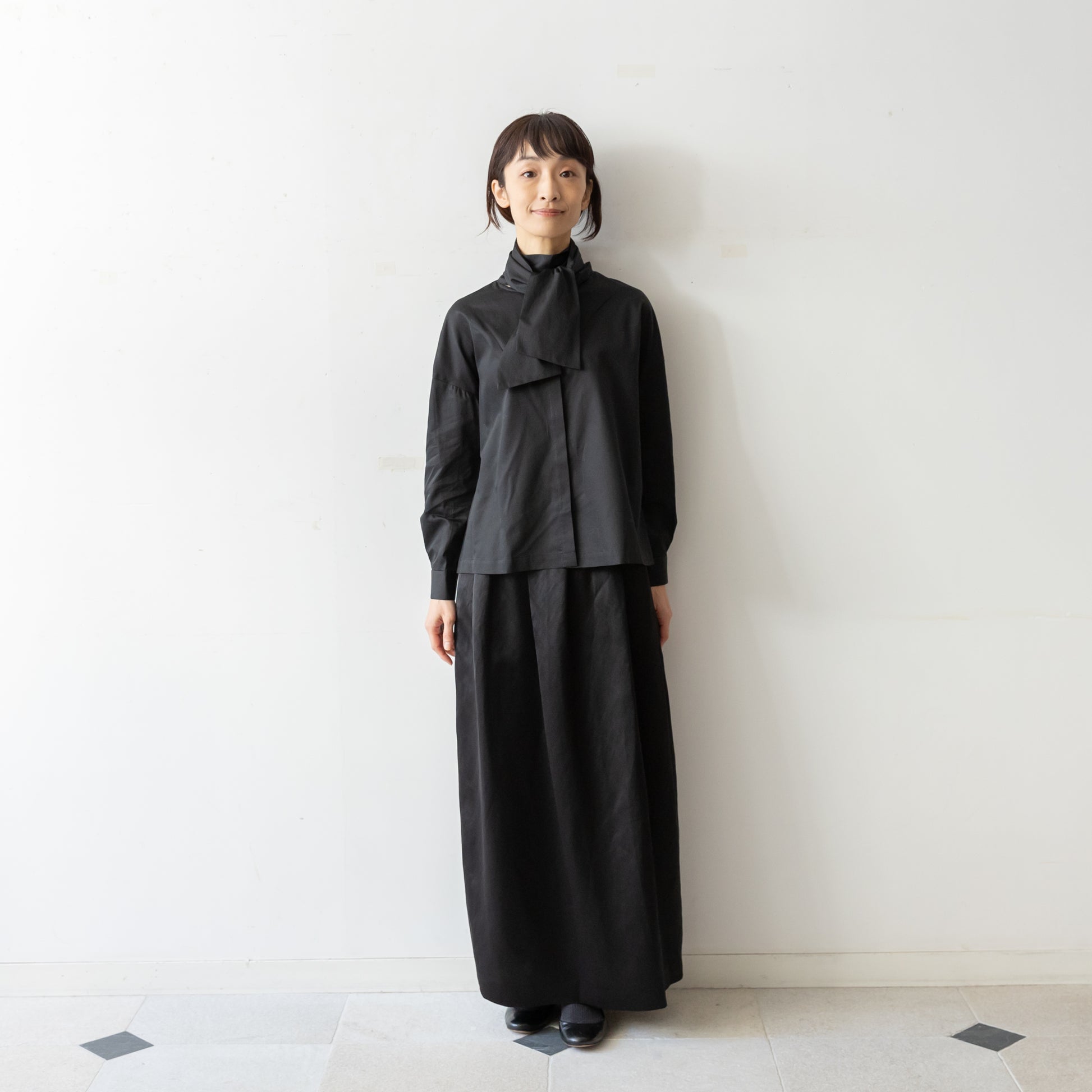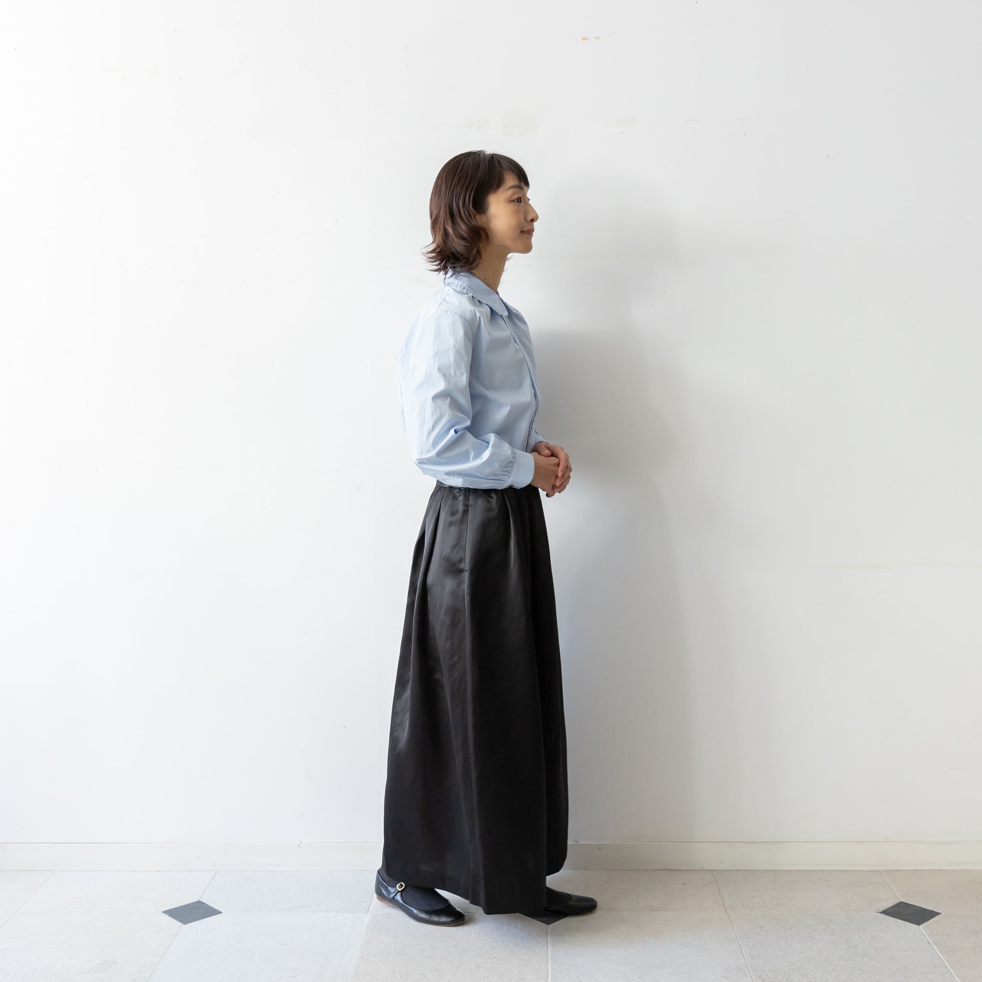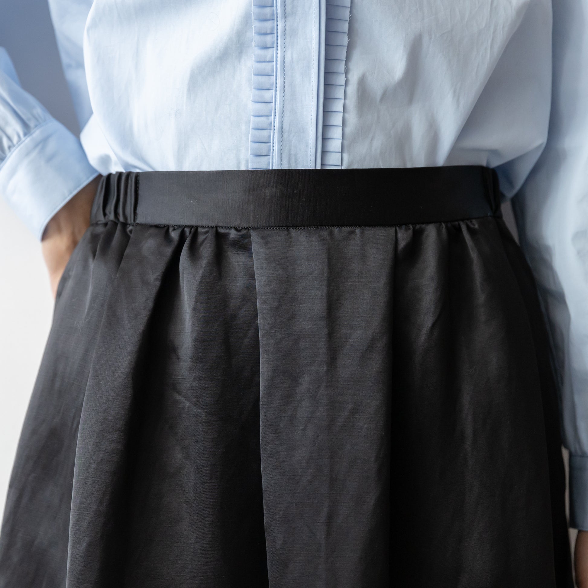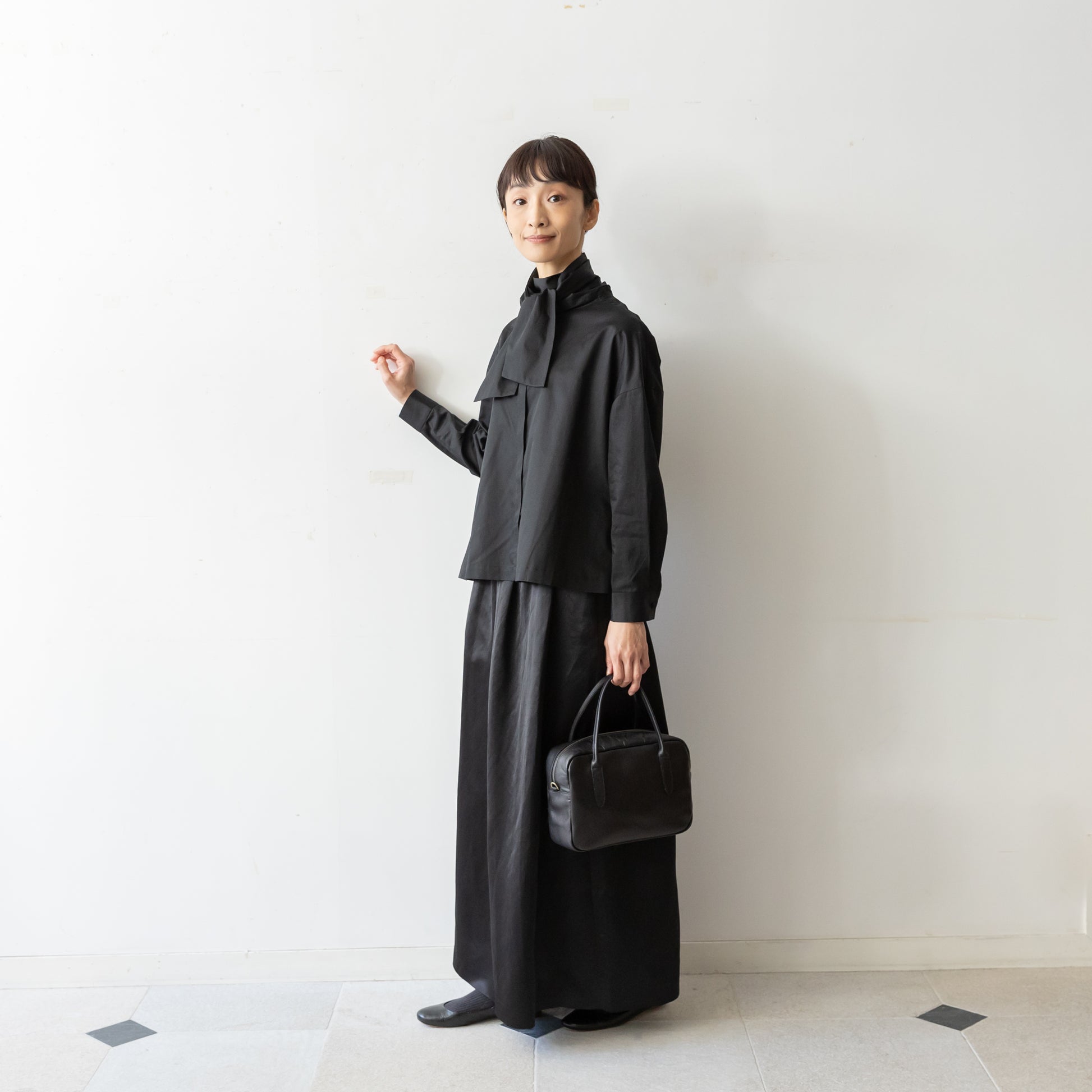 光沢感のあるスカートは、お出かけの装いにぴったりです。異なる素材のトップスを組み合わせれば、ブラック×ブラックで大人っぽく着こなせます。▲ブラウス:エミリアーナ