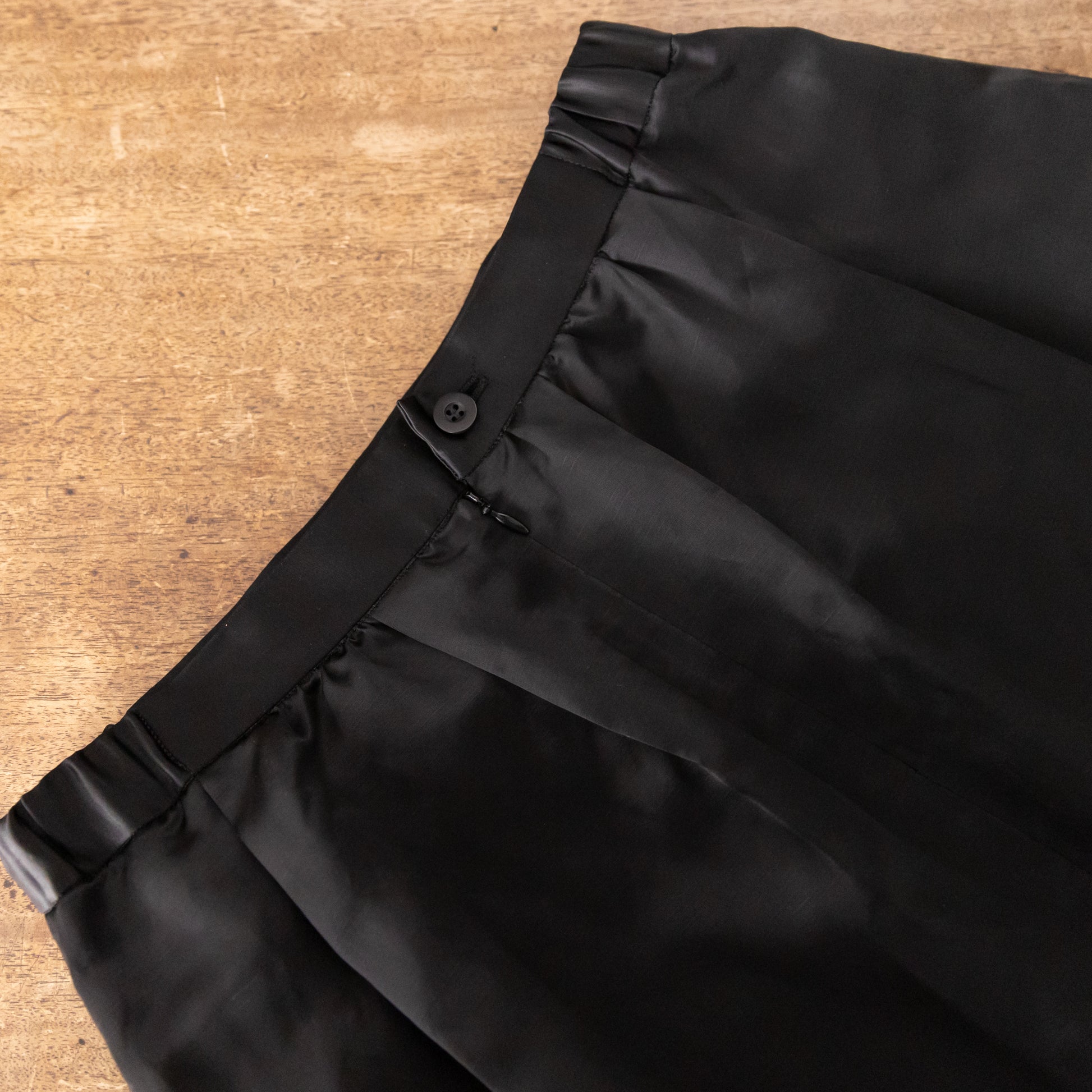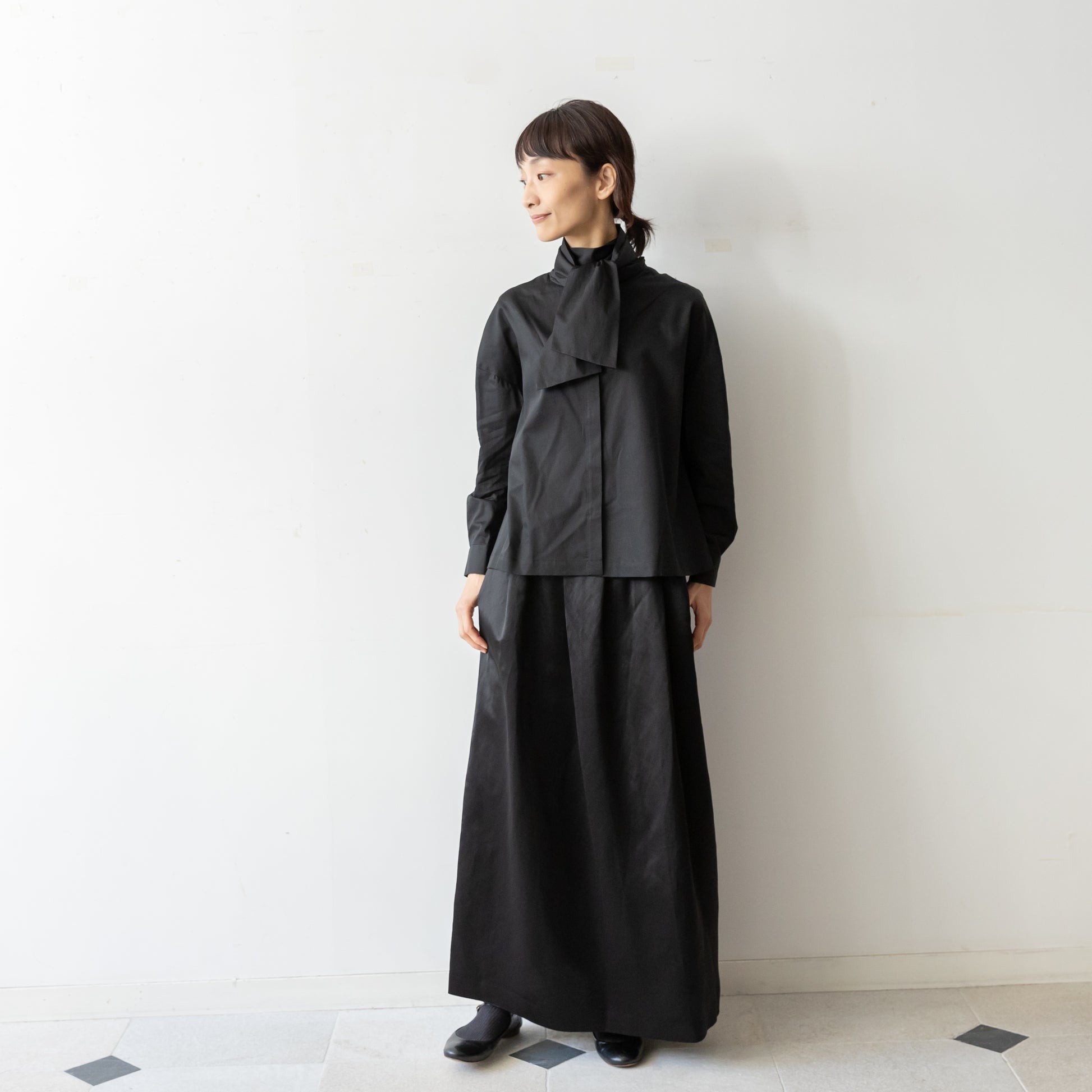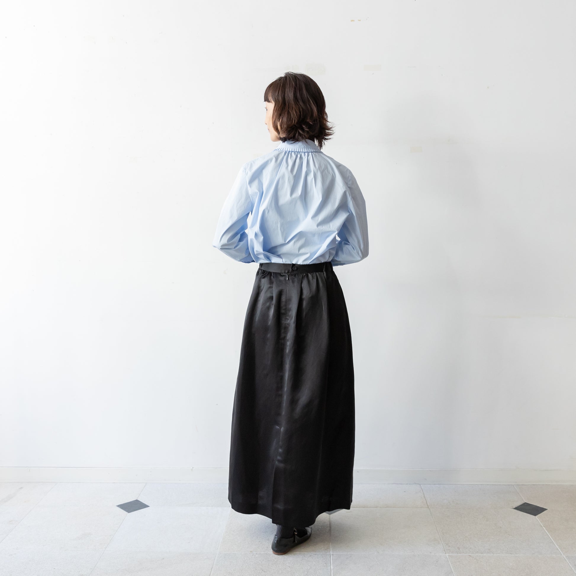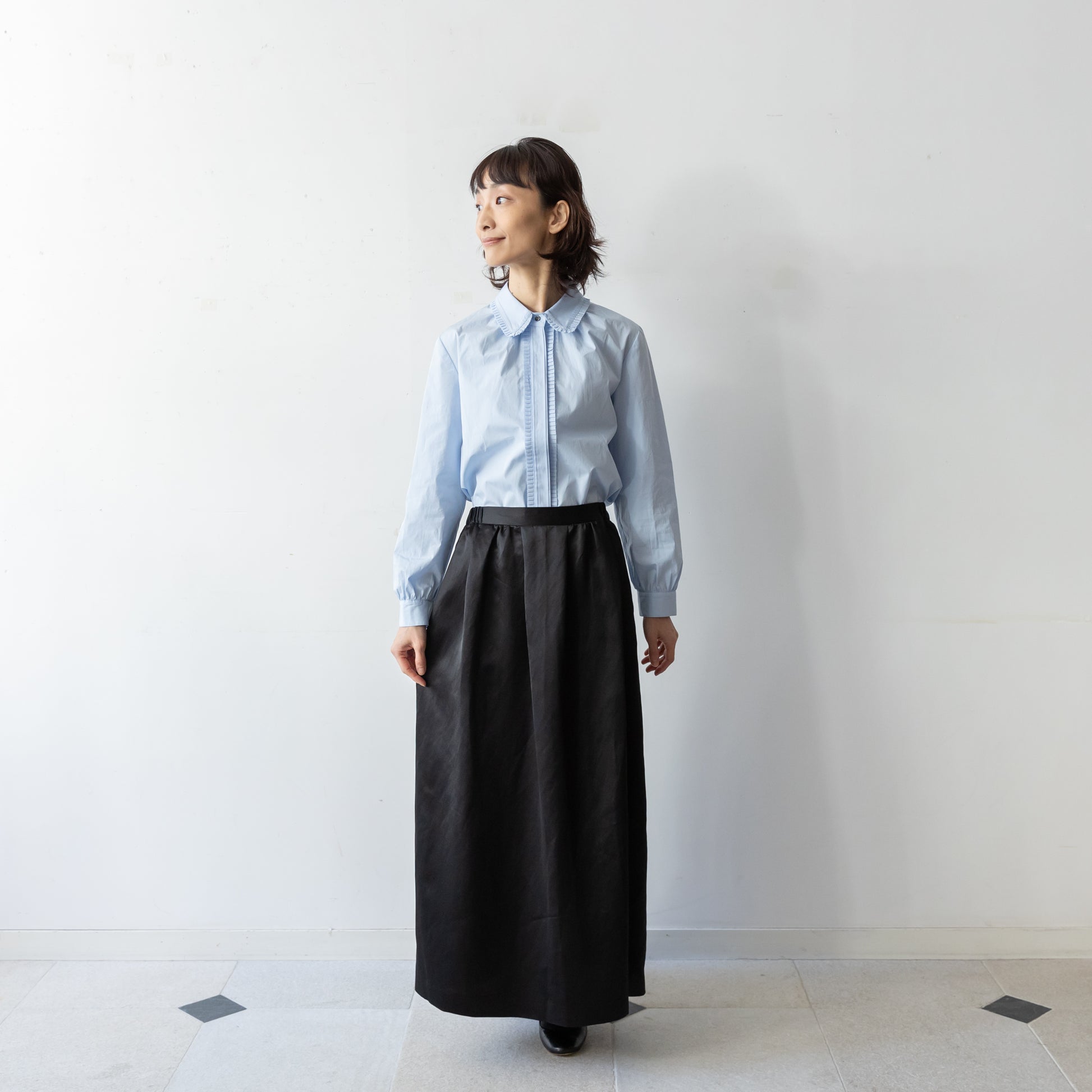 光沢感のあるスカートは、お出かけの装いにぴったりです。異なる素材のトップスを組み合わせれば、ブラック×ブラックで大人っぽく着こなせます。▲ブラウス:エミリアーナ