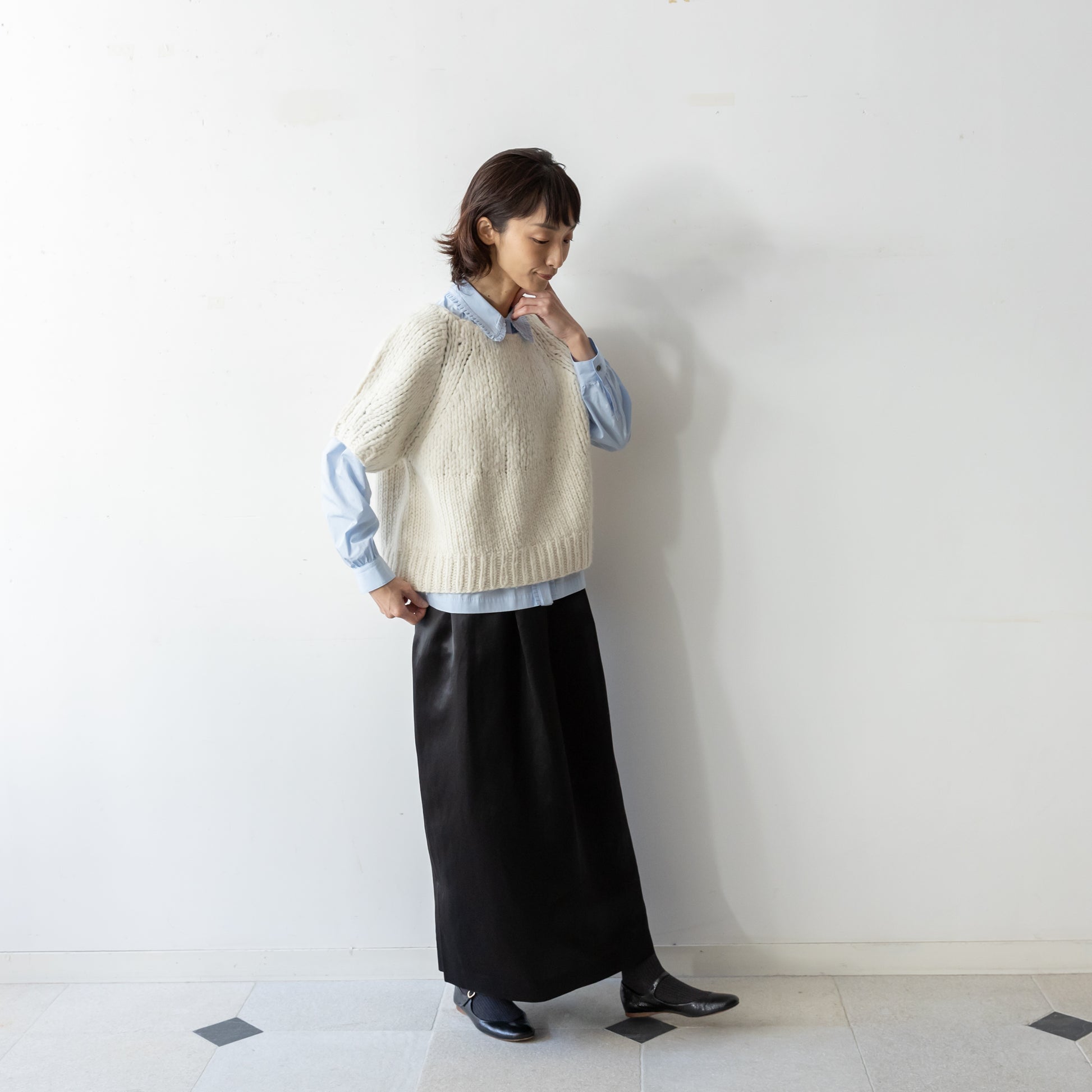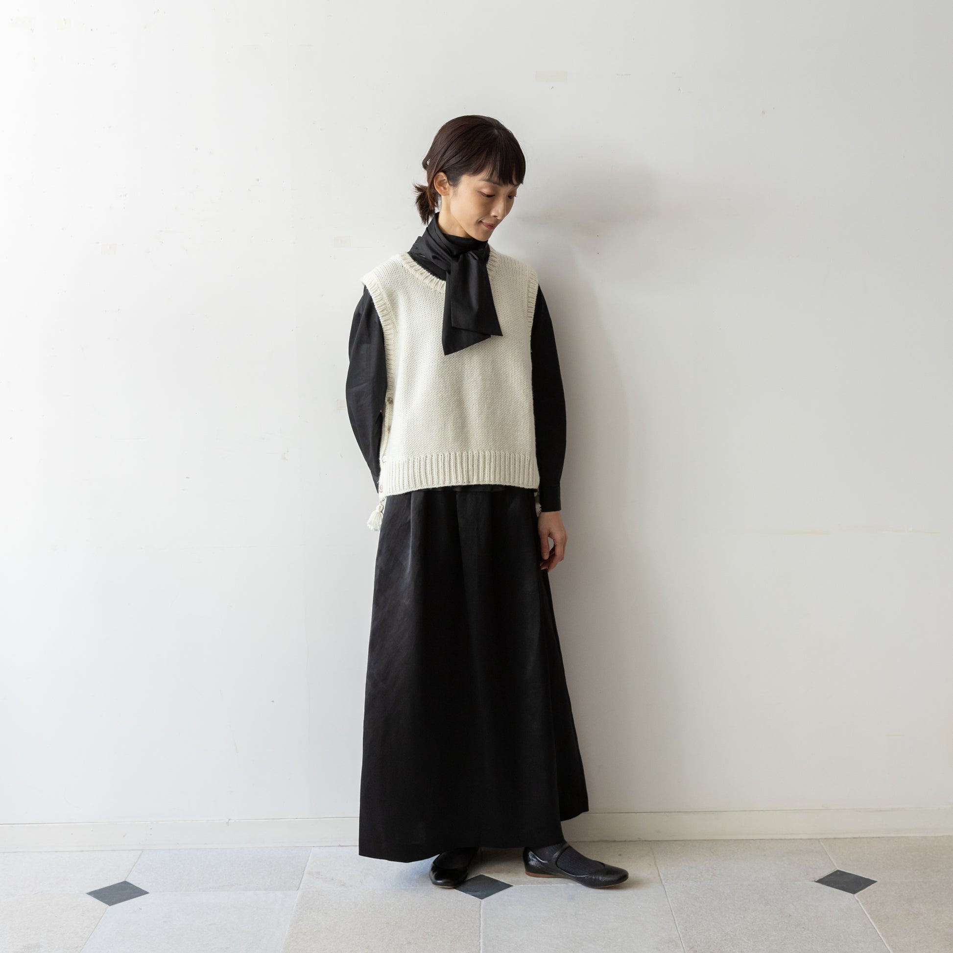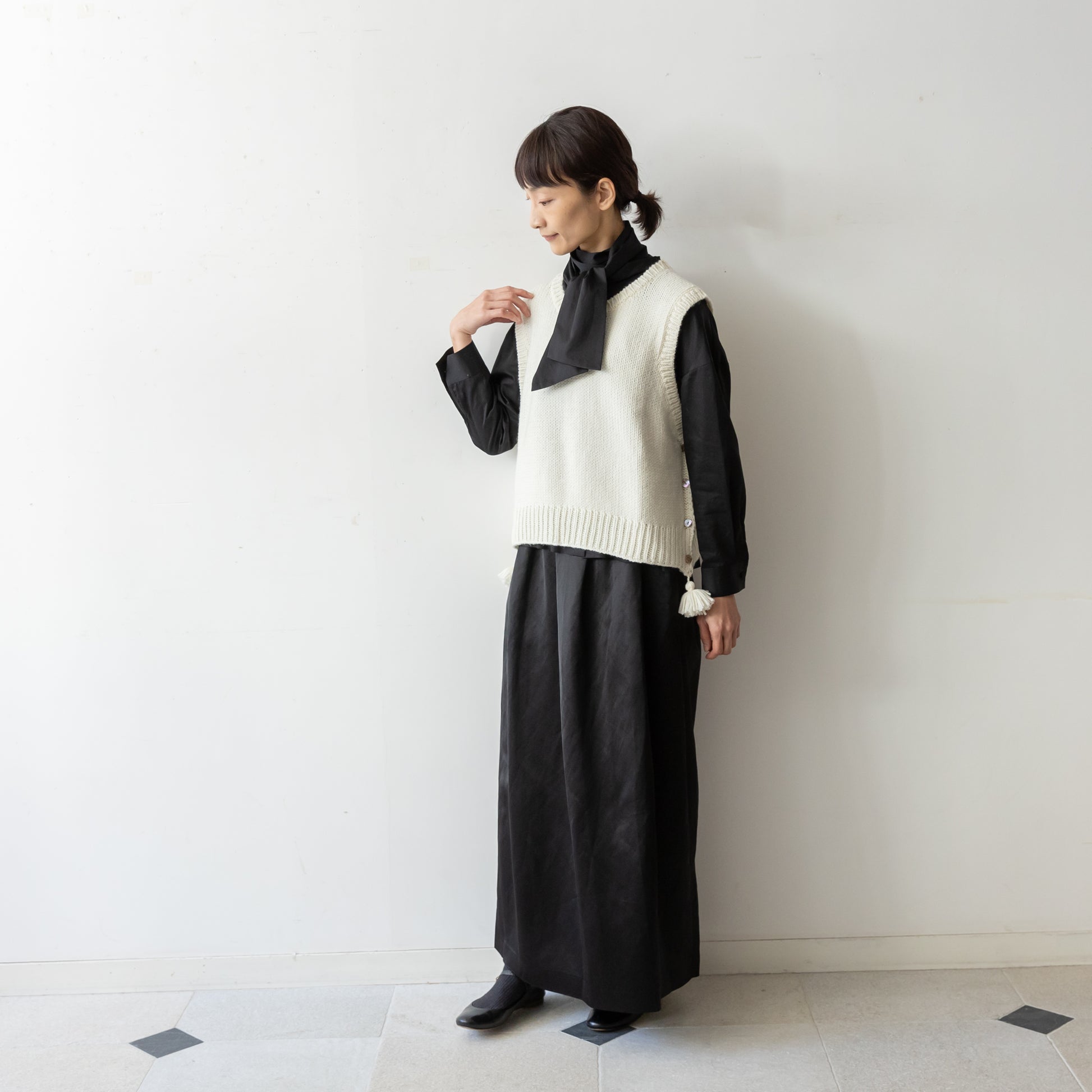 ニットベストを重ねて、大人のモノトーンコーデも。▲ブラウス:エミリアーナ/ノアール、ベスト:ヘルガ[完売]