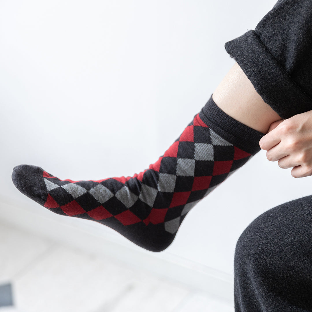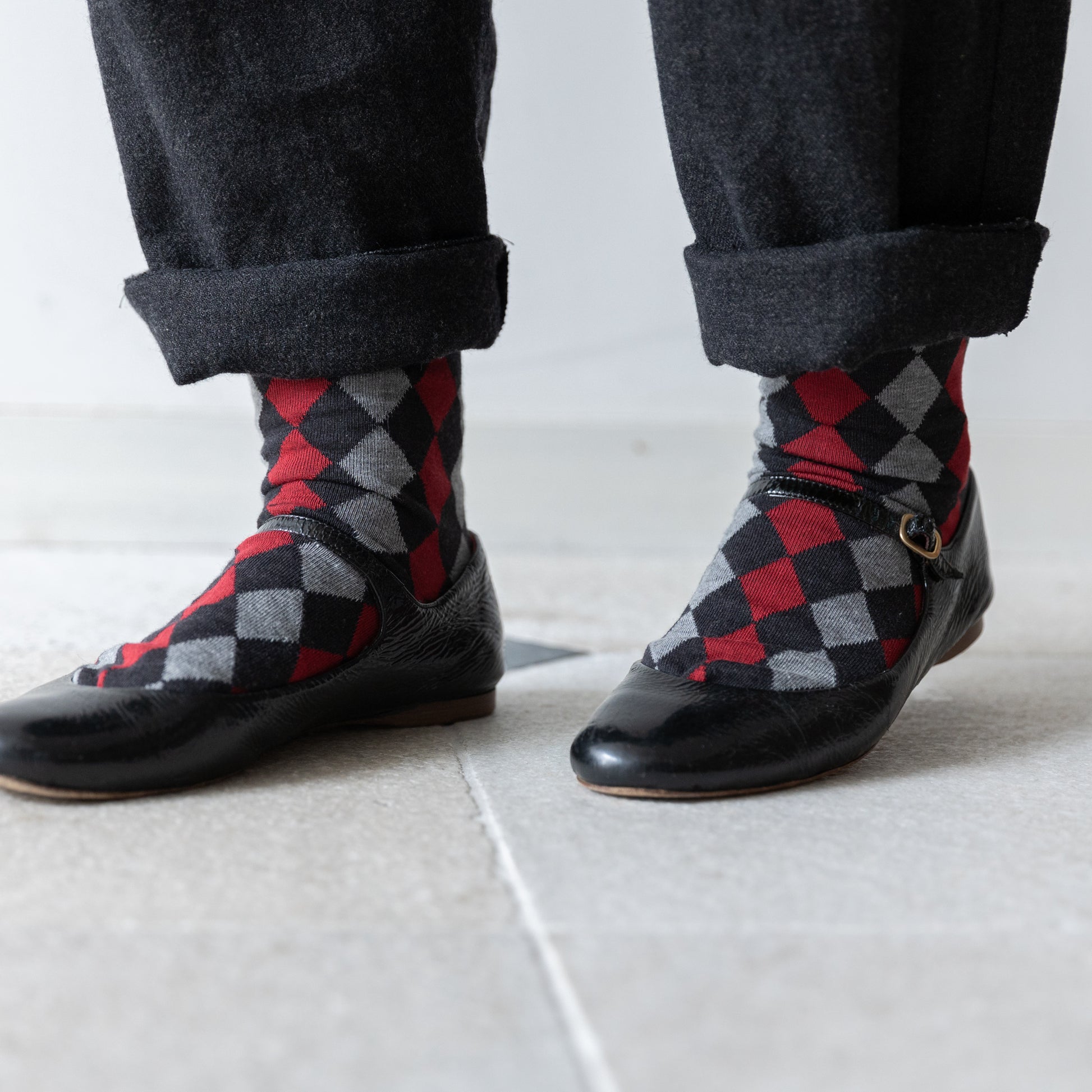 2023AWコレクションのメインテーマは「サーカス」。出演するピエロが履いていそうな、ダイヤ柄のソックスです。