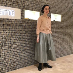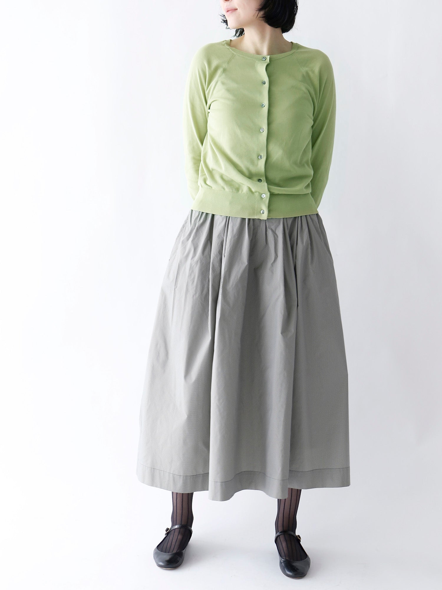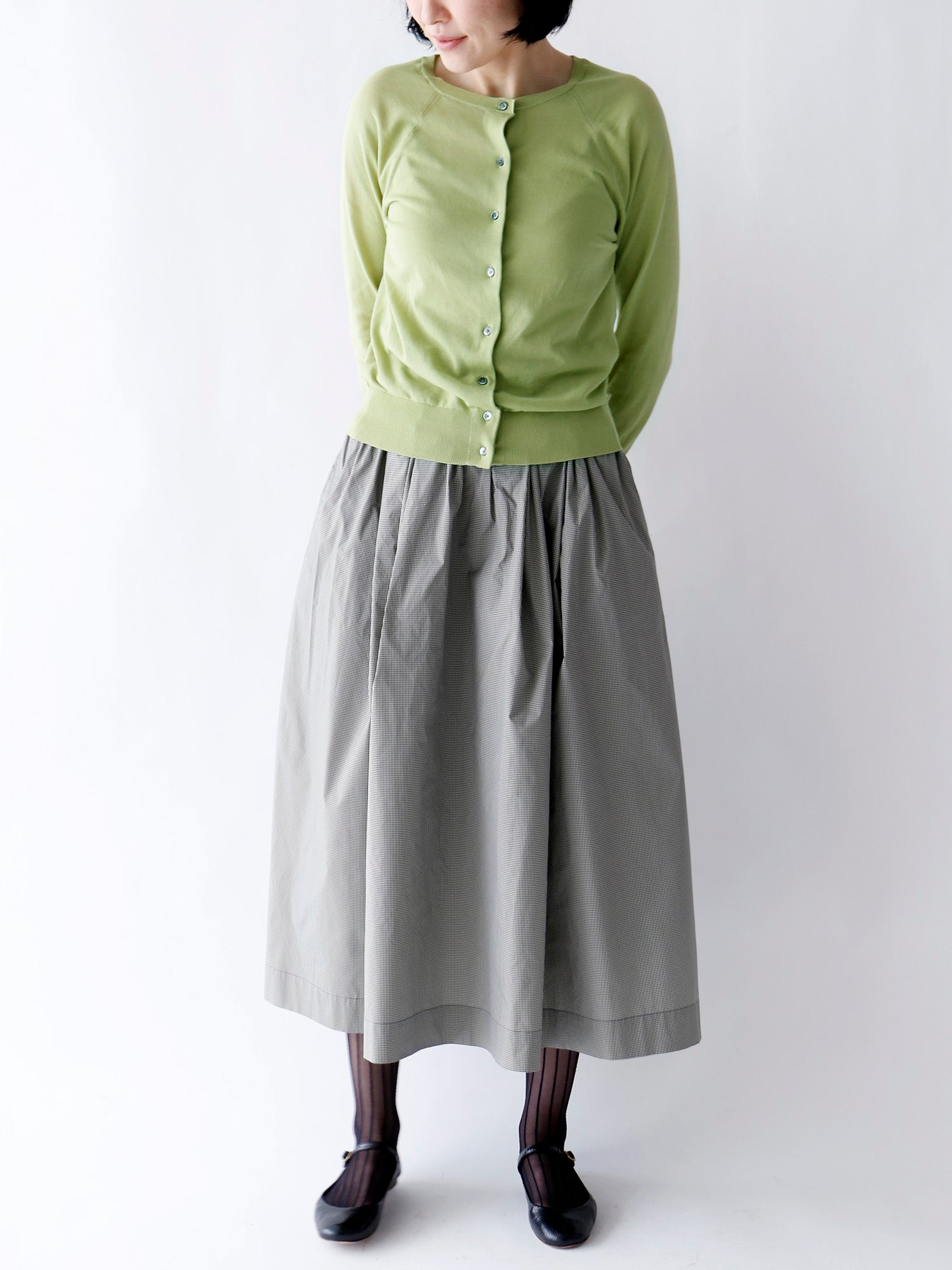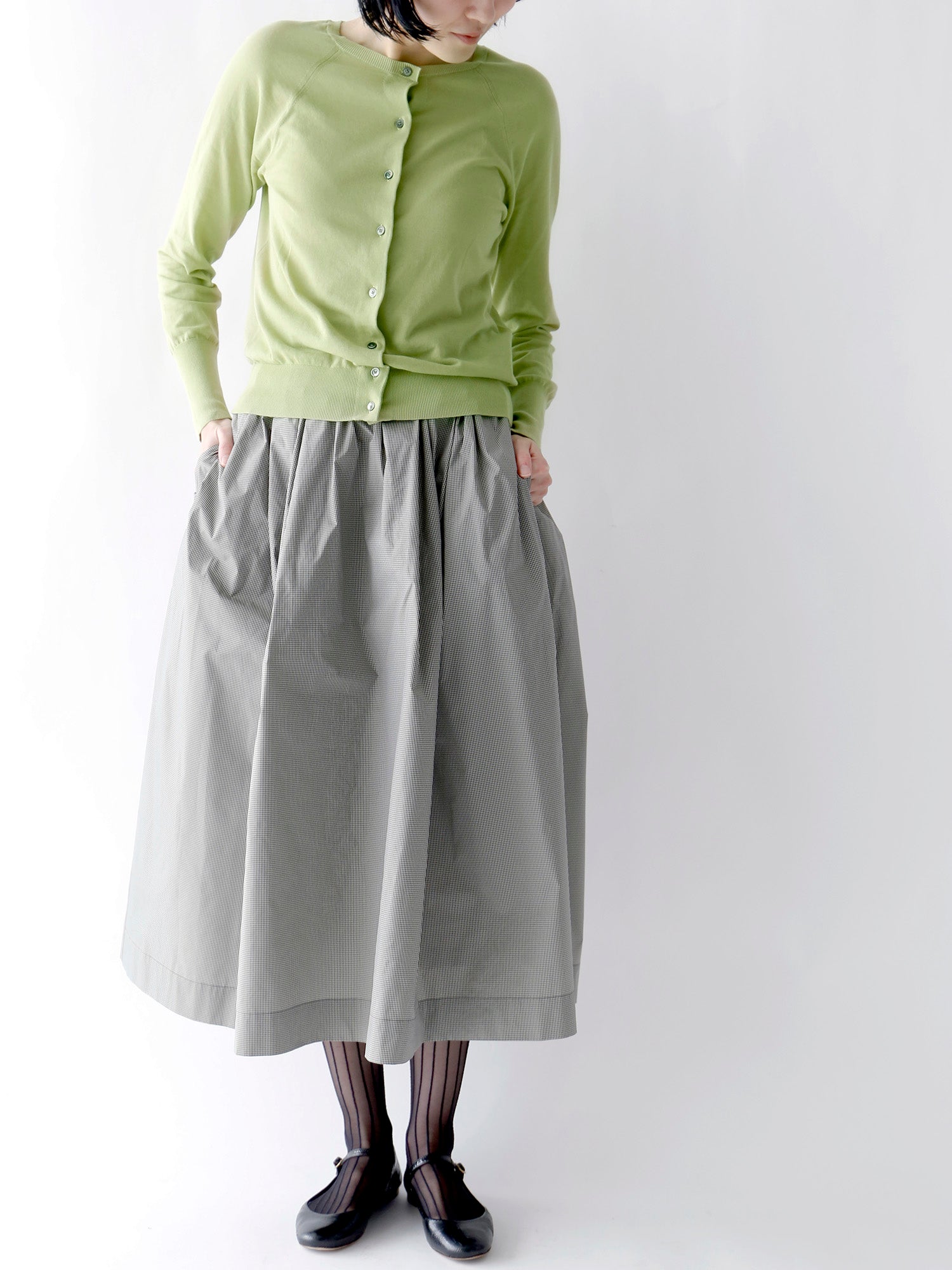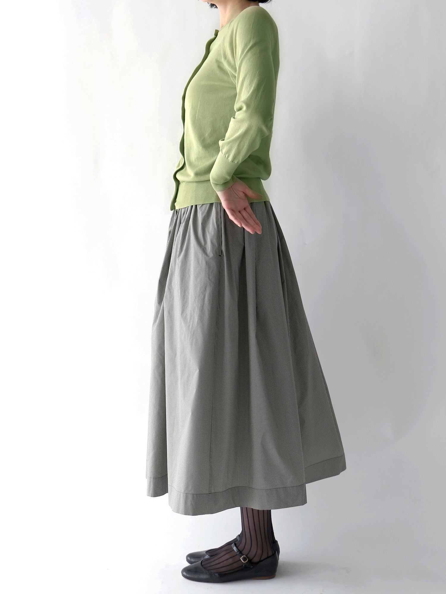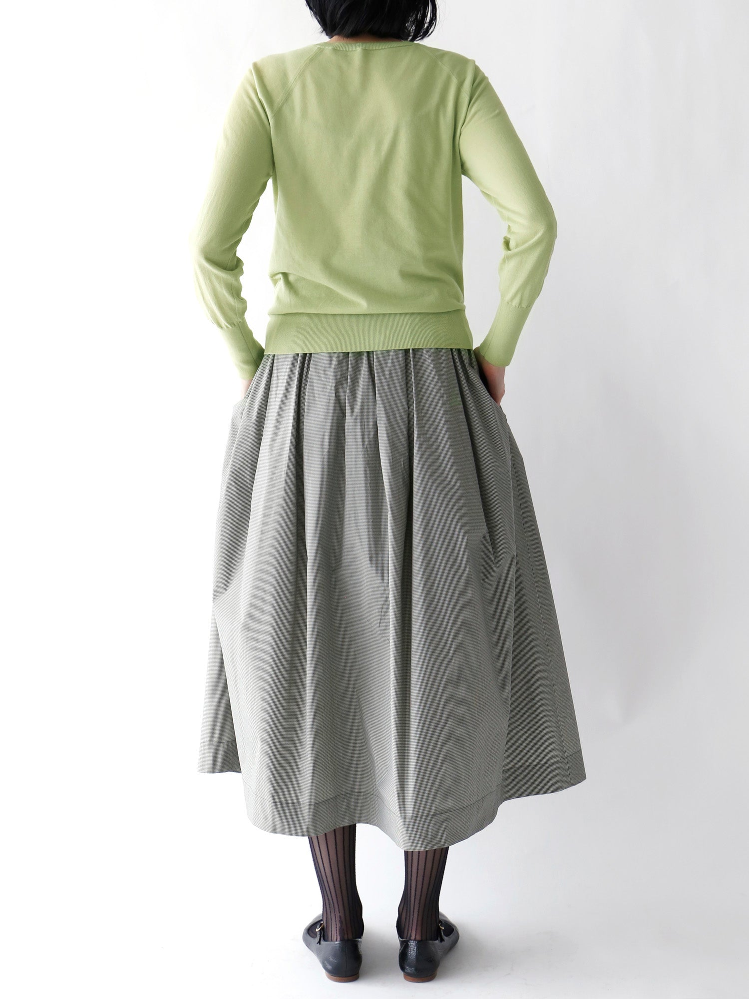 新作のギンガムチェック柄のスカートと合わせて、モダンで洗練された着こなしに。