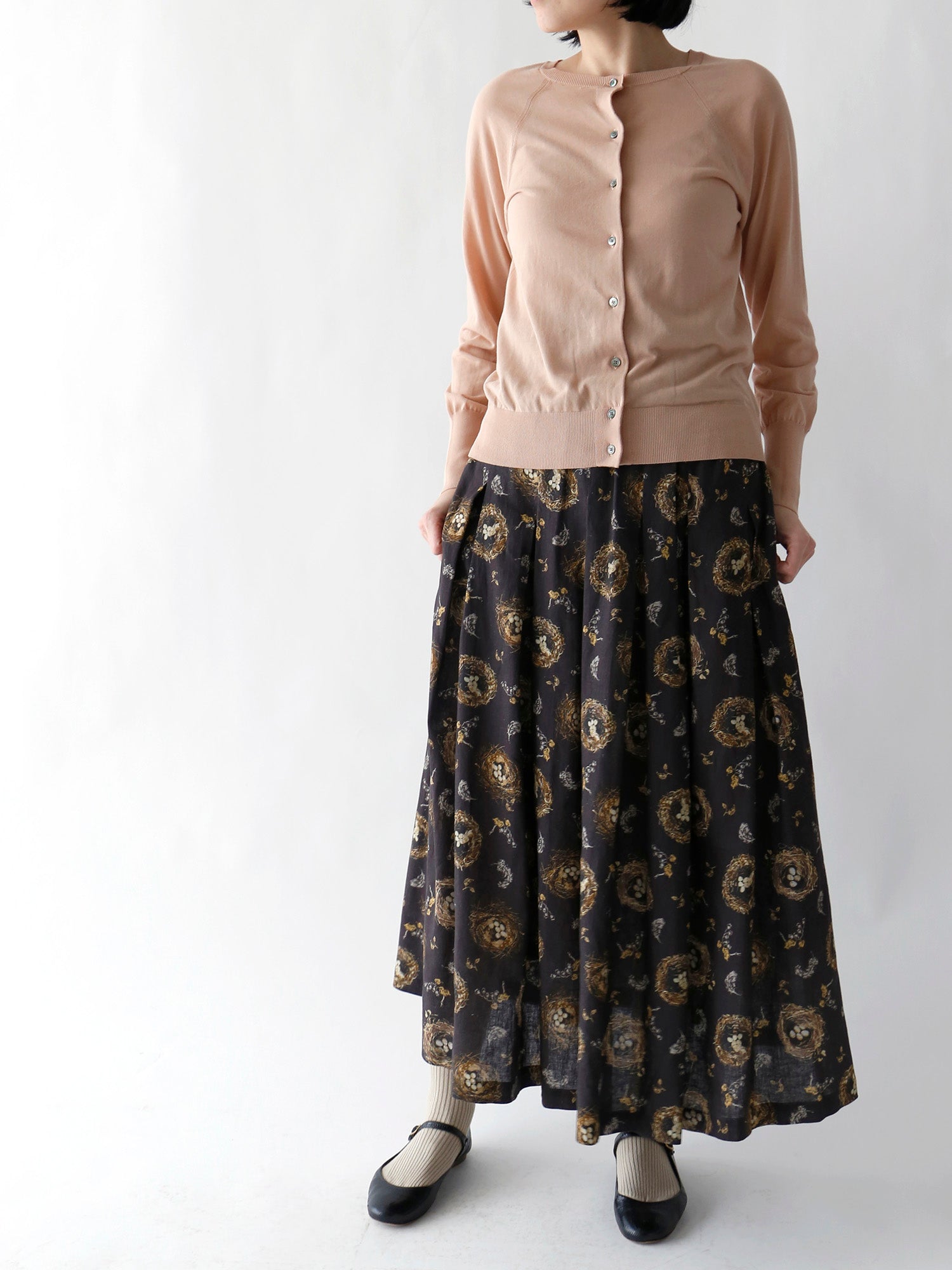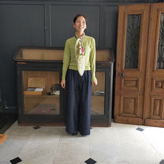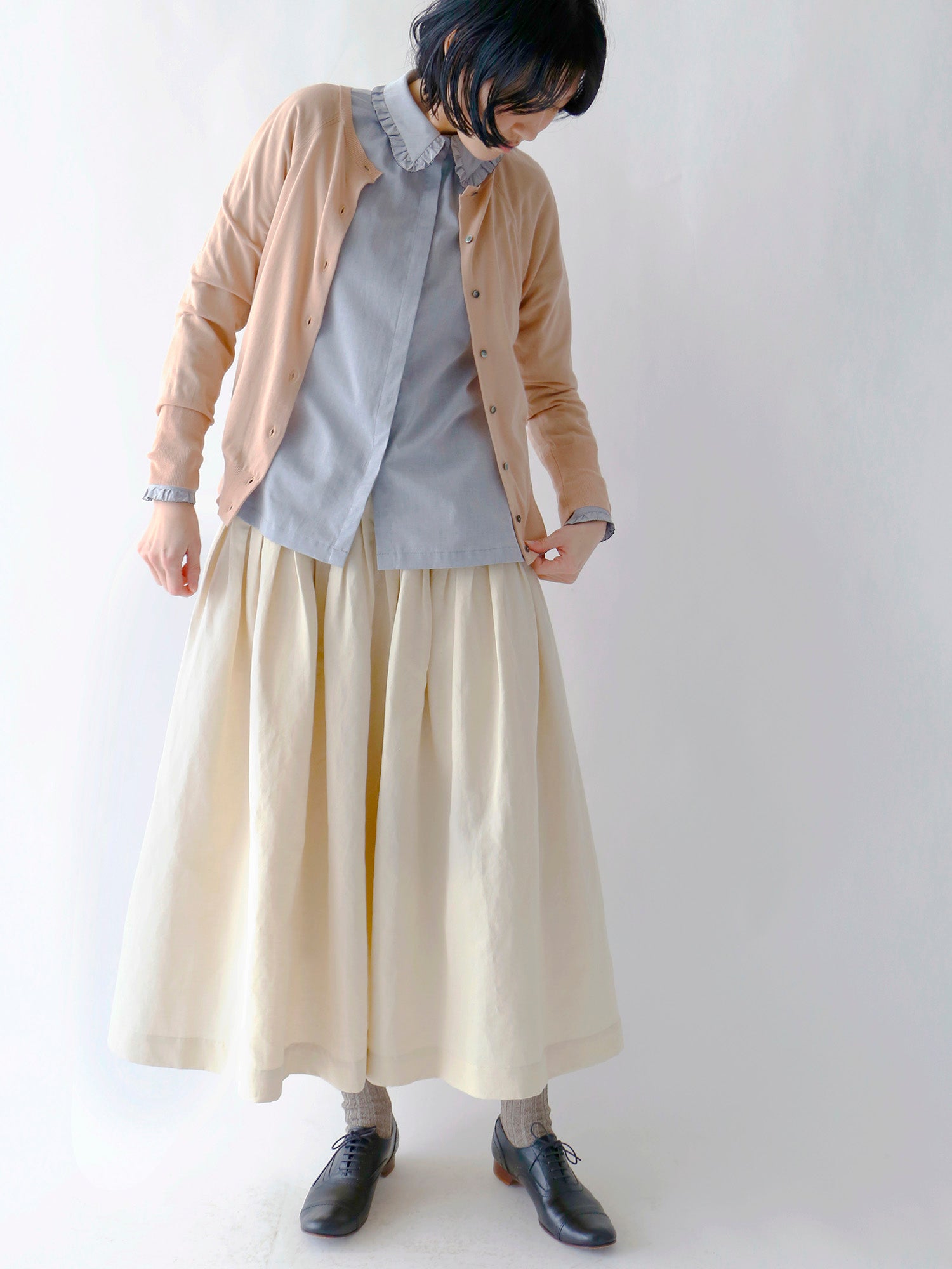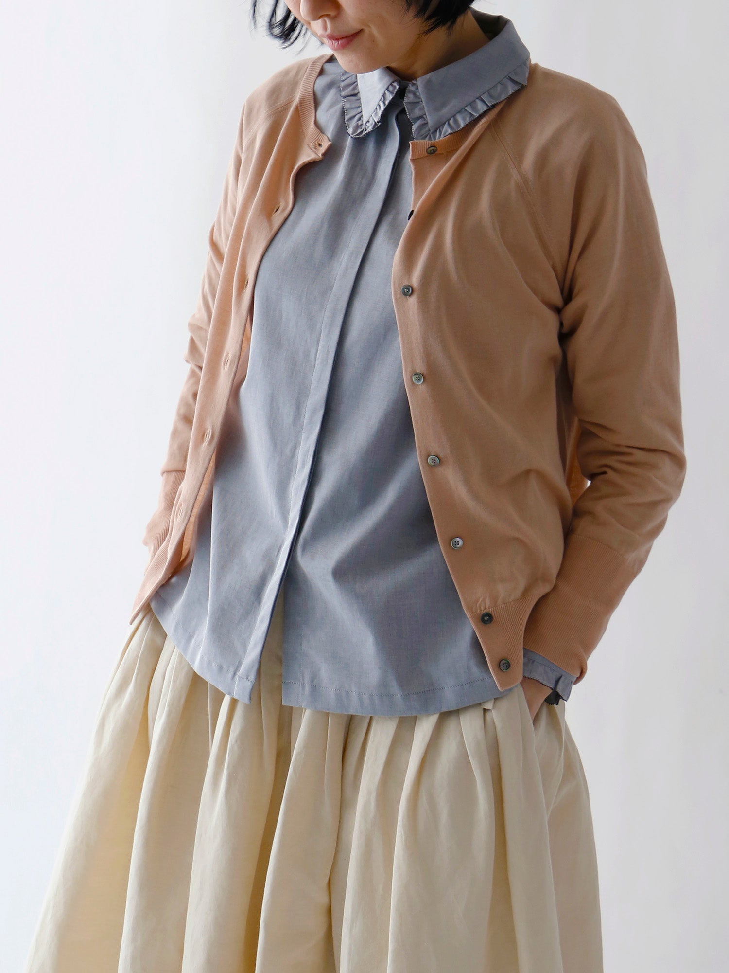 カーディガン&ブラウスで春らしい装いに。袖口からもピコフリルをちらりと覗かせて。