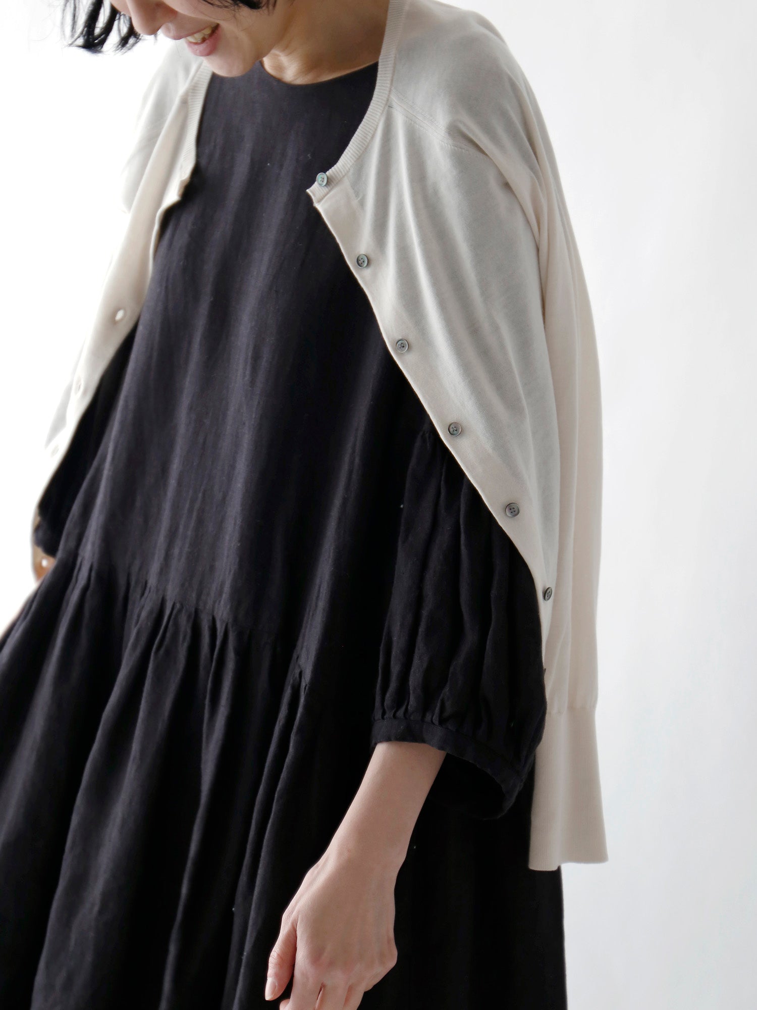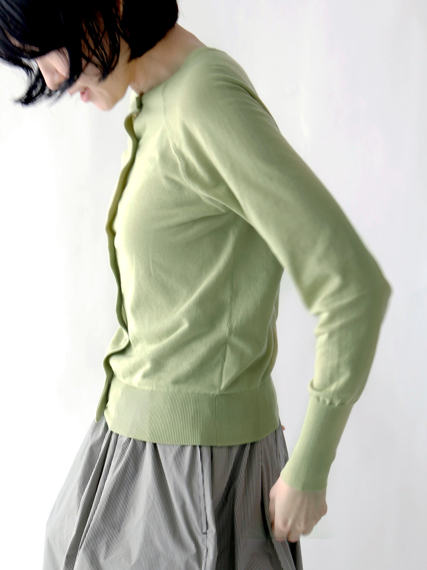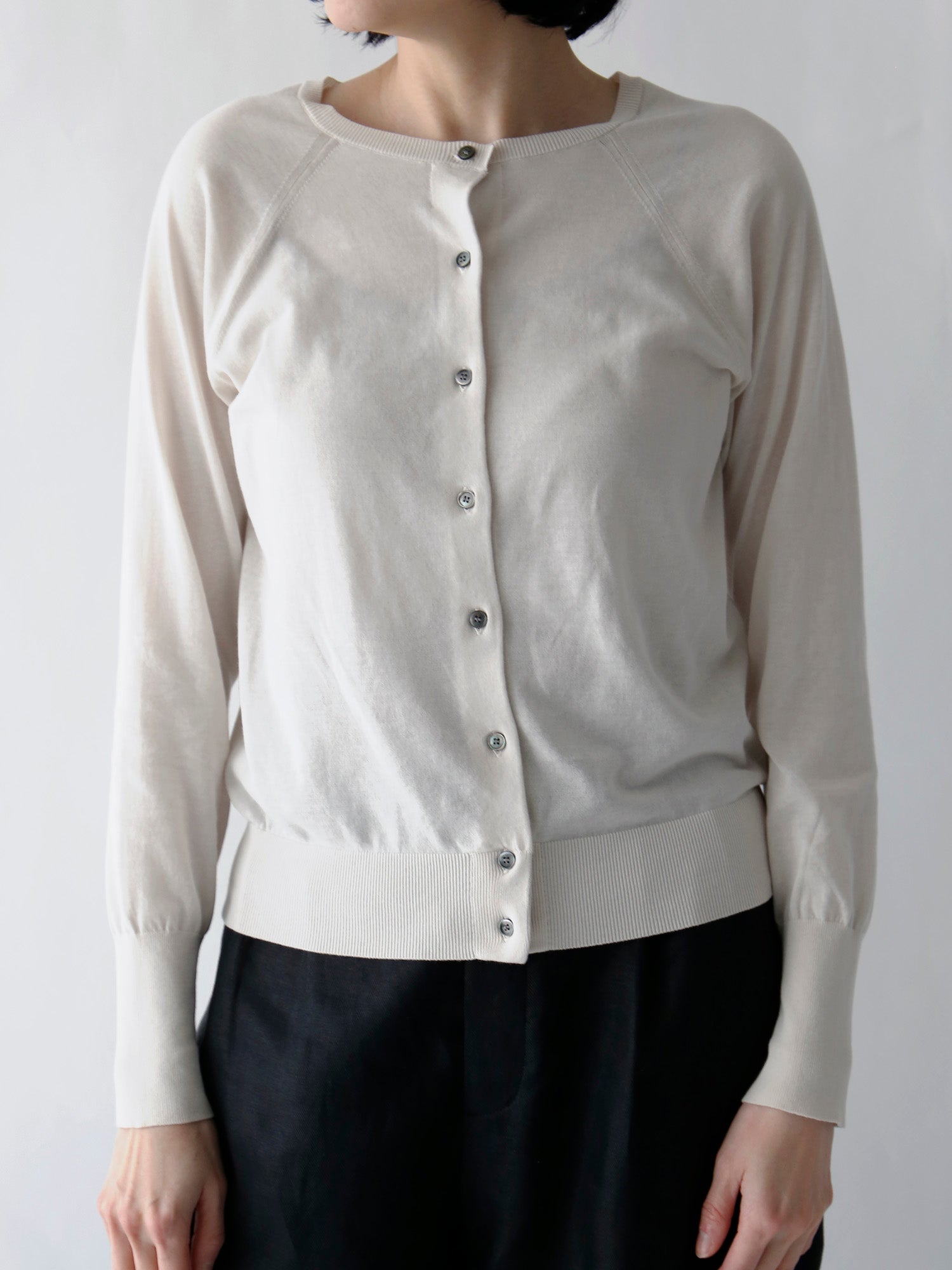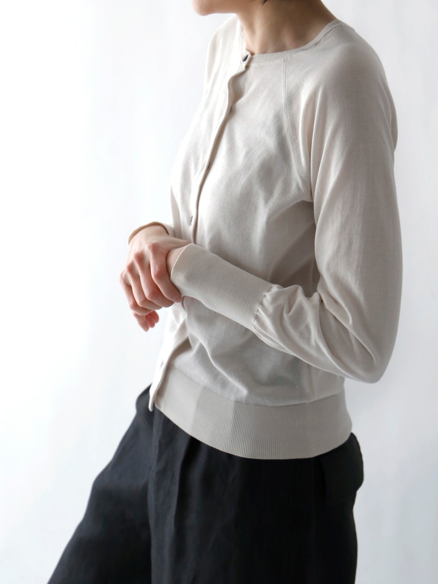 人気のひみつは一見どこにでもあるふつうのカーディガンに見えても、袖を通すとわかるシルエットの美しさとバランスのよさ。