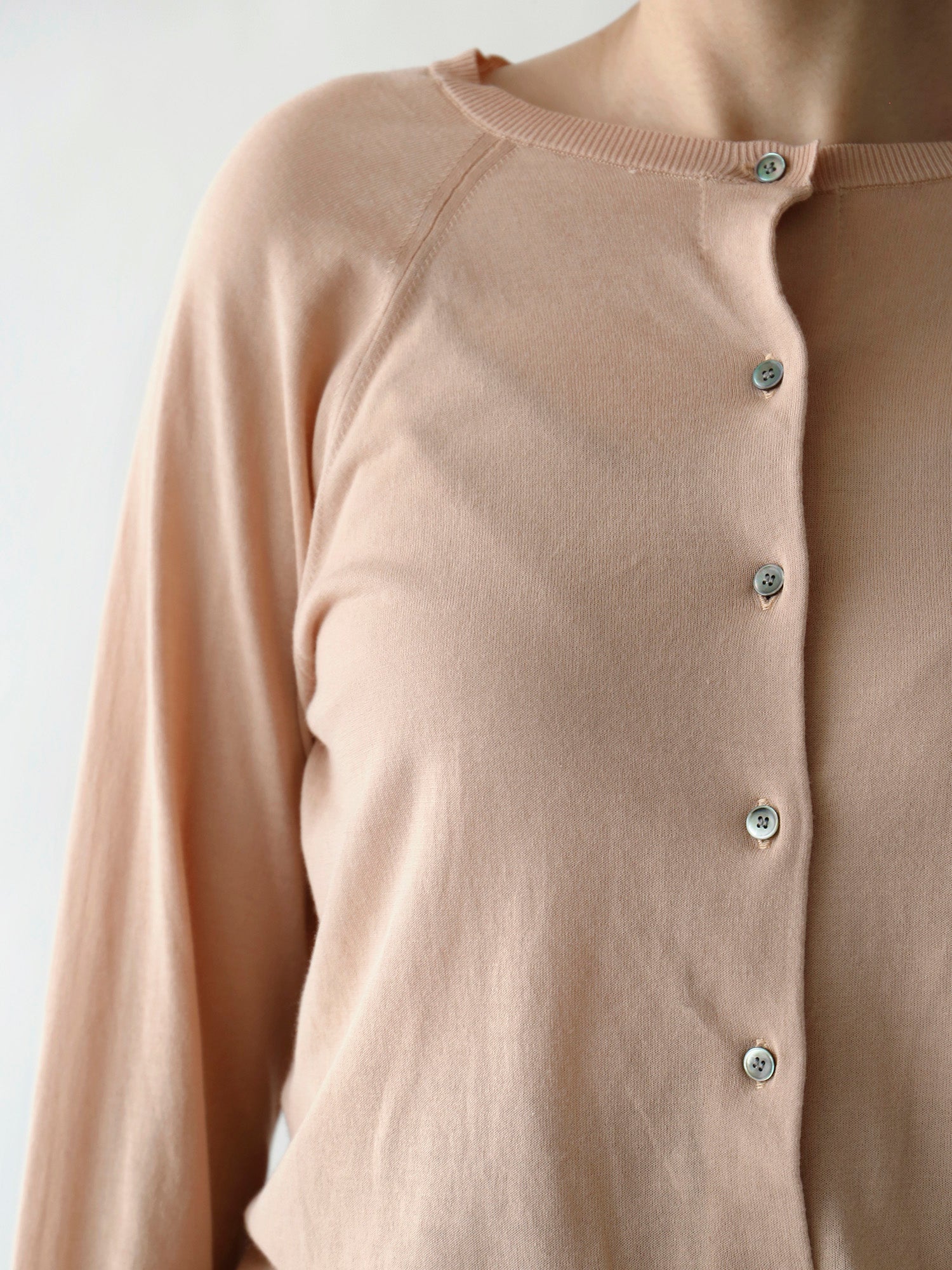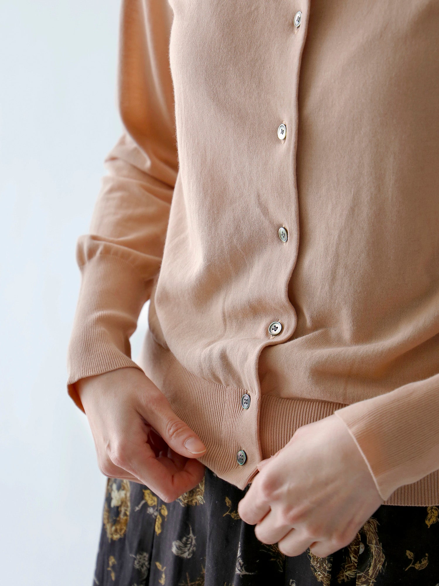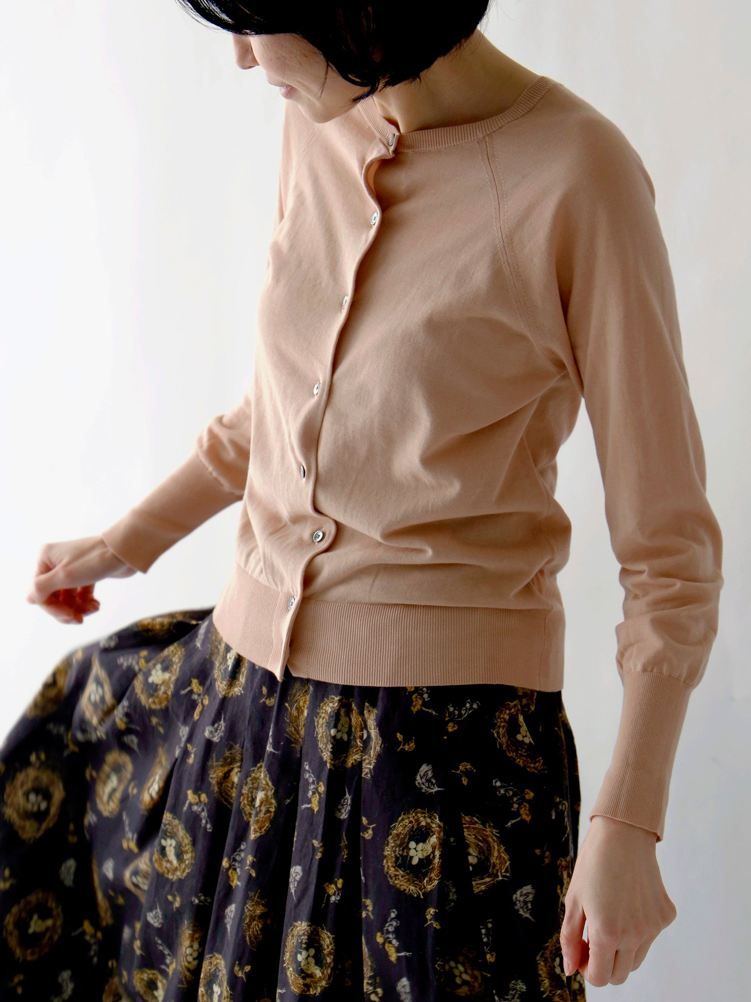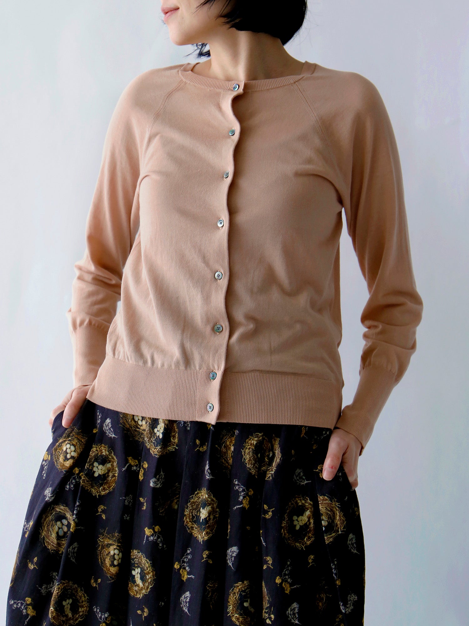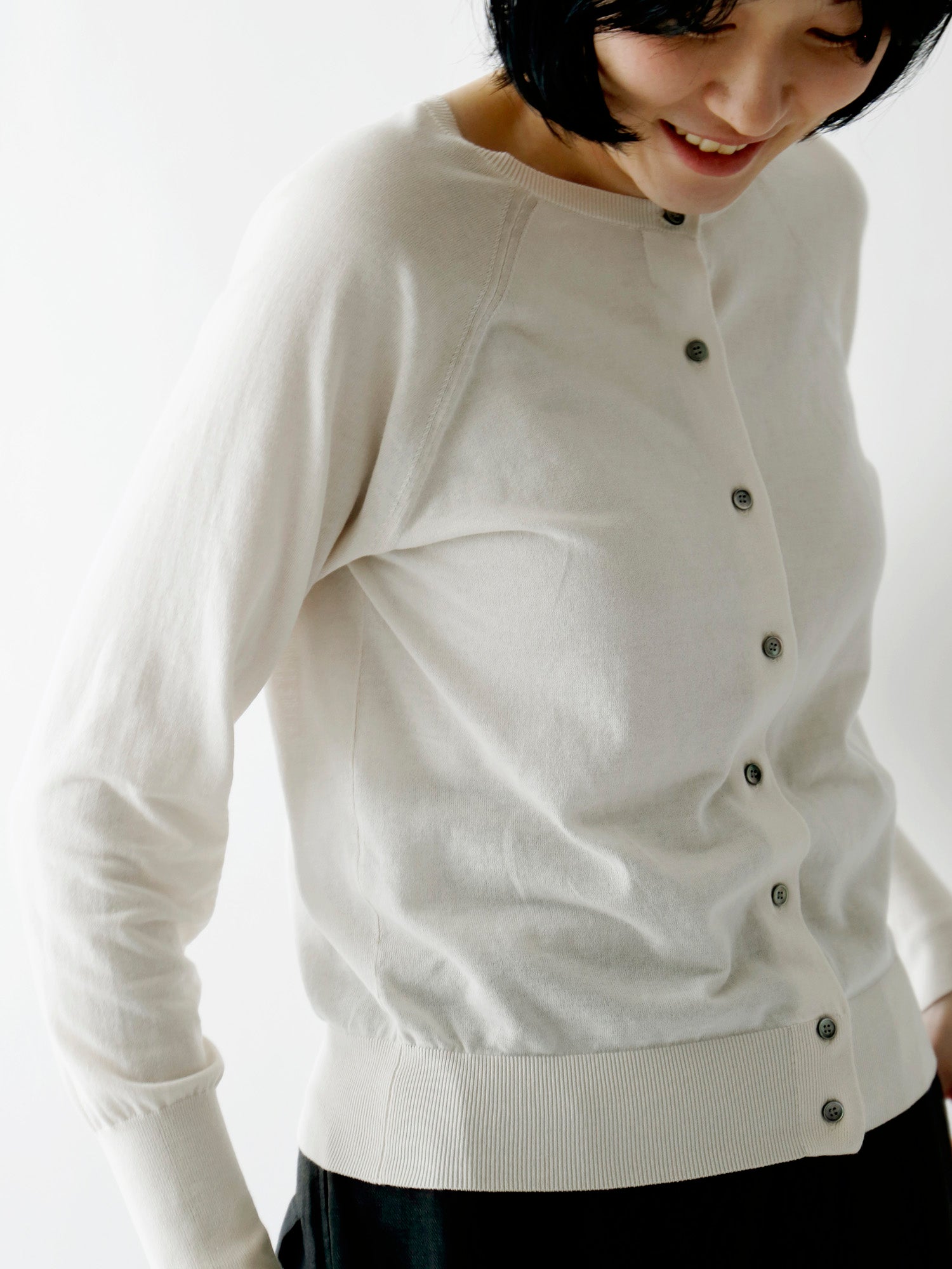 人気のひみつは一見どこにでもあるふつうのカーディガンに見えても、袖を通すとわかるシルエットの美しさとバランスのよさ。