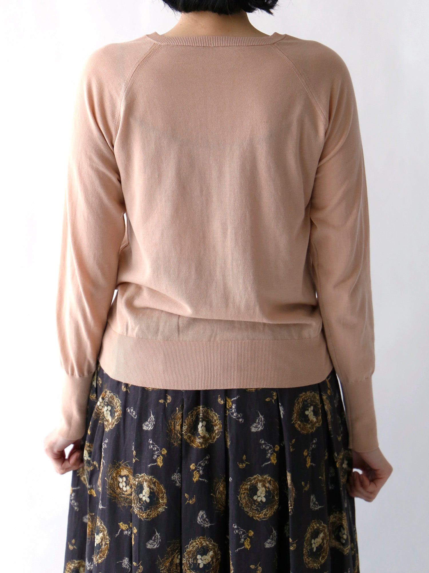 リブ部分は身体に沿うようフィット感を出すため伸縮糸を引き揃えて編み、ボディ部分はほどよくゆとりを持たせています。