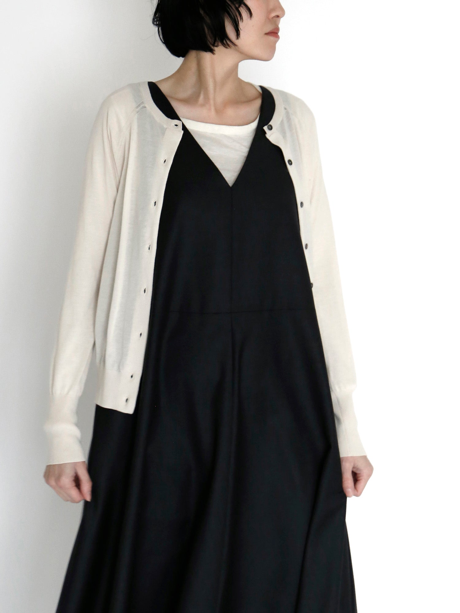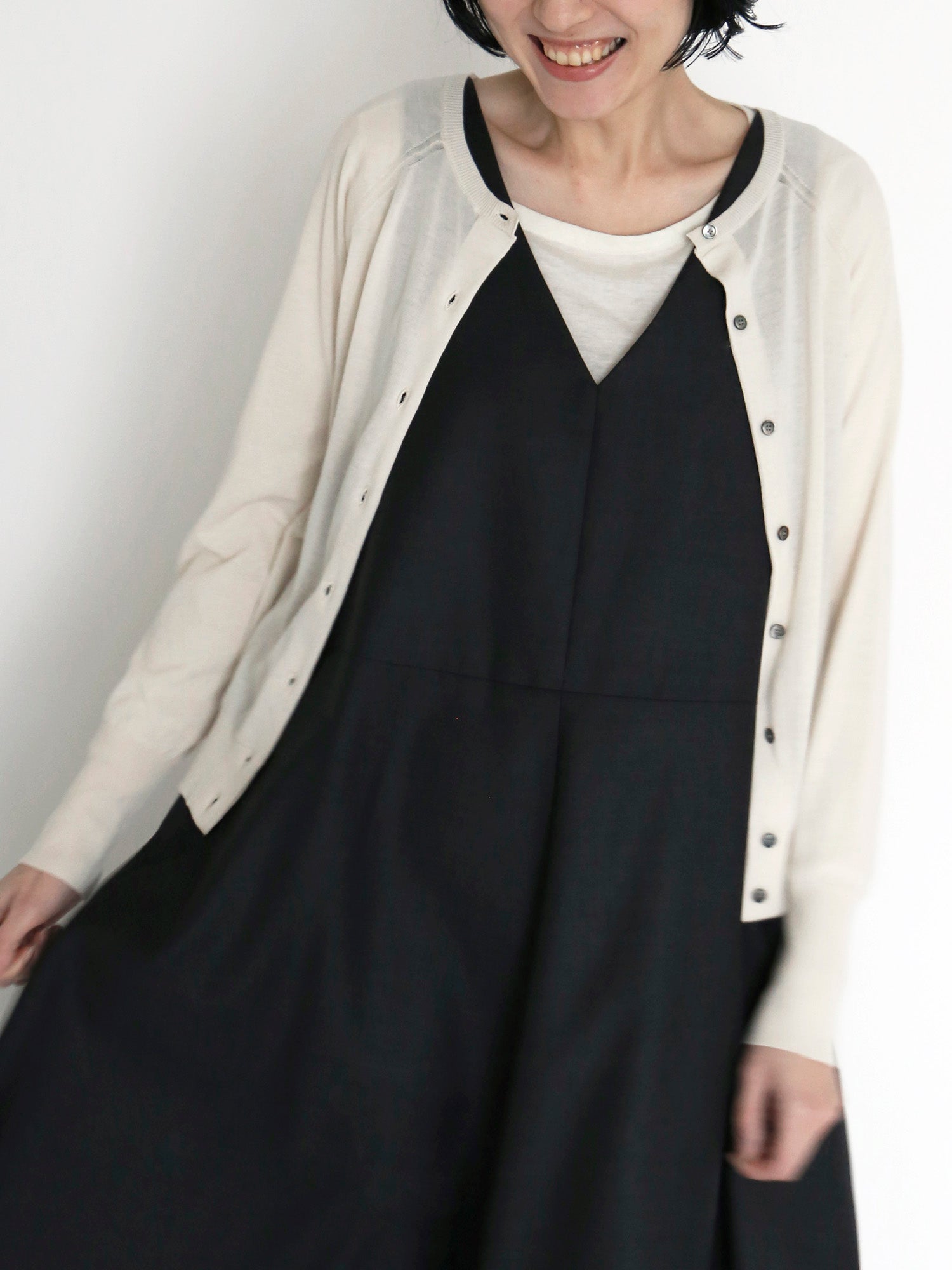 二の腕をカバーしてくれる薄手のカーディガンは春夏には欠かせないアイテム。ジャンパースカートとも好相性です。