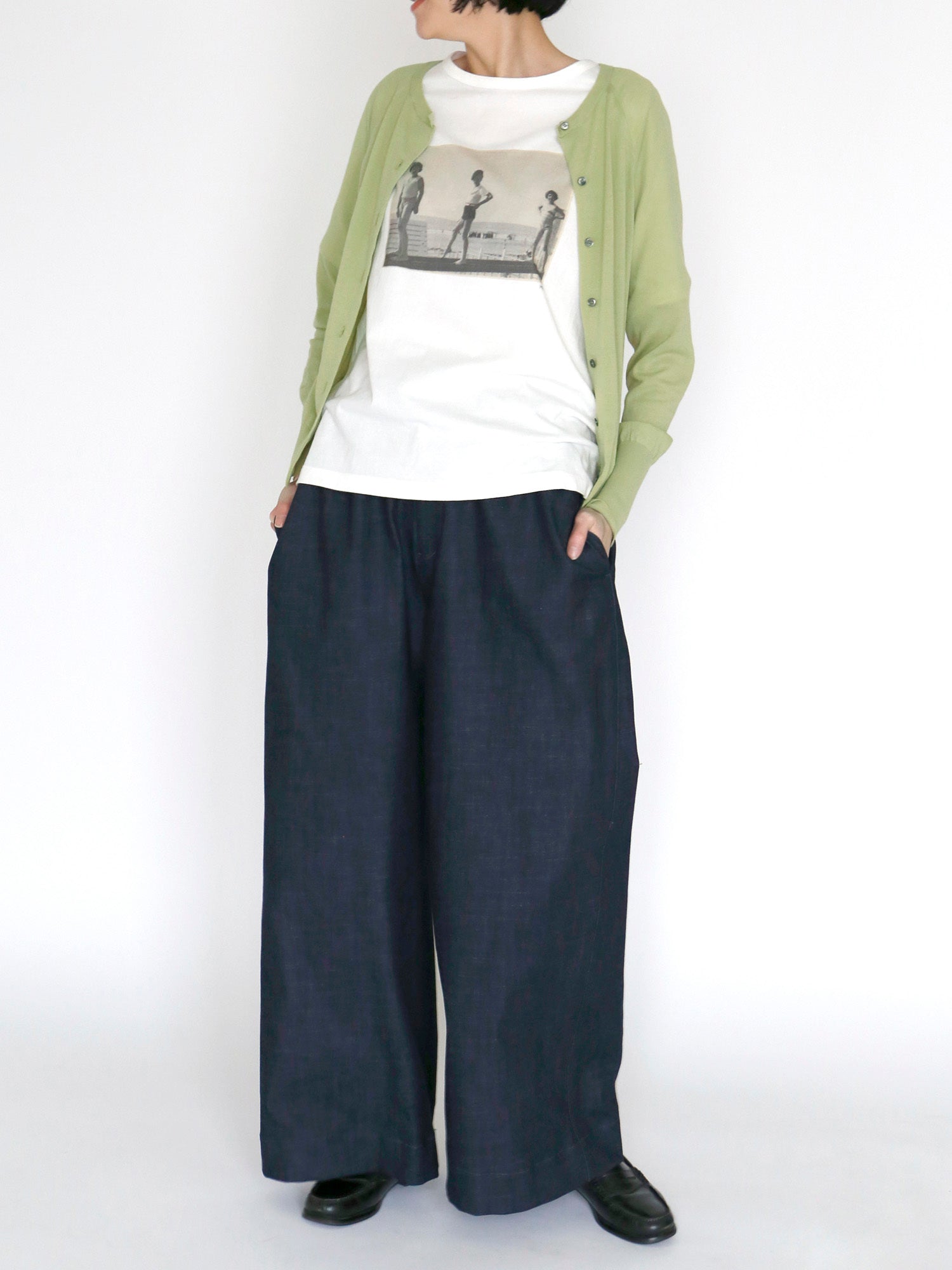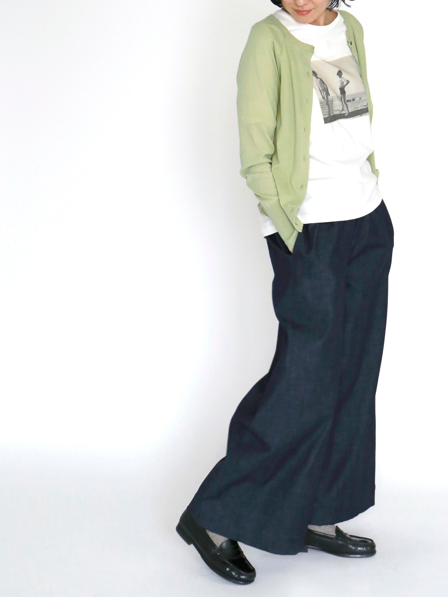 白いTシャツとデニムで軽やかな装いに。春色のカーディガンがそっと彩りを添え、コーディネート全体を引き立てます。