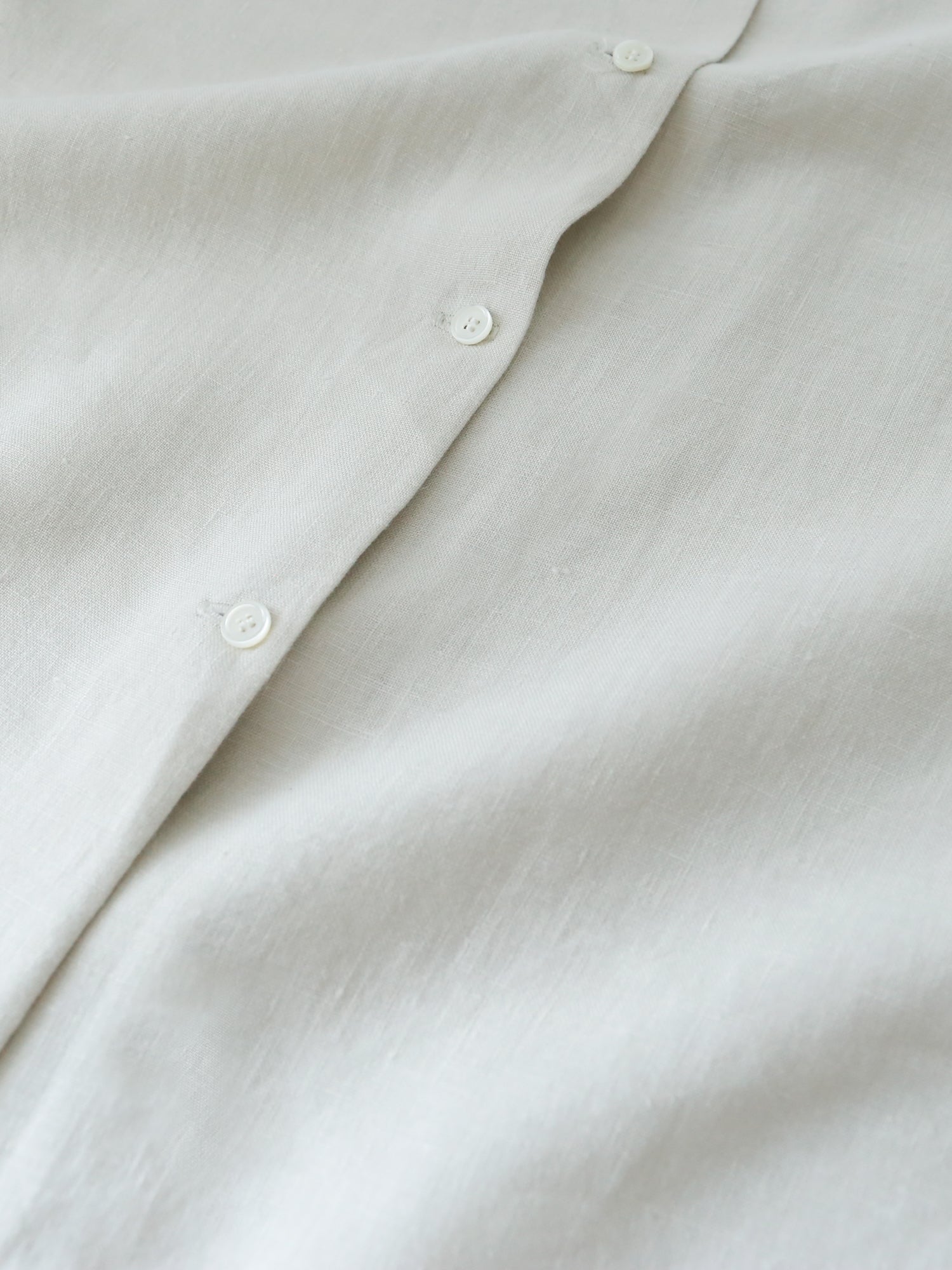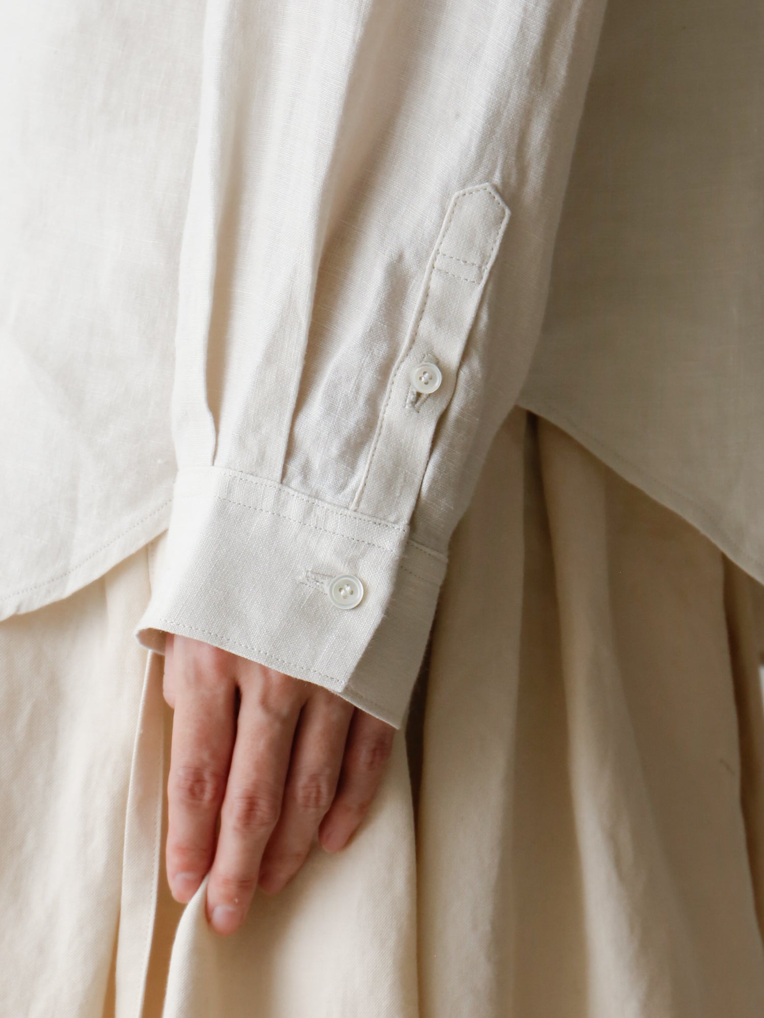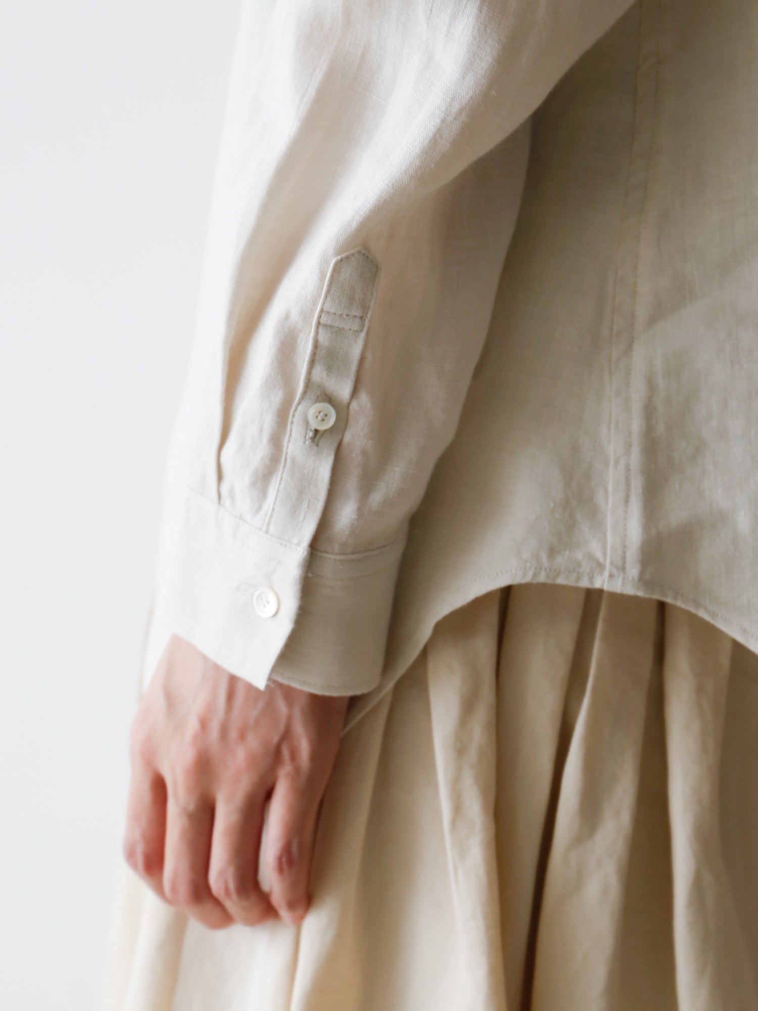 素材はリネン100%。1858年創業の老舗リネンウィーバー、リベコ・ラガエ社のベルギーリネンを使用しています。ほんのり生成りがかった色味で、普段の装いに自然と馴染みます。