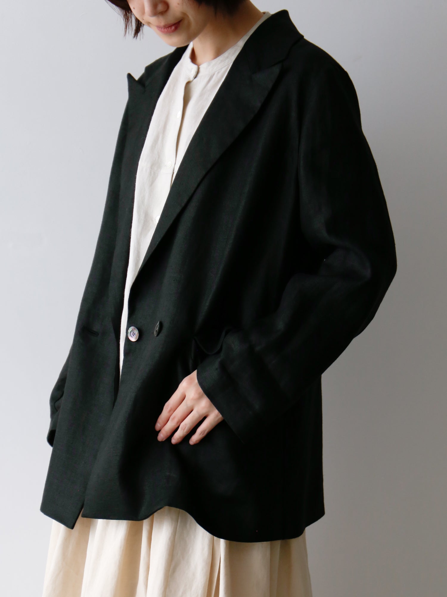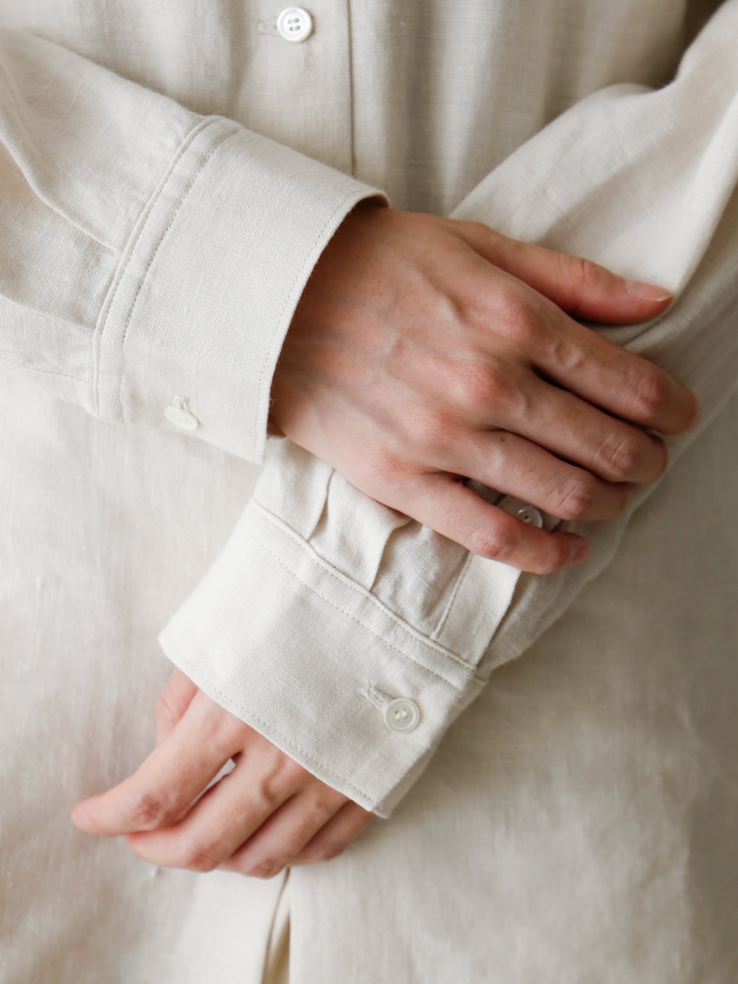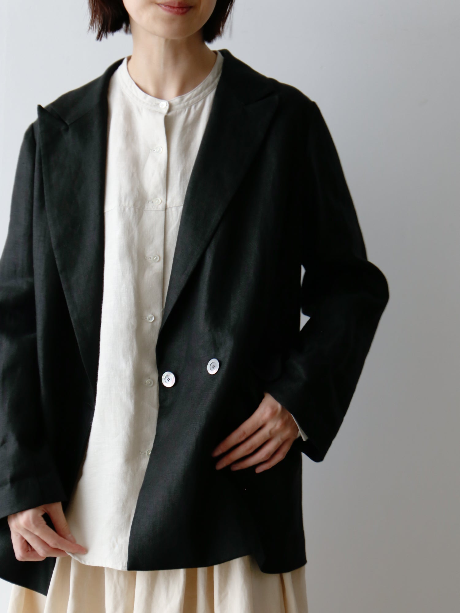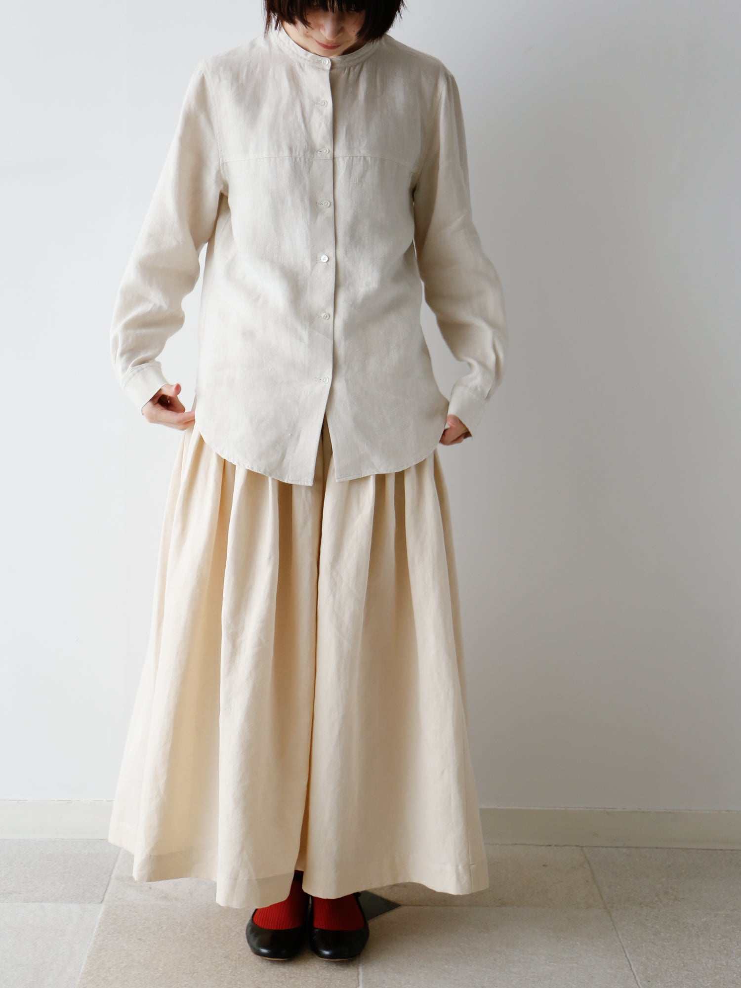 素材はリネン100%。1858年創業の老舗リネンウィーバー、リベコ・ラガエ社のベルギーリネンを使用しています。ほんのり生成りがかった色味で、普段の装いに自然と馴染みます。