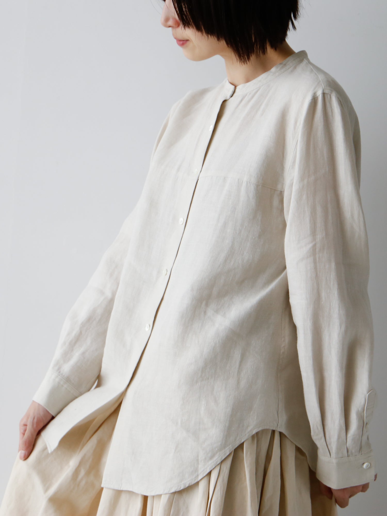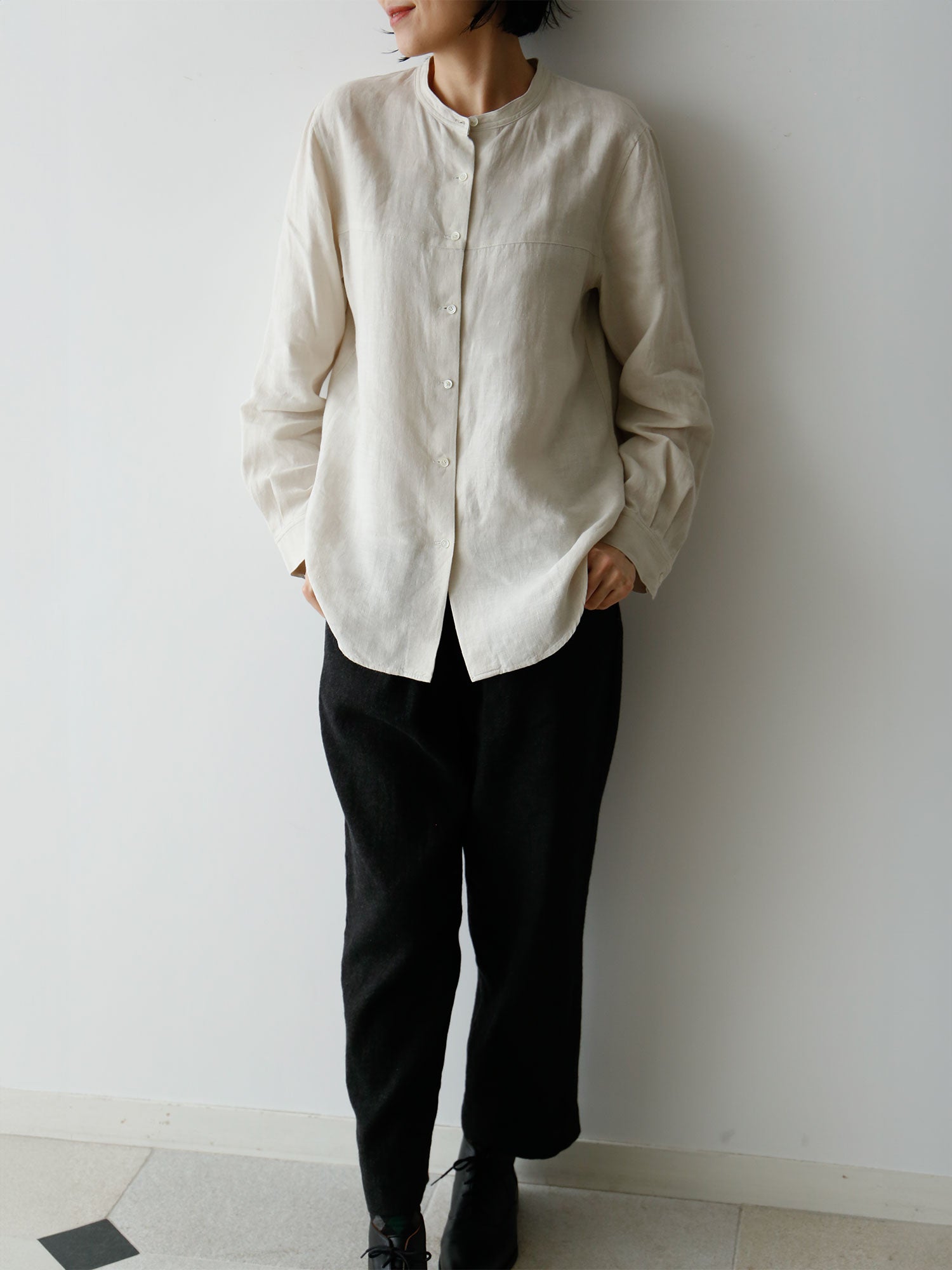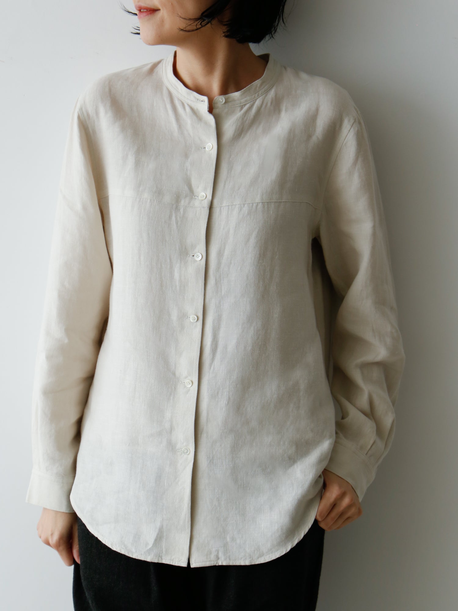 装いの基本アイテム、書生風リネンシャツ