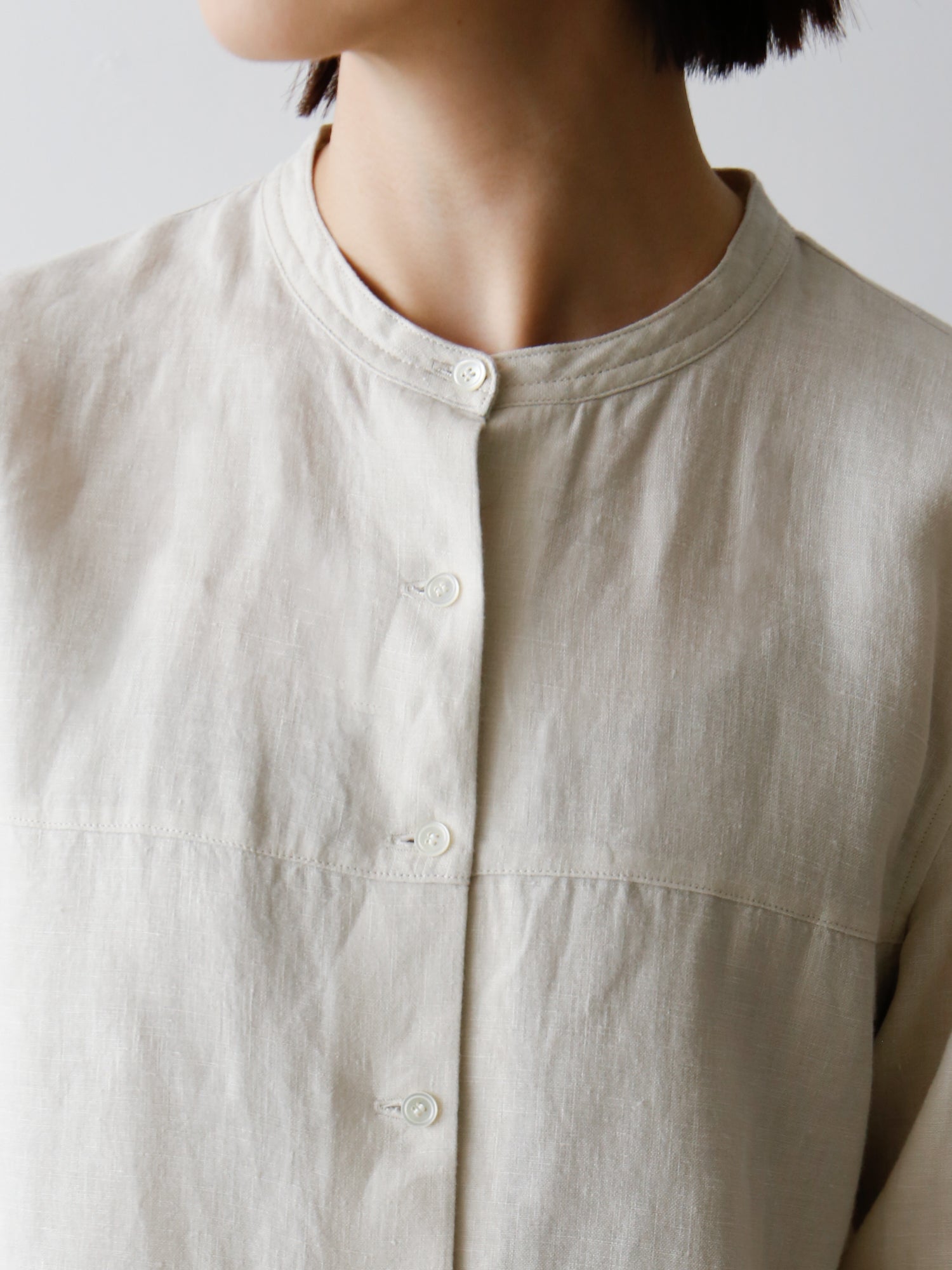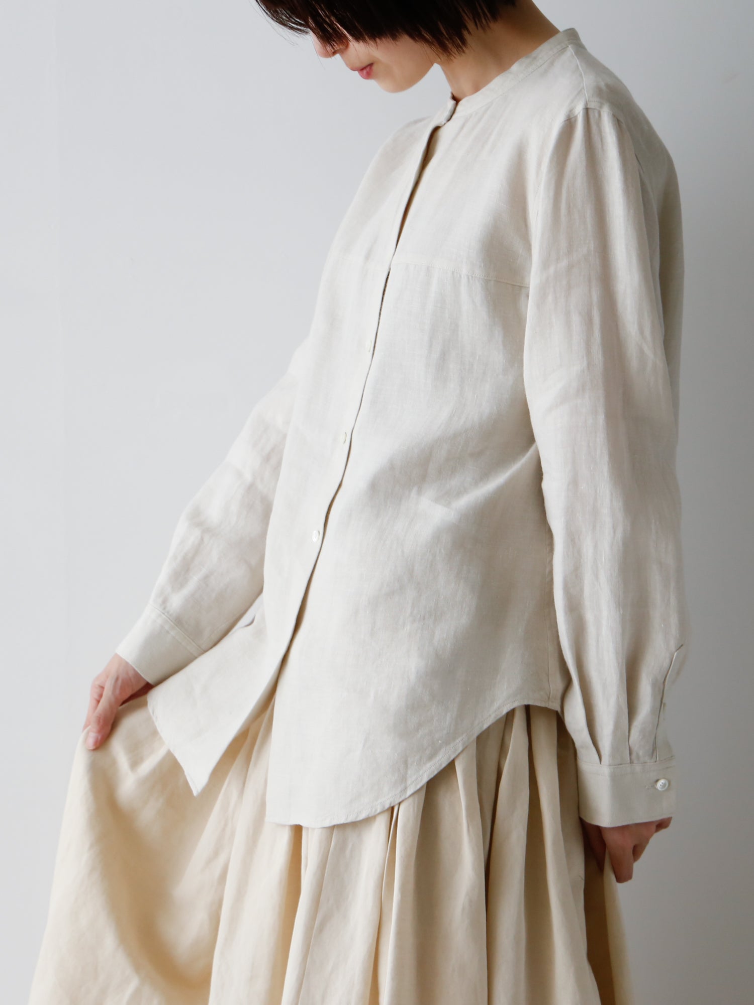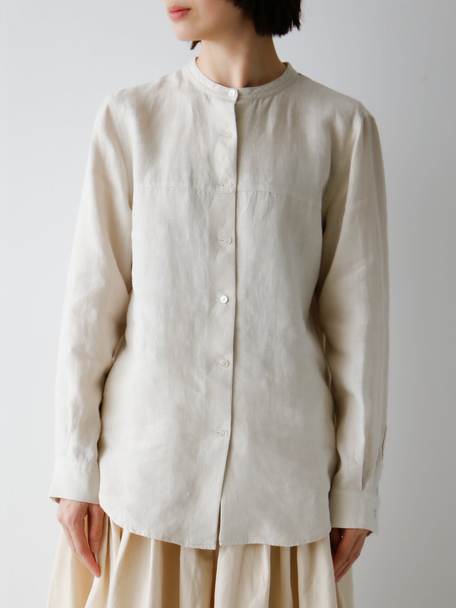 装いの基本アイテム、書生風リネンシャツ