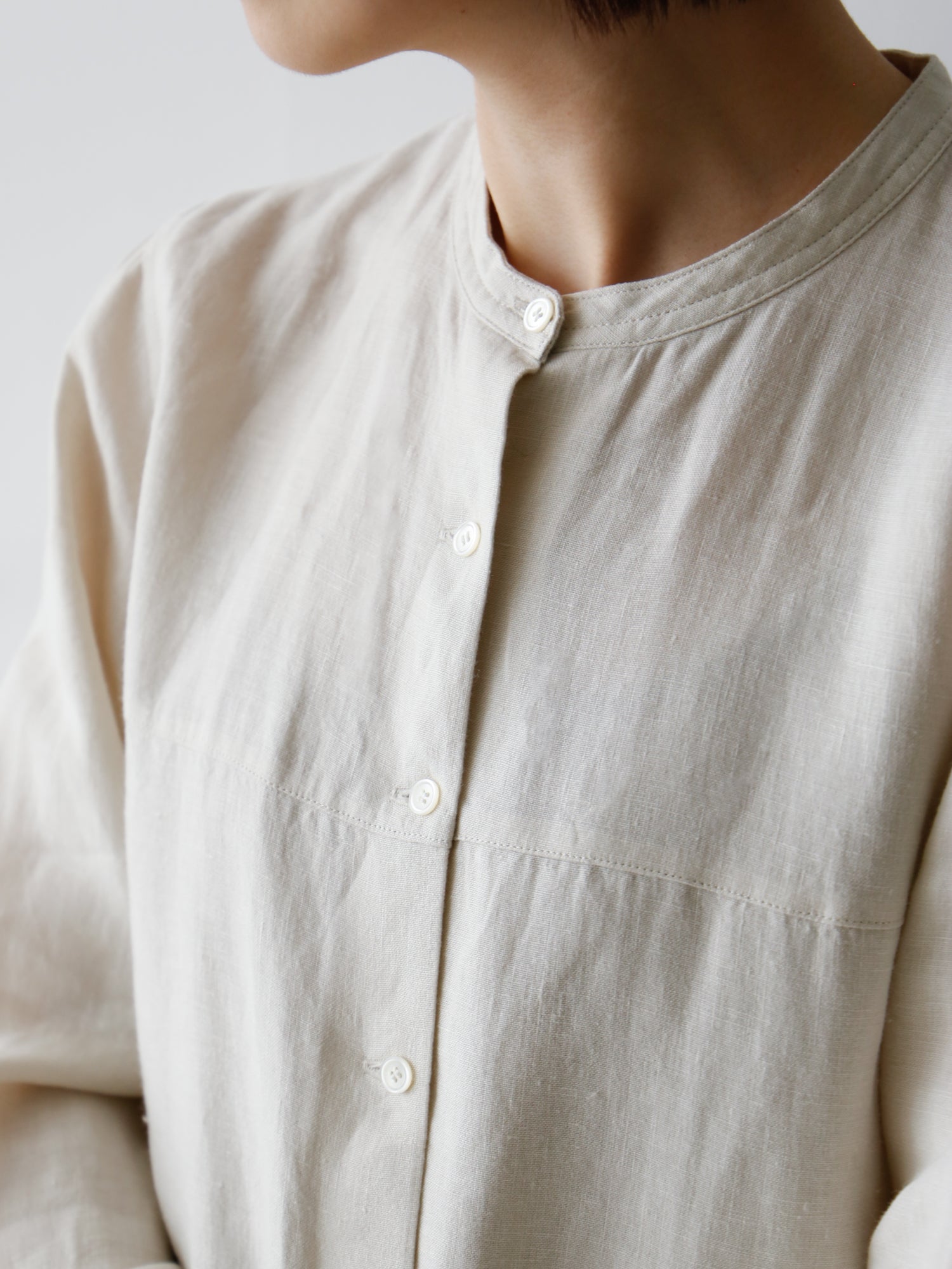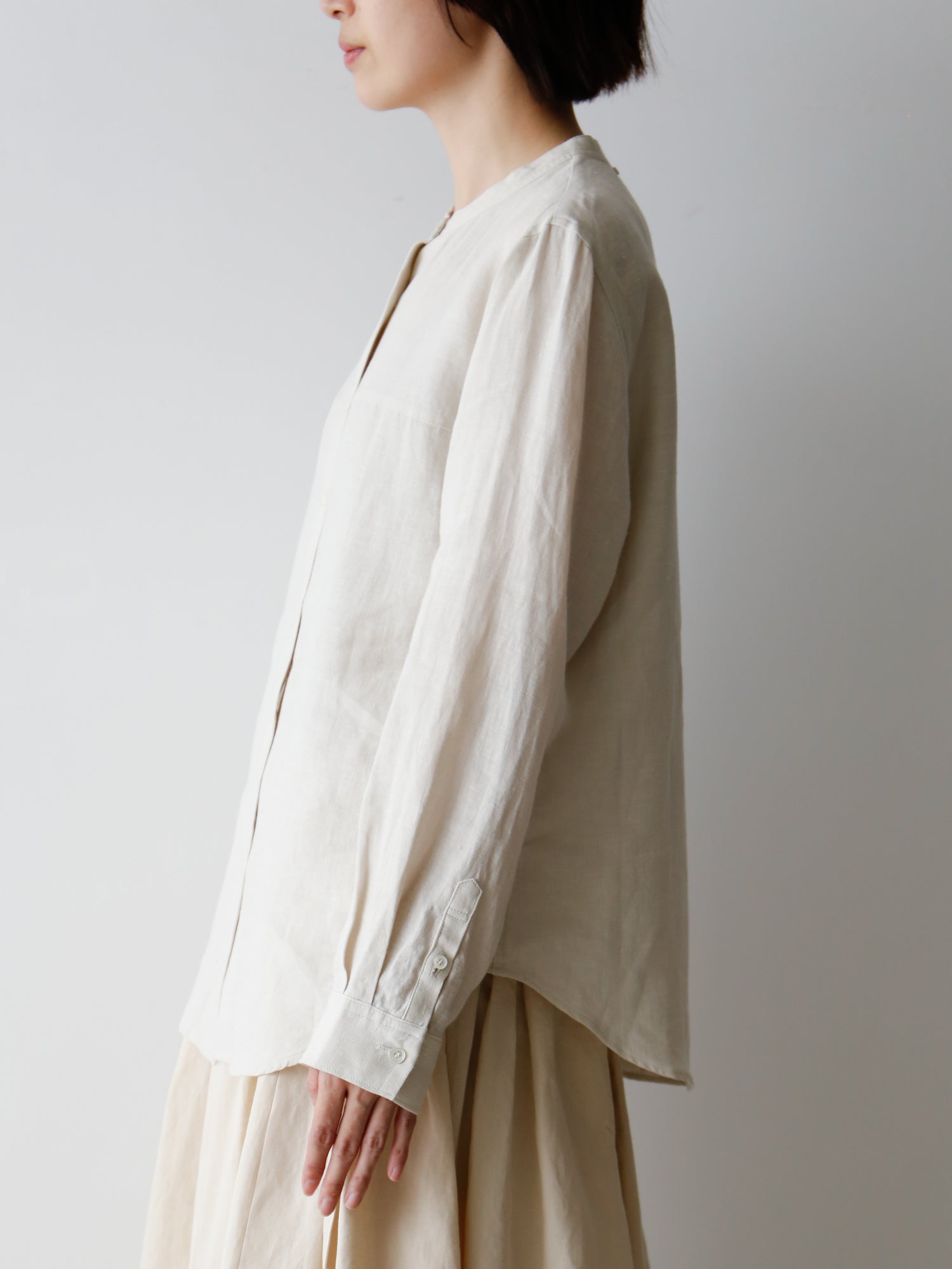 女性がすっきりと着られるスタンドカラーのシャツ「ボドワン」が素材を変えて入荷しました。素材はリネンでリゼッタらしく、アウターに響かないから着回しのきく一枚です。