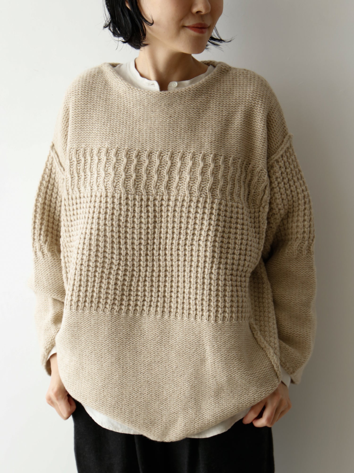 ニットやベストを重ねたときに裾がきれいにでるように、丸みをもたせました。