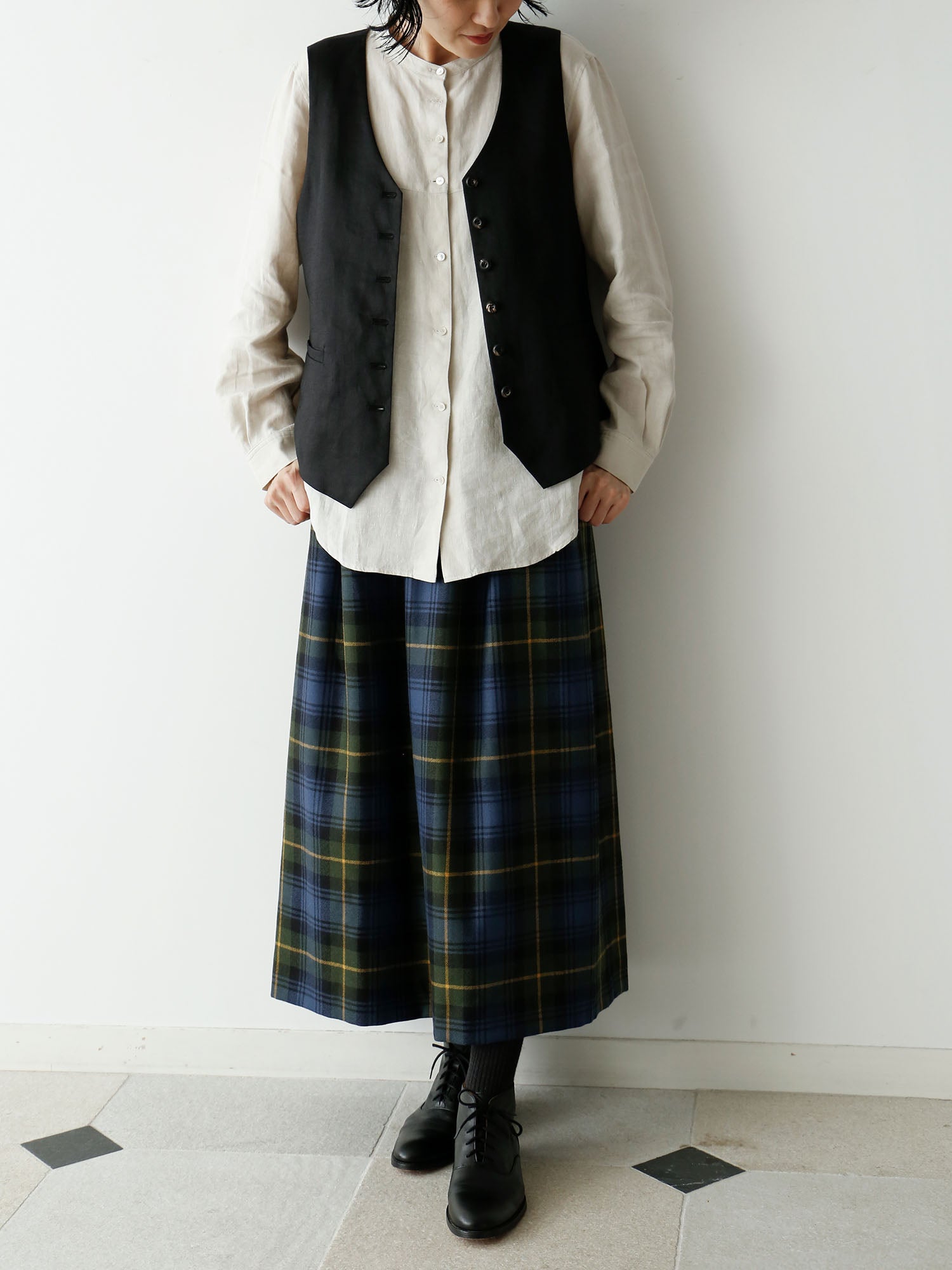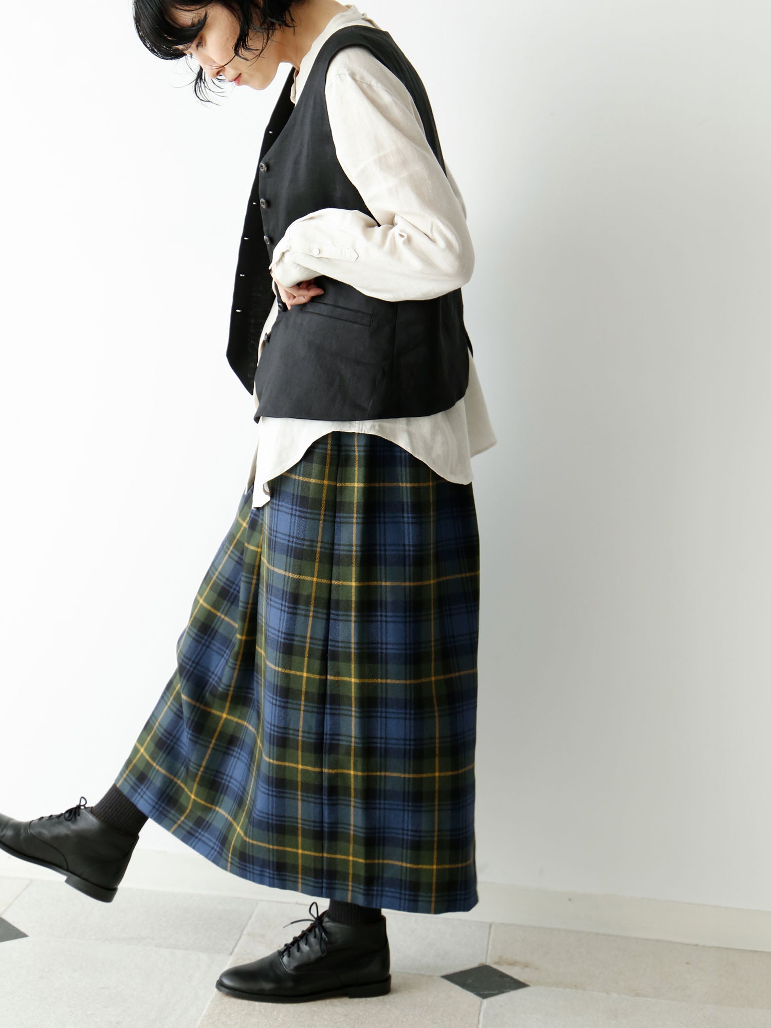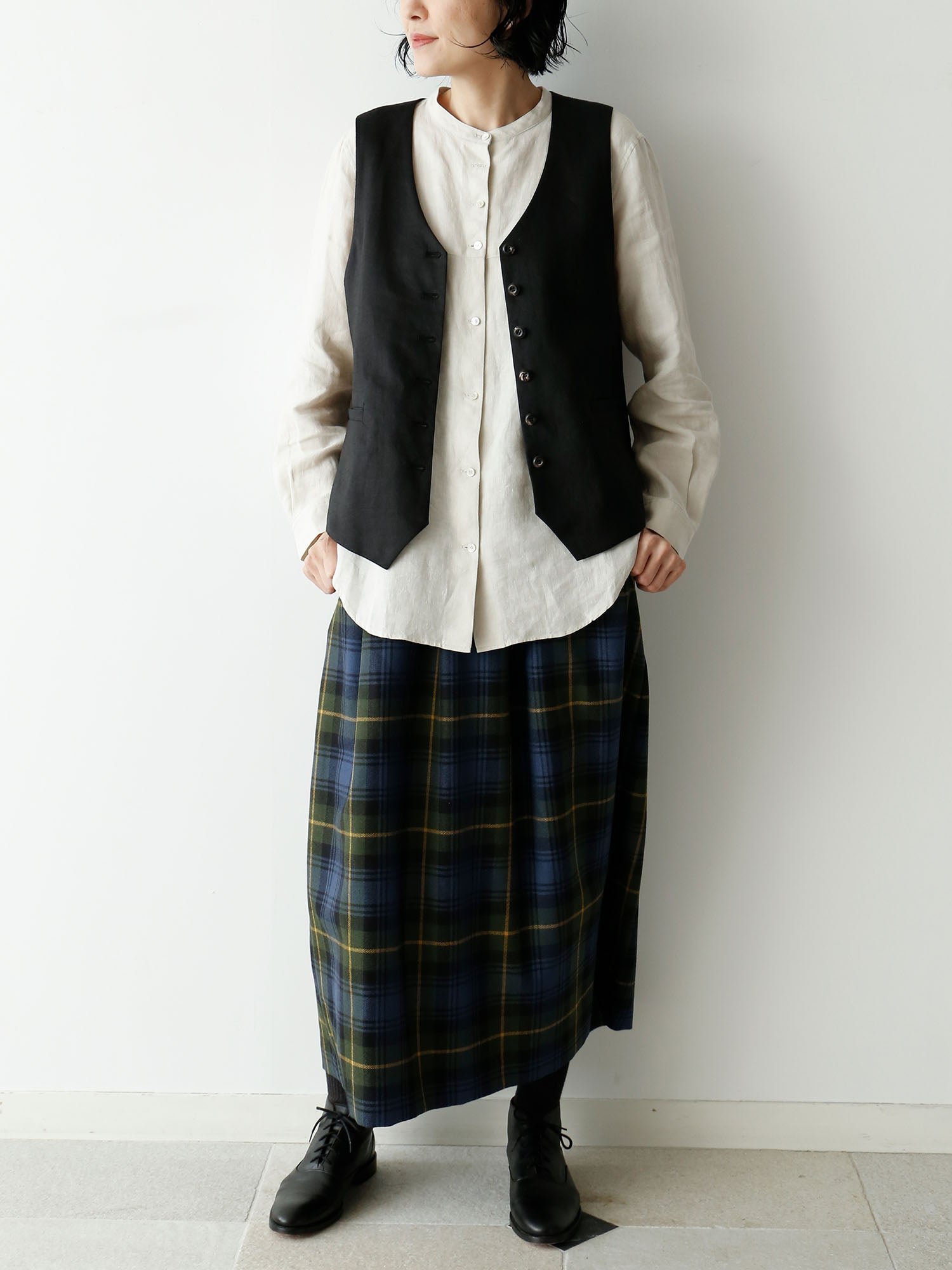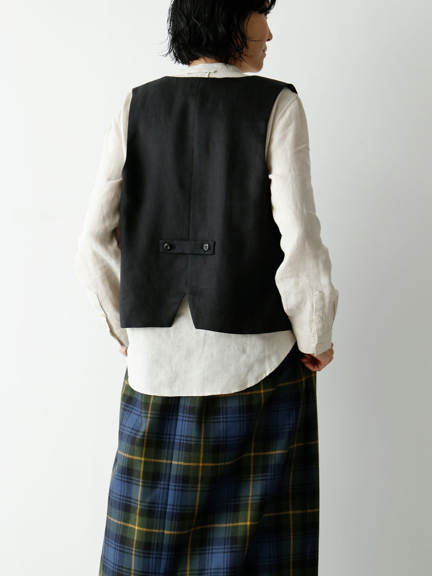 ベストを羽織ってみました。ちらりと見えるラウンドの裾がポイントに。