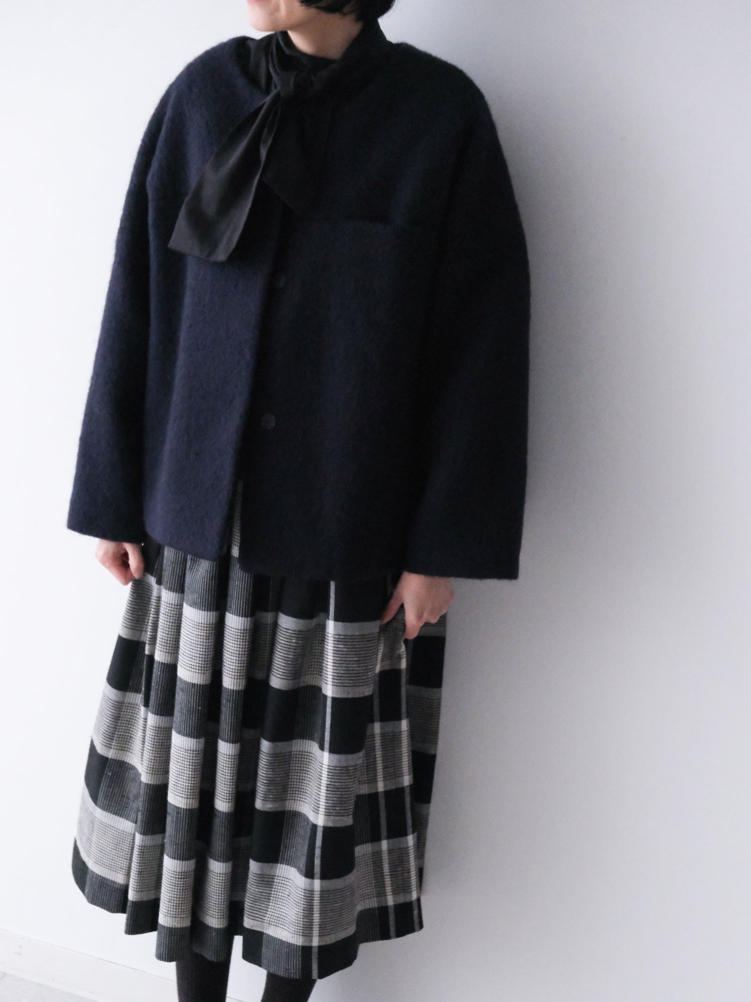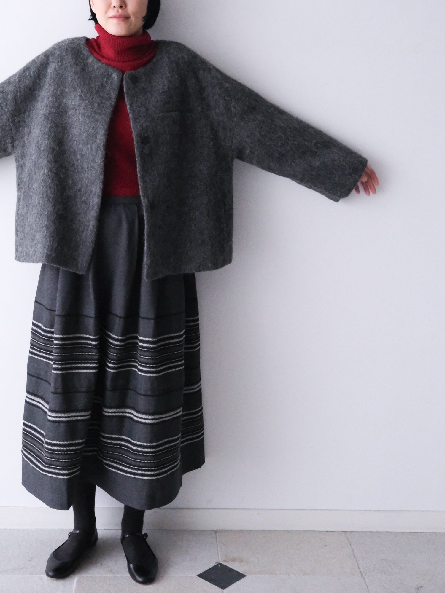 トップスのおしゃれを楽しめる、軽くてシンプルなノーカラーのショートコート。スカート、パンツ、ワンピース、それぞれのバランスをご紹介します。
