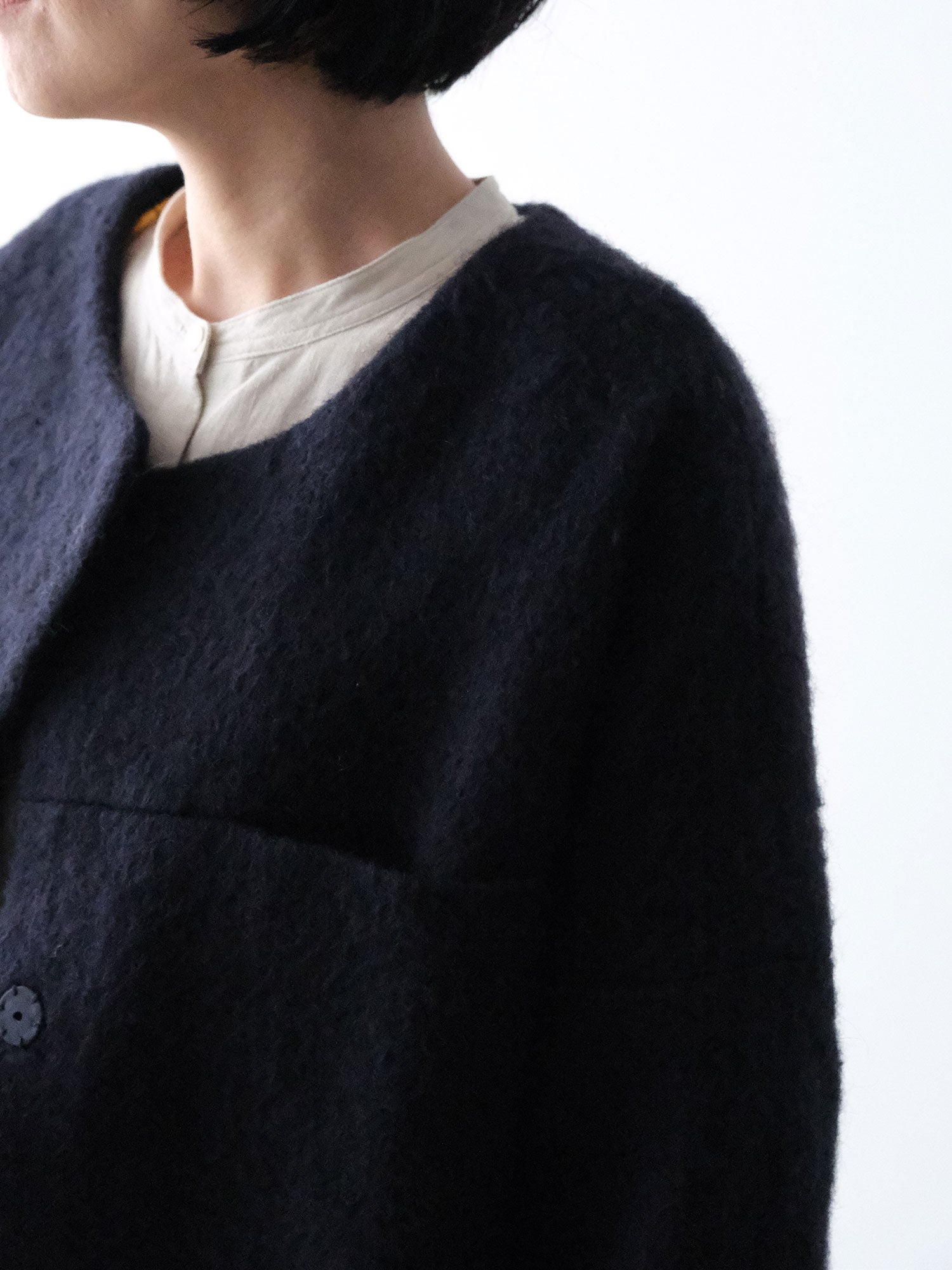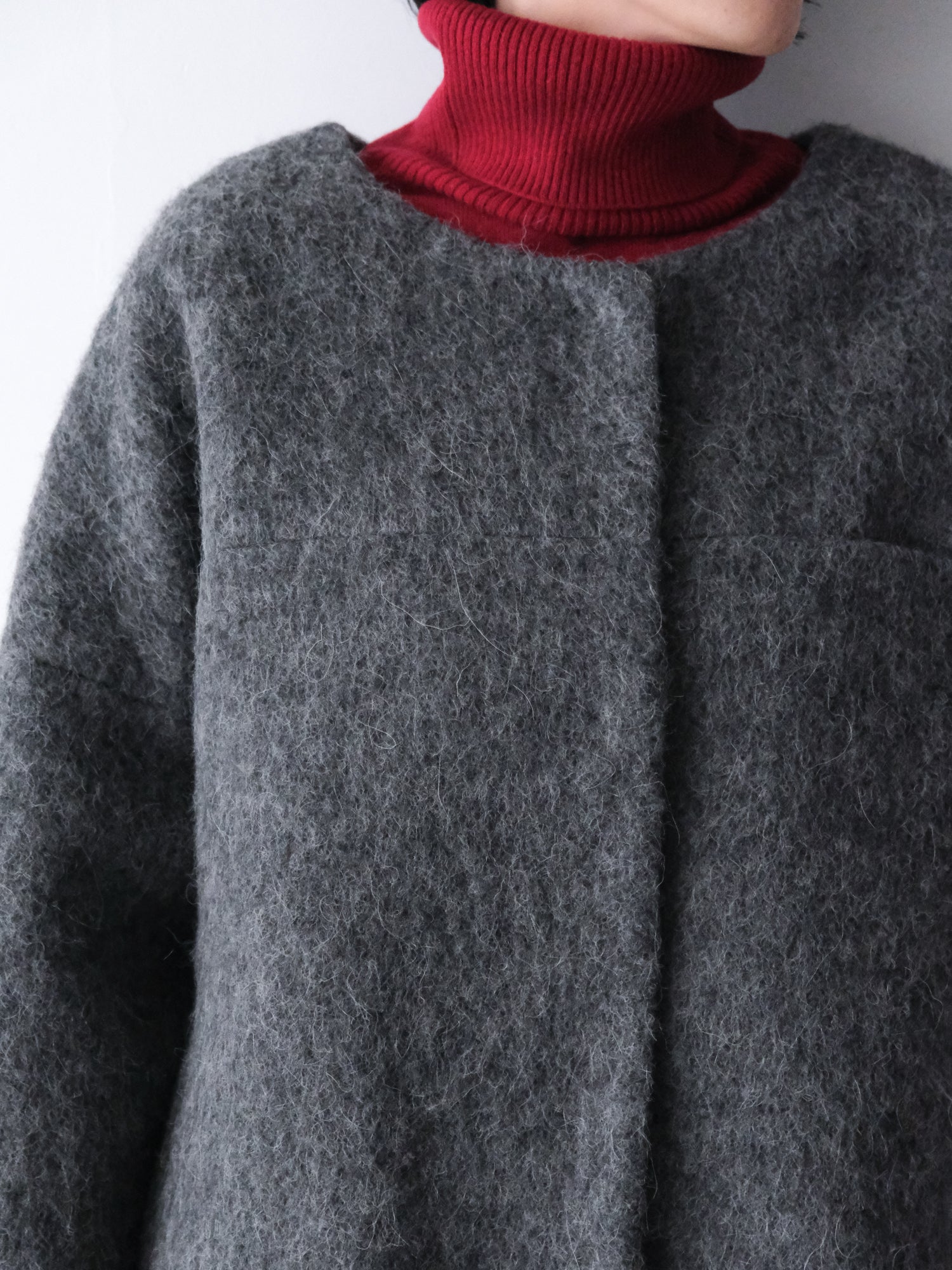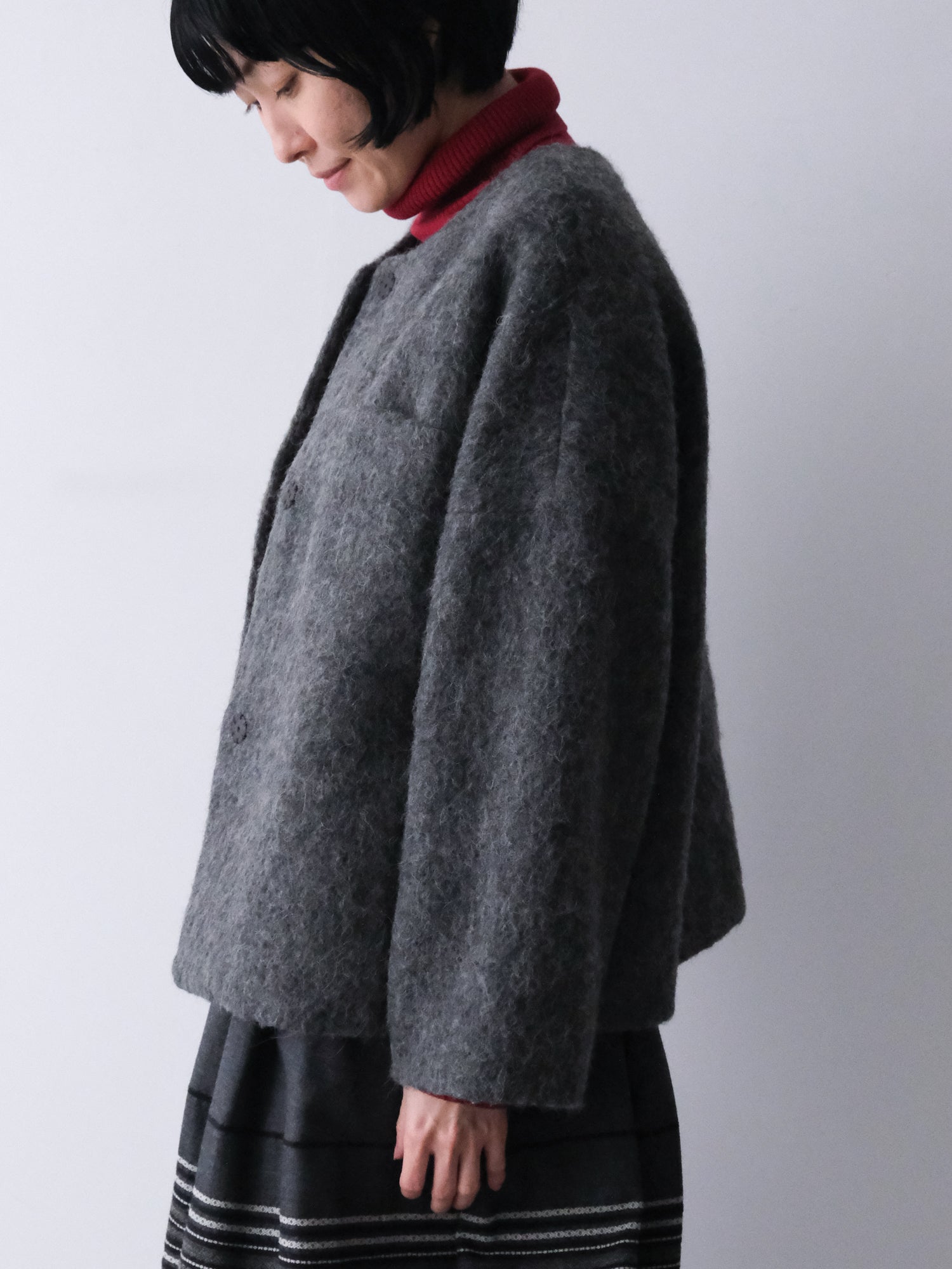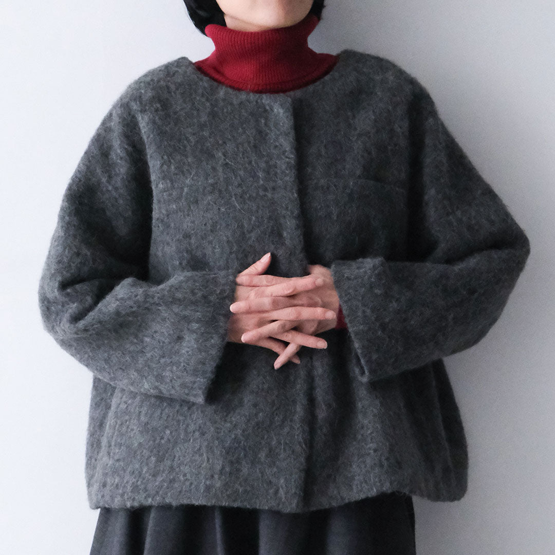表情豊かな毛足が魅力のシャギーなウール地で仕立てた、ノーカラーのショートコート。薄い中綿入りキルトの裏地であたたかく、軽い着心地です。