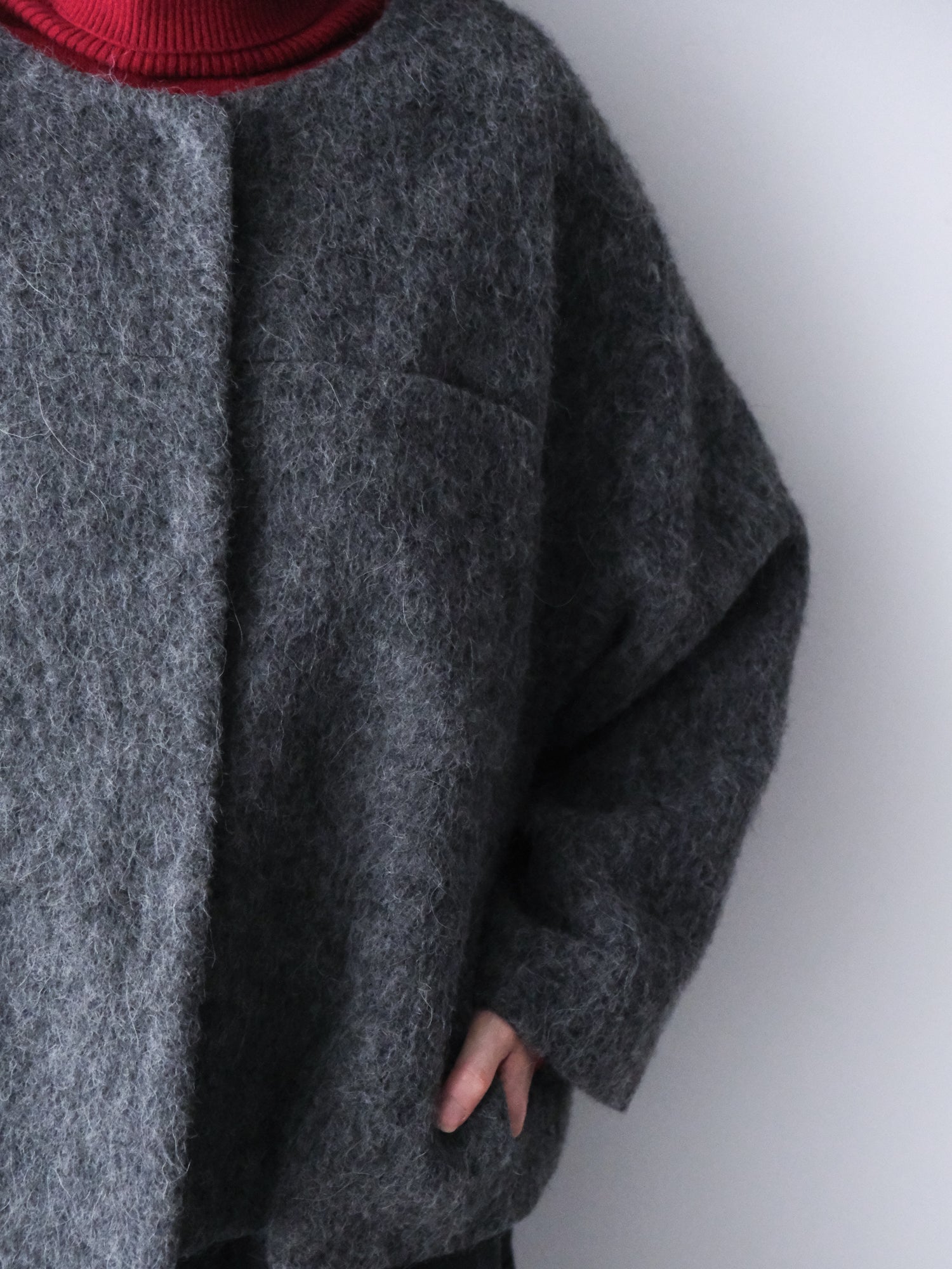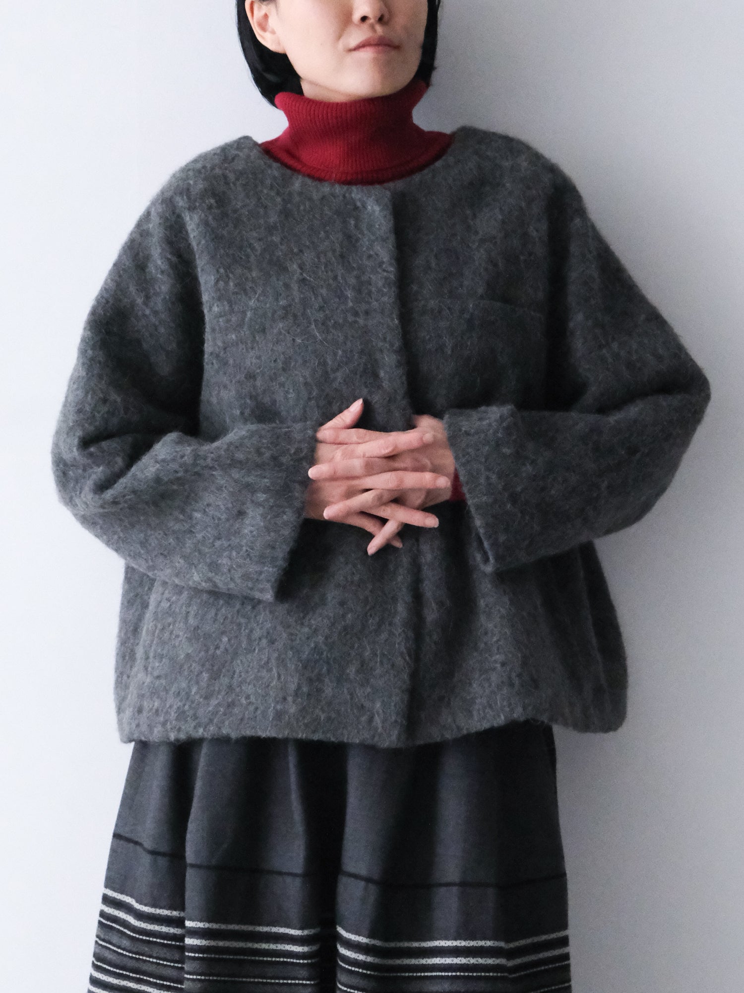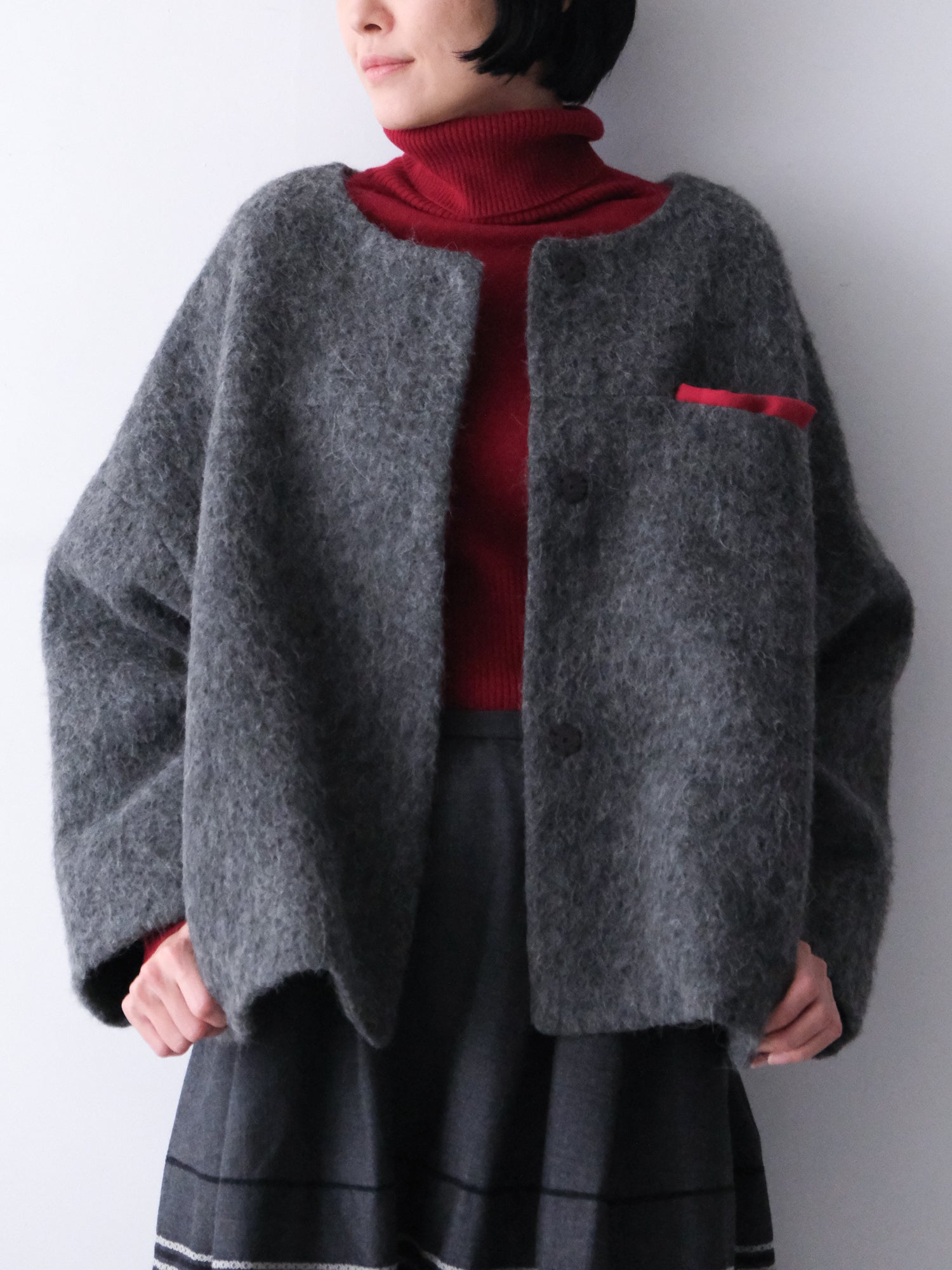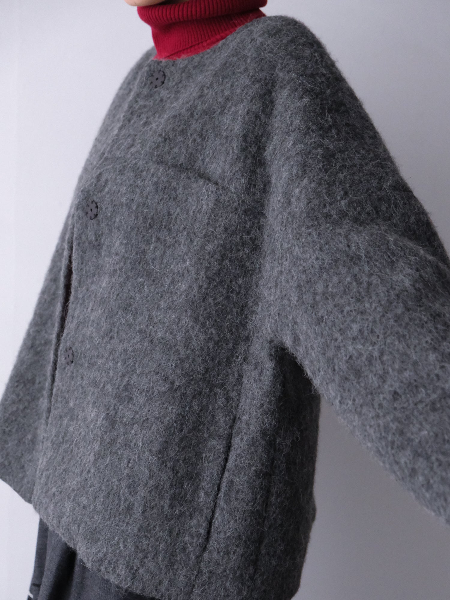 表情豊かな毛足が魅力のシャギーなウール地で仕立てた、ノーカラーのショートコート。薄い中綿入りキルトの裏地であたたかく、軽い着心地です。